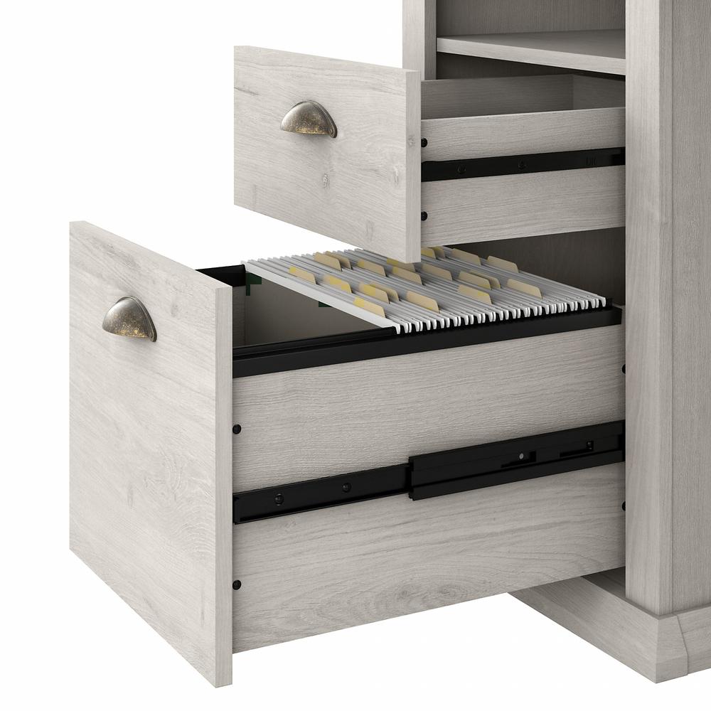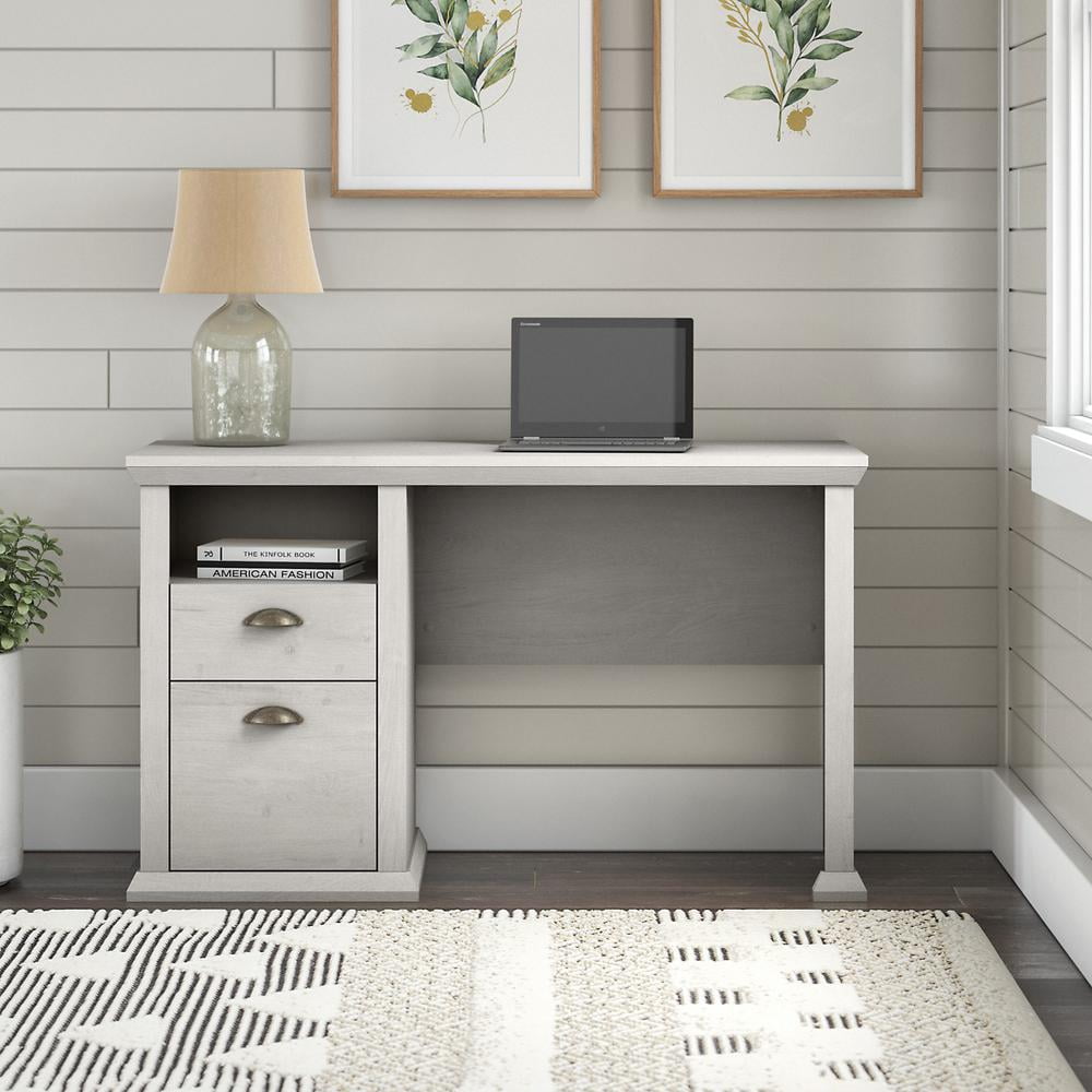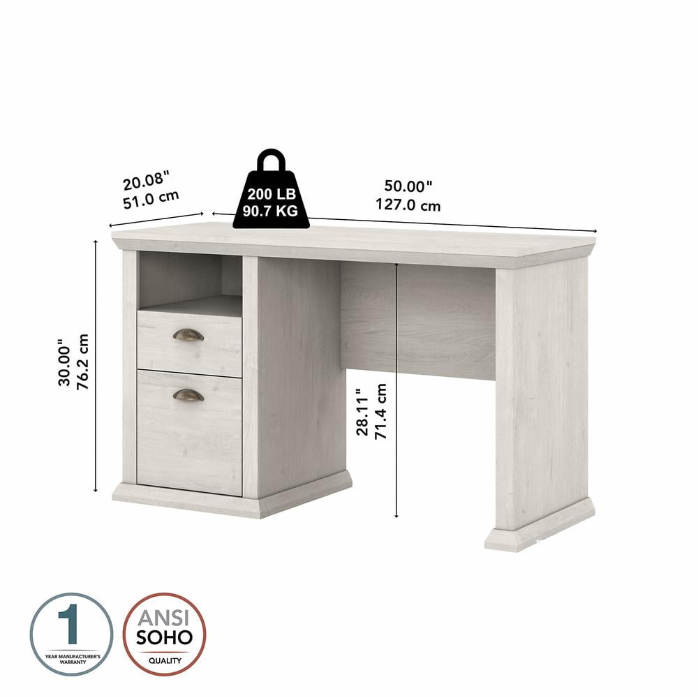 50W x 20D x 30H Home Office Desk provides ample room to spread out with materials without taking up too much floor space Durable desktop supports a computer, paperwork and more with a weight capacity of 200 pounds Built-in file drawer opens on smooth full-extension ball bearing slides for an easy reach to letter-size documents Box drawer organizes writing utensils, notepads and other miscellaneous office supplies Open cubby shelf ensures that work-in-progress and frequently used materials are easily accessible Height and depth match the Yorktown Lateral File Cabinet (sold separately) for an extended work surface when placed side by side Available in your choice of Antique Cherry, Linen White Oak, Reclaimed Pine and Restored Gray finishes Tested to meet ANSI/SOHO quality standards for safety and performance Backed by the Bush Furniture 1 Year Manufacturer’s Warranty Coordinating items include an Office Chair, 5 Shelf Bookcase, Lateral File Cabinet and Desktop Organizers (sold separately)