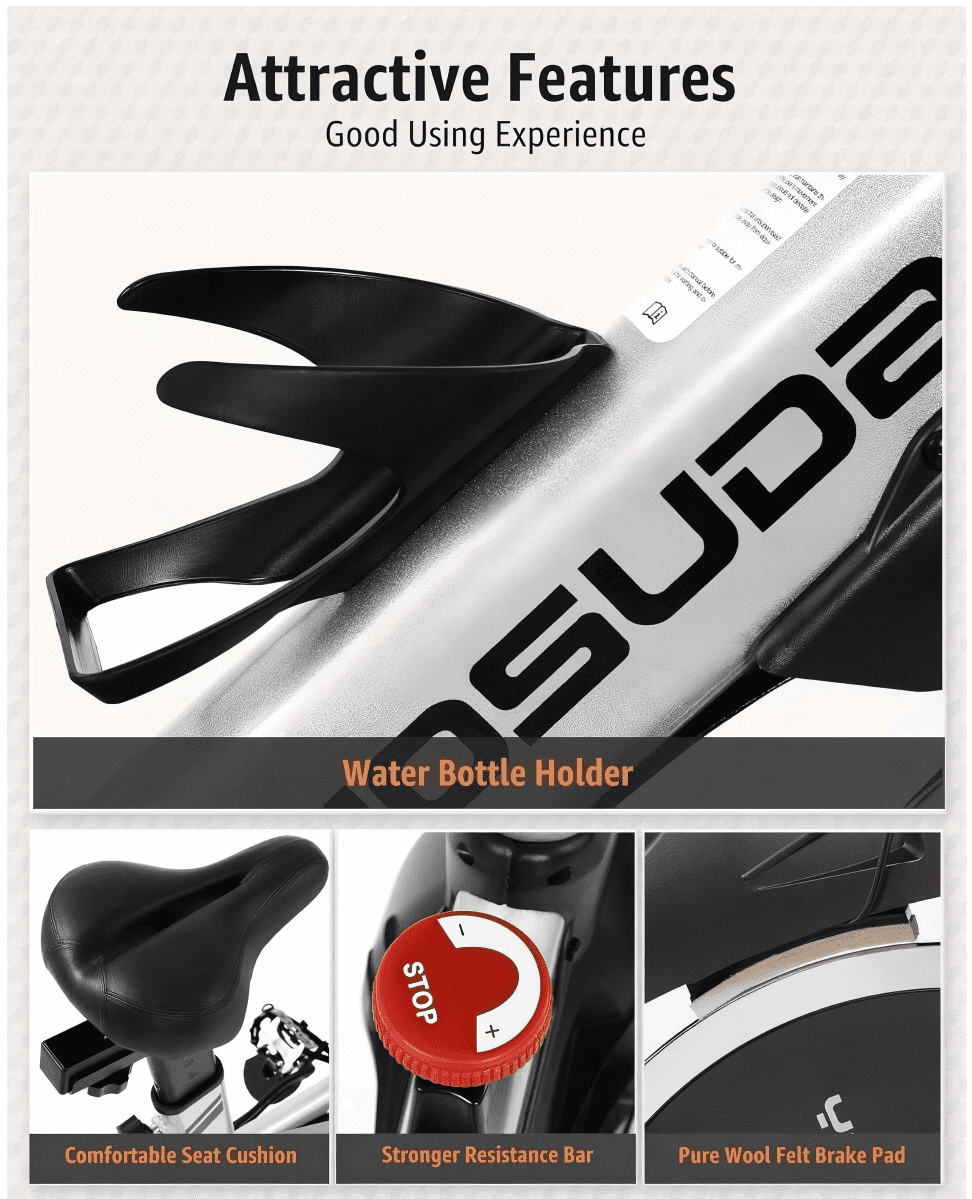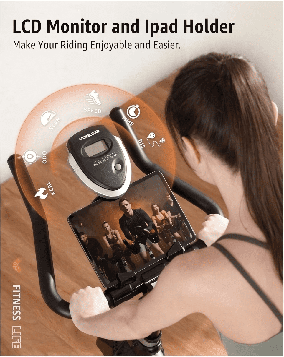 helps simulate the ride of a real road bike. The momentum of a heavier flywheel keeps the bike steady and securely riding. Let you enjoy the outdoor sports experience at home and perform intense aerobic exercise in a stable position. The maximum of YOSUDA indoor cycling bike can support, do not worry about instability. Adjustable Resistance:Continuous infinite resistance adjustment allows you to adjust resistance freely during riding, simulating real road riding. Since the flywheel is a freewheel, you will still take your feet for a while when you stop stepping. When you want to finish, pull the emergency brake lever and stop it immediately. Adjustable Seat:The seats are ergonomically designed. Size: 10 x 8.6 x 2.3 inch (L x W x H). It supports longer rides. The seat can be easily adjusted up and down, front and back. so that your family can enjoy home fitness. Digital Monitor YOSUDA cycling bike equips with an LCD monitor that displays your time, speed, distance, calories burned, and odometer. These computer calculations and readings are a hugely beneficial way to keep track of your progress. At the same time, we also provide a free flat bracket so that you can watch videos or listen to music with an iPhone while exercising.