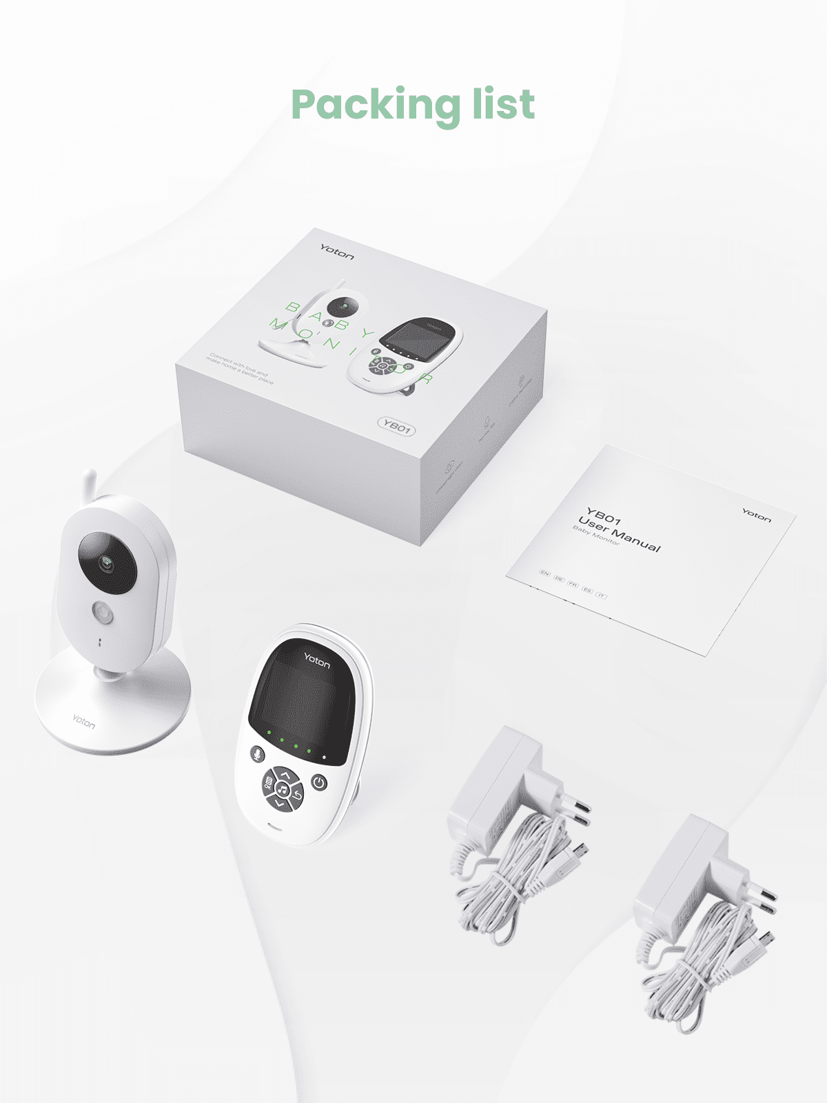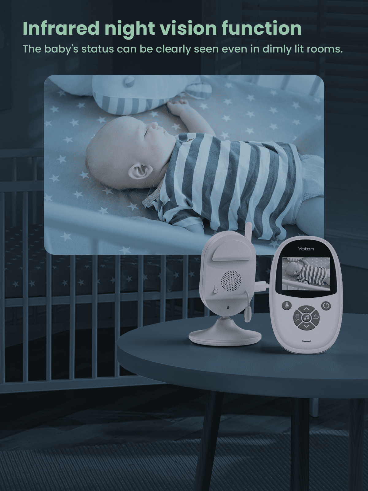 Video Baby Monitor adopts high-quality baby monitoring technology, offering our parents peace of mind and an enjoyable user experience. Movable and Portable Unit: You can take the portable parent unit with you within the range of monitoring, allowing you to hear, see or talk to your baby at any time. Two-Way Talkback Function: When your baby is uncomfortable or crying, you can comfort him or her with the sound of your own voice by using the two-way talkback function. Auto Infrared Night Vision Function: Knowing your baby is good or not at the night, even in the darkness. Temperature Monitoring Function: Smart monitoring of the temperature allows you to create a safe and comfortable environment for your baby. VOX/ECO Mode: The screen will auto wake up to remind you that your baby is uncomfortable, while at other times will stay on a black screen. So, it extends the time of working to some degree.