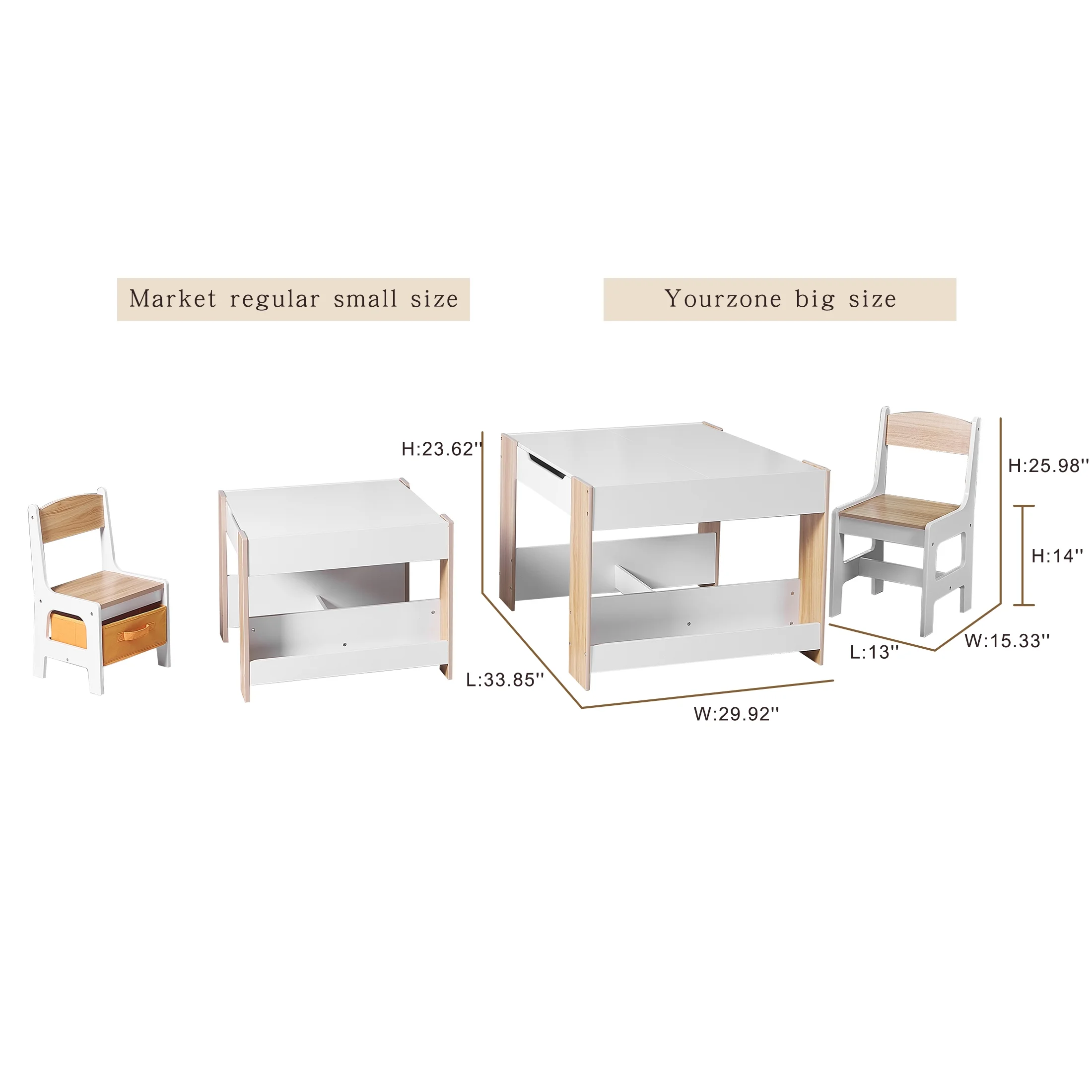 The Your Zone Activity Storage Table and Chair White Age 3+ is a delightfully designed table that your kids will love. This smartly crafted storage table features a whiteboard on one side that flips over to reveal a blackboard on the other. The storage are perfect for writing and drawing materials, papers, arts and crafts supplies, toys, and more. The table is bigger than you think,pls read the size carefully.I believe that your kids will have a good time with the Yourzone table and chair.