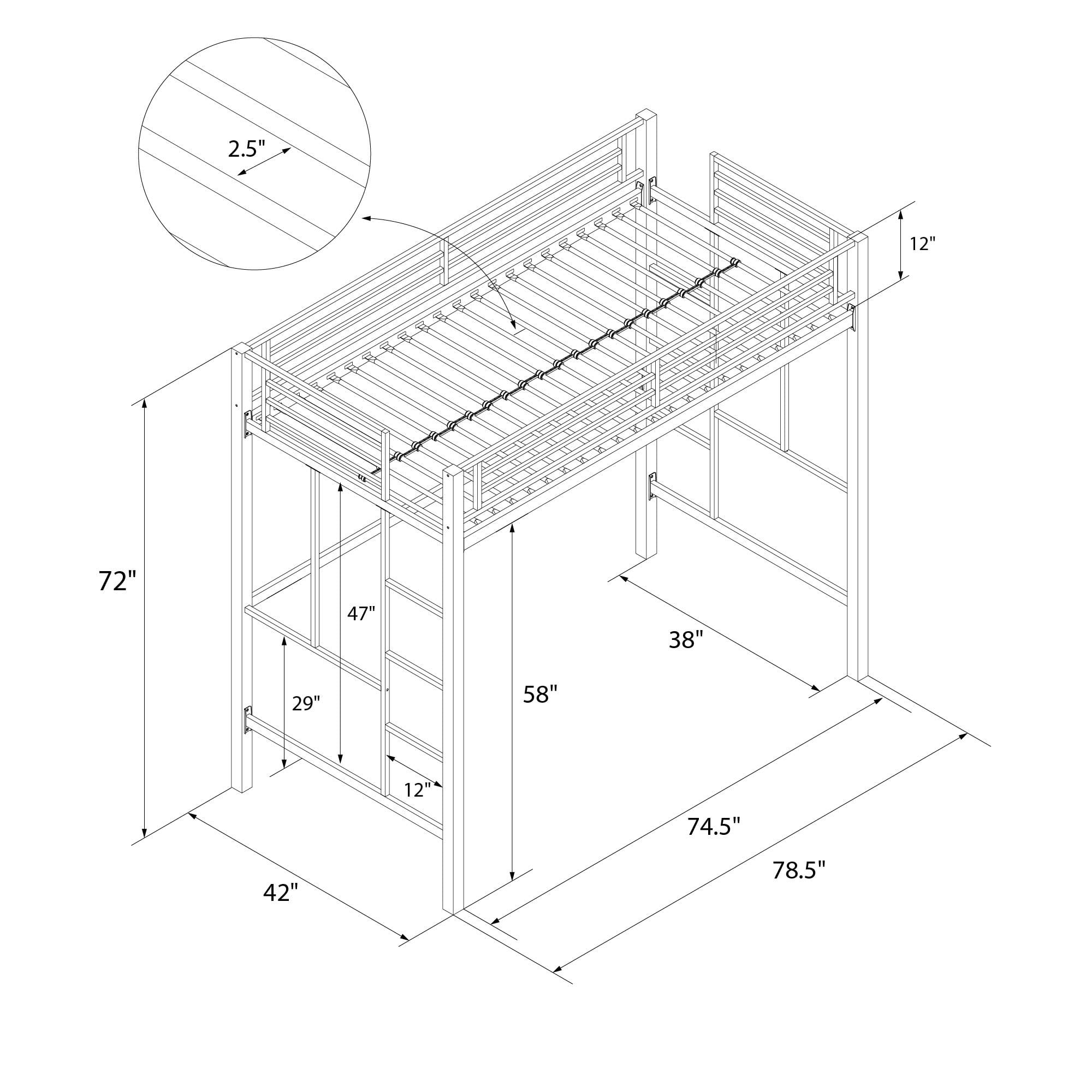 Solid and sturdy metal construction Available in Black or Silver Great for a girls or boys bedroom Space saving design Ladders securely integrated into the design of the loft bed Suitable for older children and teens Upper guardrails for added safety Easy assembly required. All tools included warranty applies Weight limit 200 LBS. Mattress not included