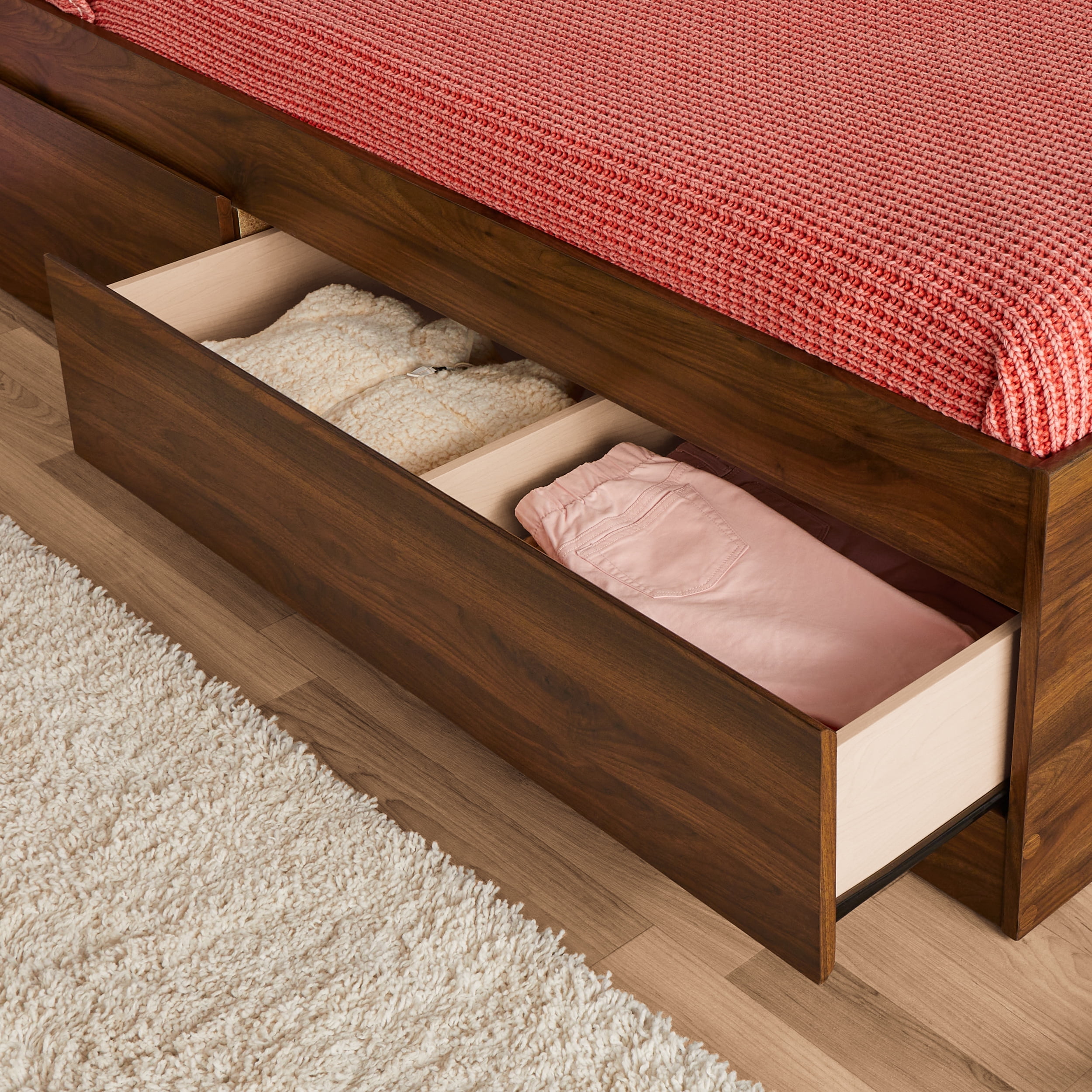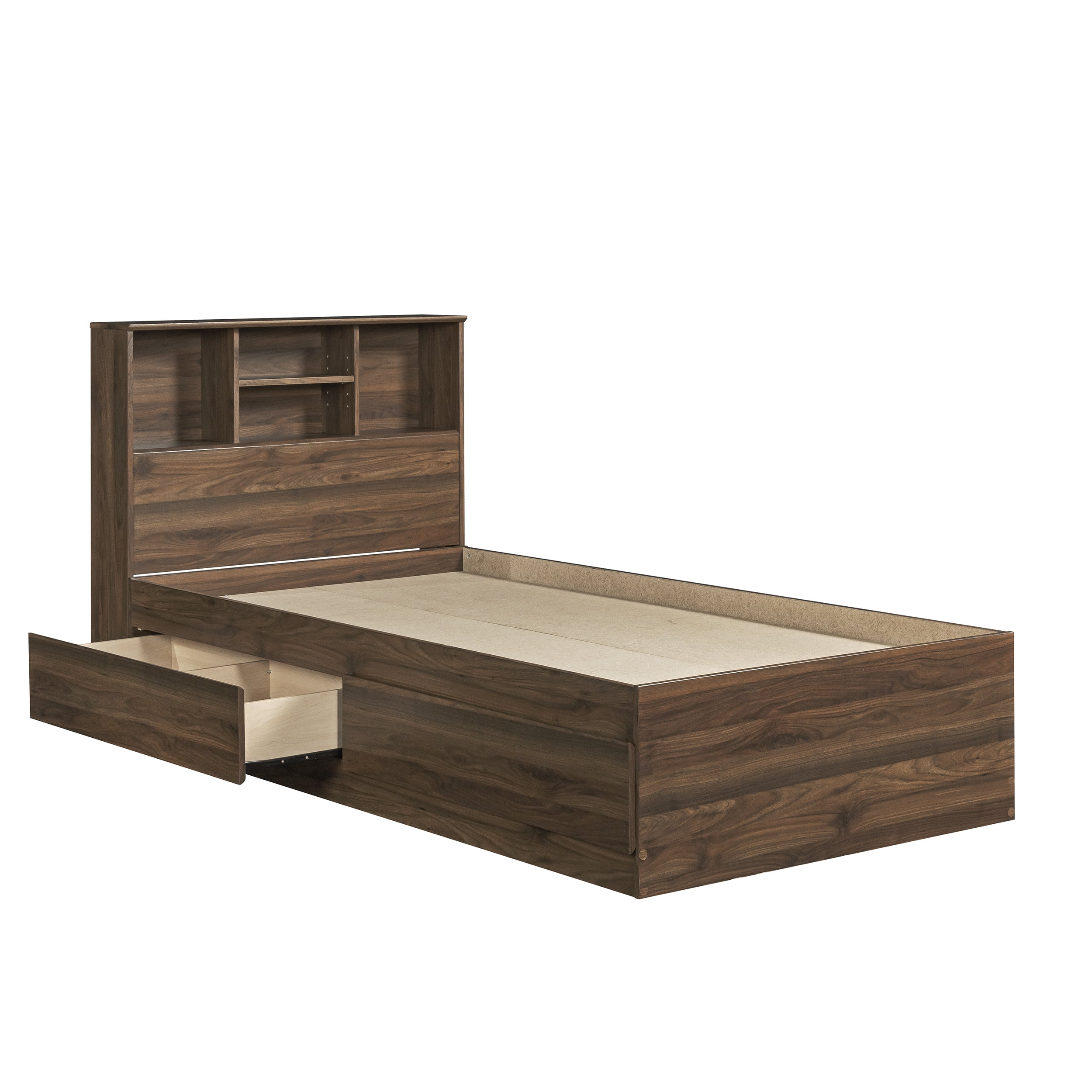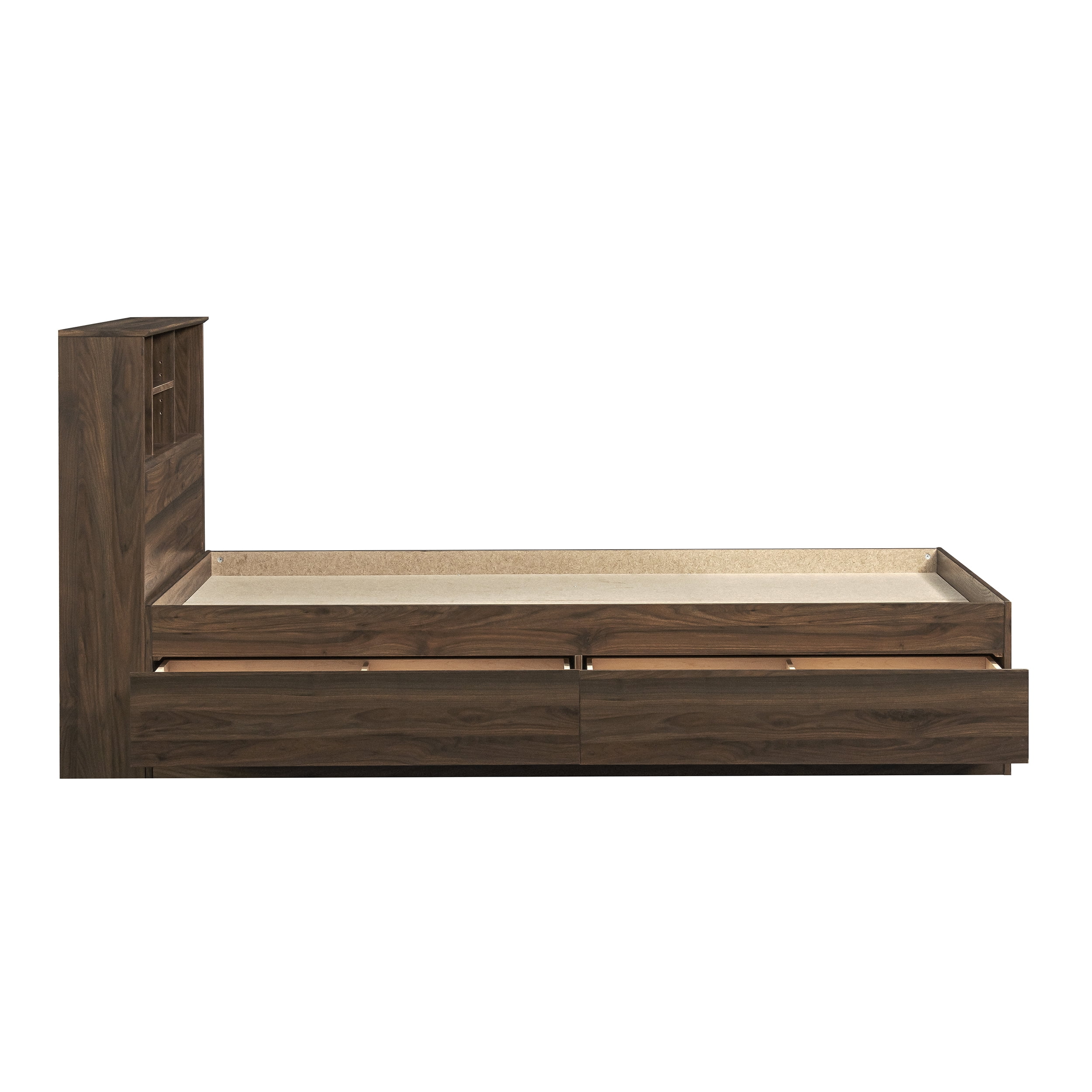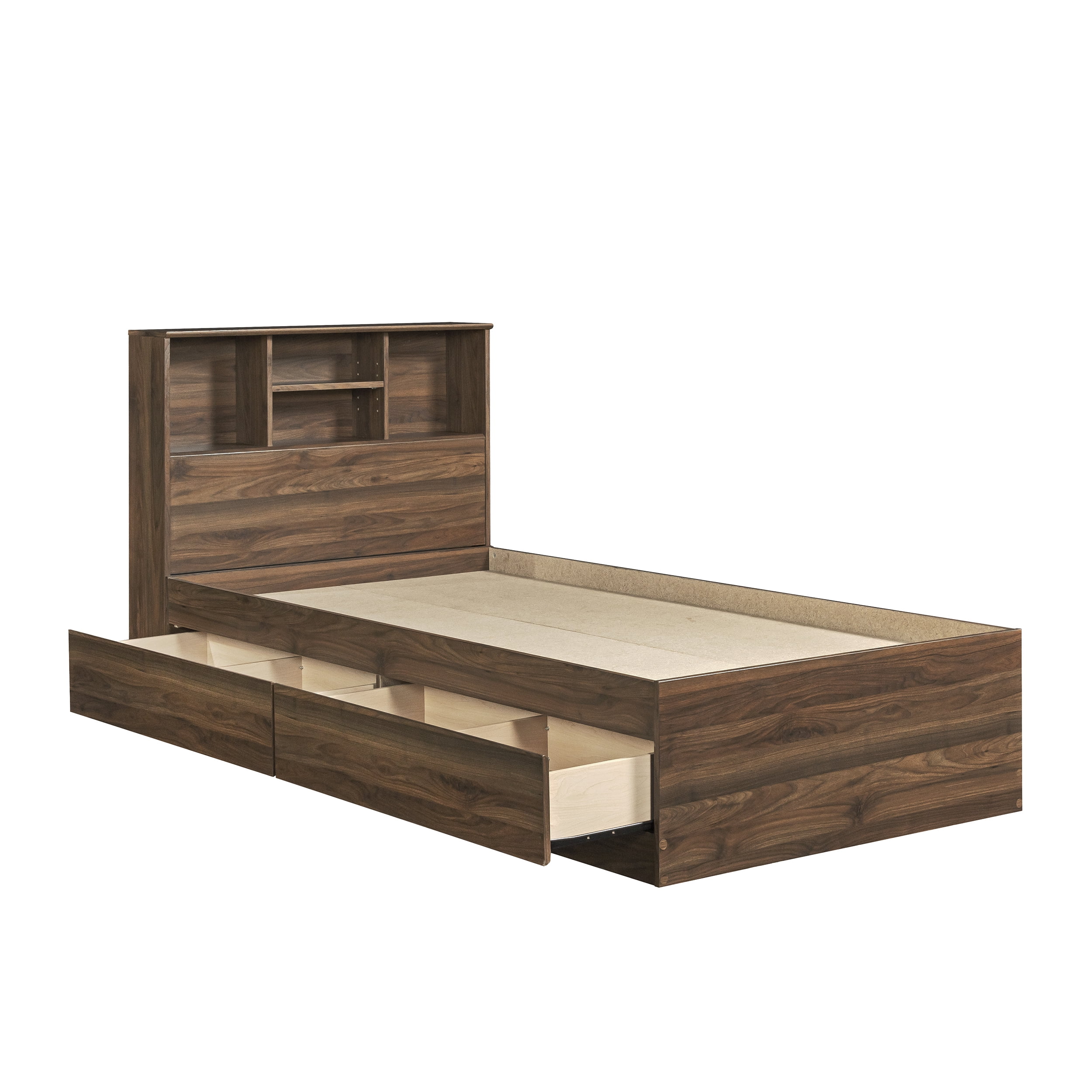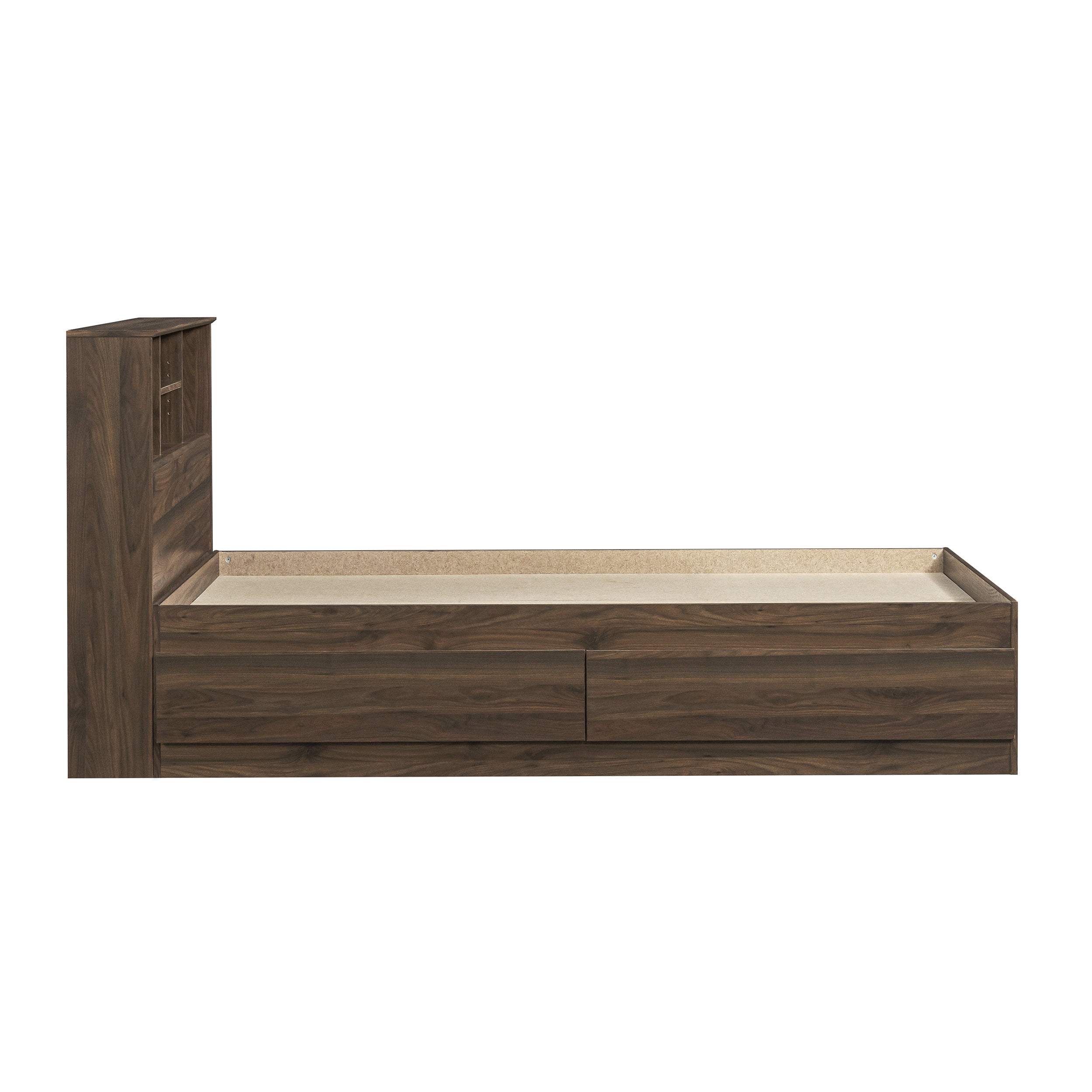 Looking to give your sleepy bedroom decor a fresh and stylish and functional new update? Well then, we have just the piece for you! This Twin Storage Bed from the Your Zone collection is sure to add clean lines and sleek design to your teens’ bedroom so you can snooze in style. It features convenient under the bed storage with two large storage drawers that create an easy access space to stow away anything from stacks of sweatshirts and your abundance of shoes to board games and an extra set of sheets and blankets. You are also given the option of placing the storage drawers on the left or the right hand side. The headboard has an adjustable center shelf with two open bookshelves and can be used for your alarm clock, books and other personal items. You can find room for all your stuff! It accommodates a twin-sized mattress(not included) to give you a completed look, whether it is in your master suite or down the hallway in the guest room. It adds cozy style and simplistic beauty no matter where it rests. Finished in Canyon Walnut and detailed with stylish hardware, this attractive twin platform bed is everything your bedroom needs and more!