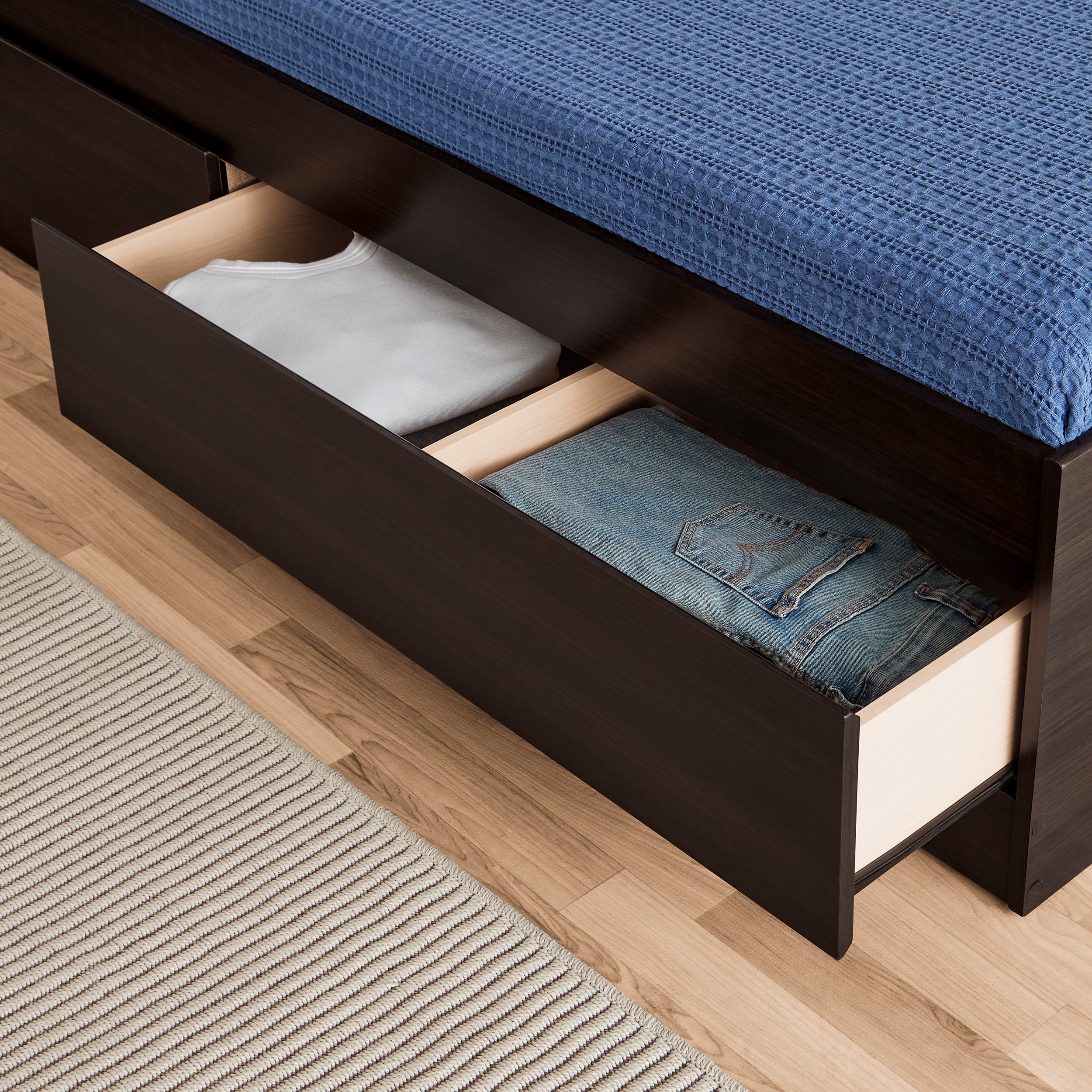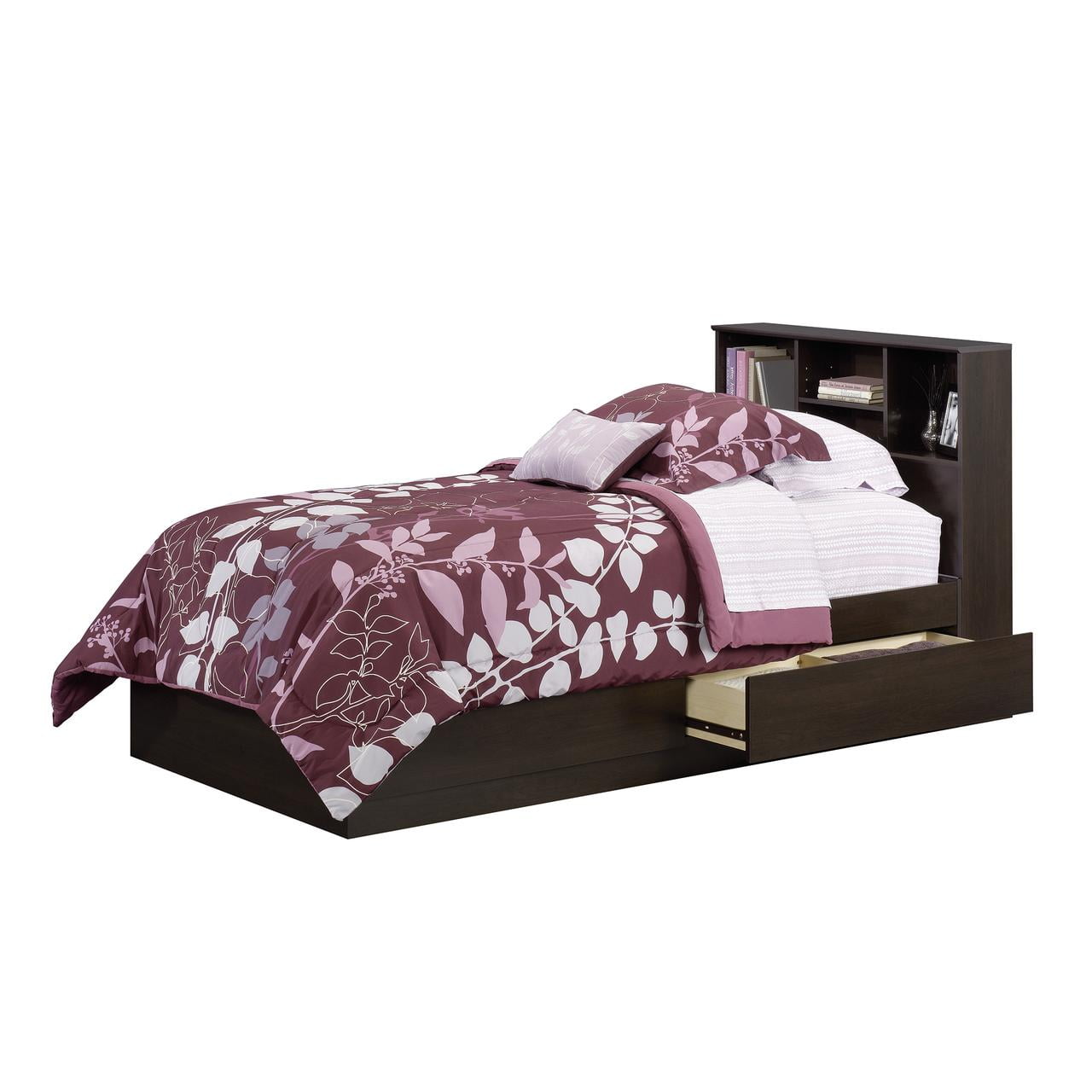 Looking to give your sleepy bedroom decor a fresh and stylish and functional new update? Well then, we have just the piece for you! This Twin Storage Bed from the Your Zone collection is sure to add clean lines and sleek design to your teens’ bedroom so you can snooze in style. It features convenient under the bed storage with two large storage drawers that create an easy access space to stow away anything from stacks of sweatshirts and your abundance of shoes to board games and an extra set of sheets and blankets. You are also given the option of placing the storage drawers on the left or the right hand side. The headboard has an adjustable center shelf with two open bookshelves and can be used for your alarm clock, books and other personal items. You can find room for all your stuff! It accommodates a twin-sized mattress(not included) to give you a completed look, whether it is in your master suite or down the hallway in the guest room. It adds cozy style and simplistic beauty no matter where it rests. Finished in Espresso and detailed with stylish hardware, this attractive twin platform bed is everything your bedroom needs and more!