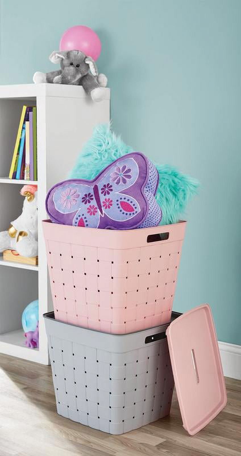 Your Zone Large Weave Plastic Storage Bin with Lid—perfect for organizing bedrooms, playrooms, classrooms, and more. Suitable for kids, teens, and adults, helping them stay organized with toys, clothes, books, and more. Made from durable plastic (resin material) with a stylish large weave pattern for long-lasting use. Includes a snug-fitting lid for a seamless, sleek look and stacking. Designed with cut-out carrying handles for easy transport. Maximizes storage space in any room with a versatile and attractive design. Each bin measures 15″ x 15″ x 13.5″ and weighs 1.9 lb. Available in Pink and Gray. Easy to clean: Wipe with a damp cloth and dry with a towel or air dry.