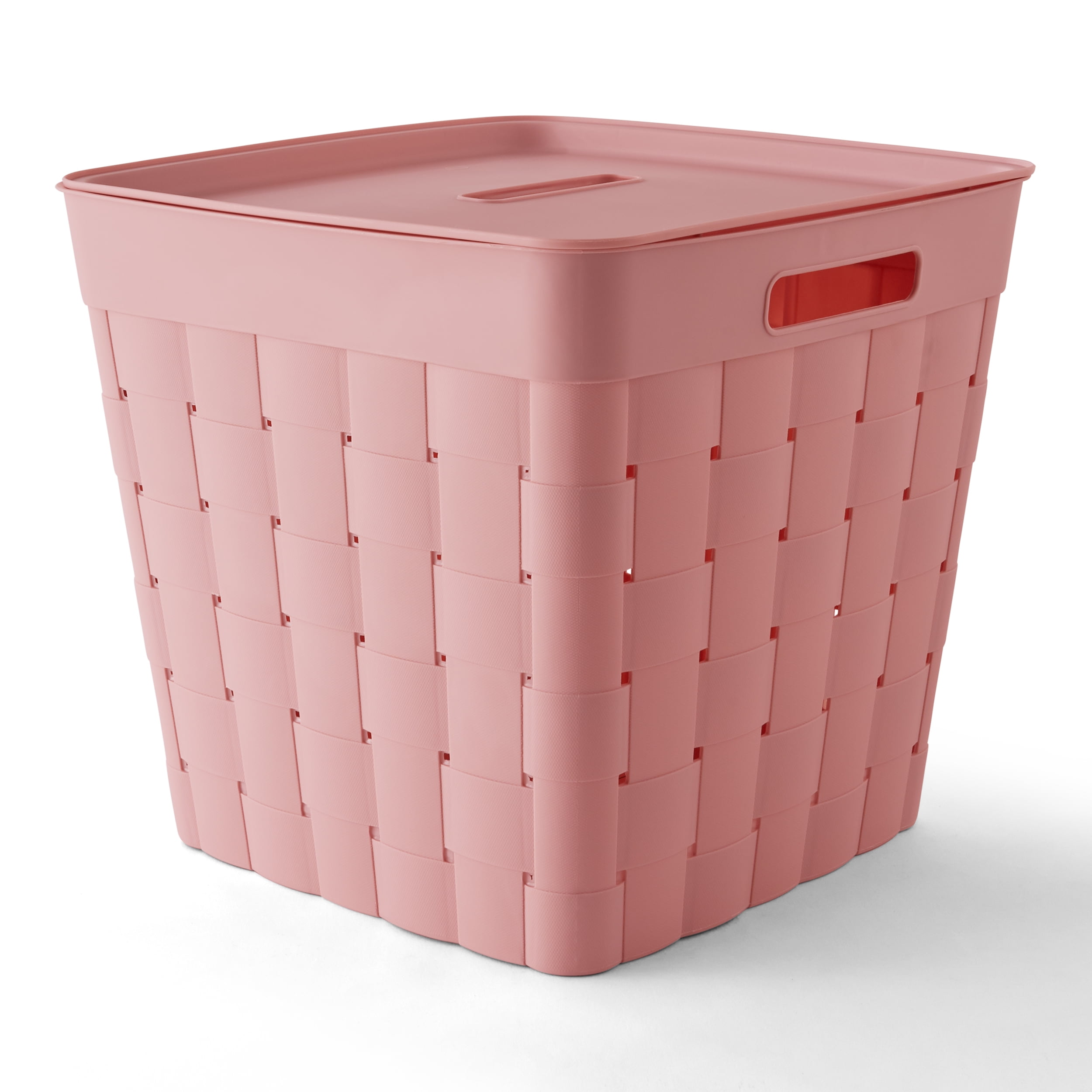 The Your Zone Large Weave Plastic Storage Bin with Lid makes organization easy. Perfect for keeping bedrooms, playrooms, classrooms, and neater and more orderly, this storage bin features cut-out carrying handles for easy transport. The bin is crafted of durable resin for a long life of reliable use with a large weave pattern for an understated style. An included lid fits snugly inside the outer rim of the bin to maintain the sleek look and feel. The Your Zone Large Weave Storage Bin with Lid helps increase the usable storage space in any room and helps kids and teens learn to stay organized by putting their toys, clothes, books, and more where they belong. Easy to care for, simply wipe with a damp or wet cloth and dry with a towel or allow to air dry. Available in Gray and Pink.