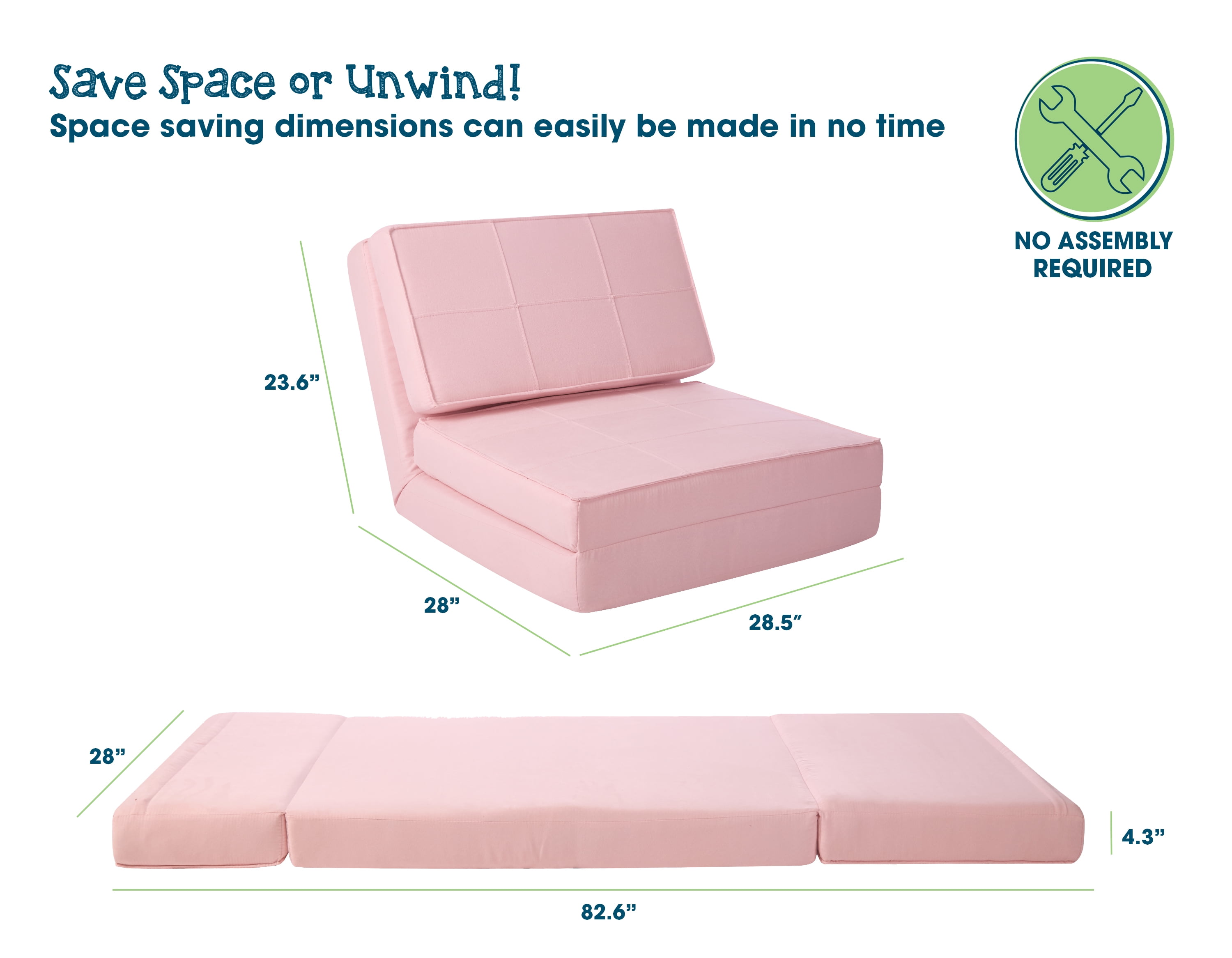 Your Zone Convertible Chair Blush: • DESIGN: Chair easily converts into a bed – best multi-purpose chair! • MATERIAL: Ultra suede soft material outside and foam inside with sturdy metal frame • ASSEMBLY: No assembly required! • WANT MORE? Available in many colors and designs – push them together as well! • SIZE: Chair Position: 28” L x 28.5” W x 23.6” H , Bed Position: 28” L x 82.6” W x 4.3” H • HOW TO USE: Push top of back cushion forward to hear “click” and it will lie flat for extra comfort. Can be used in any room in the house! • MAXIMUM WEIGHT: 440 lbs