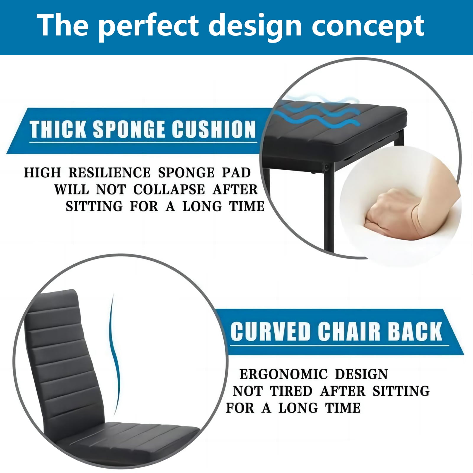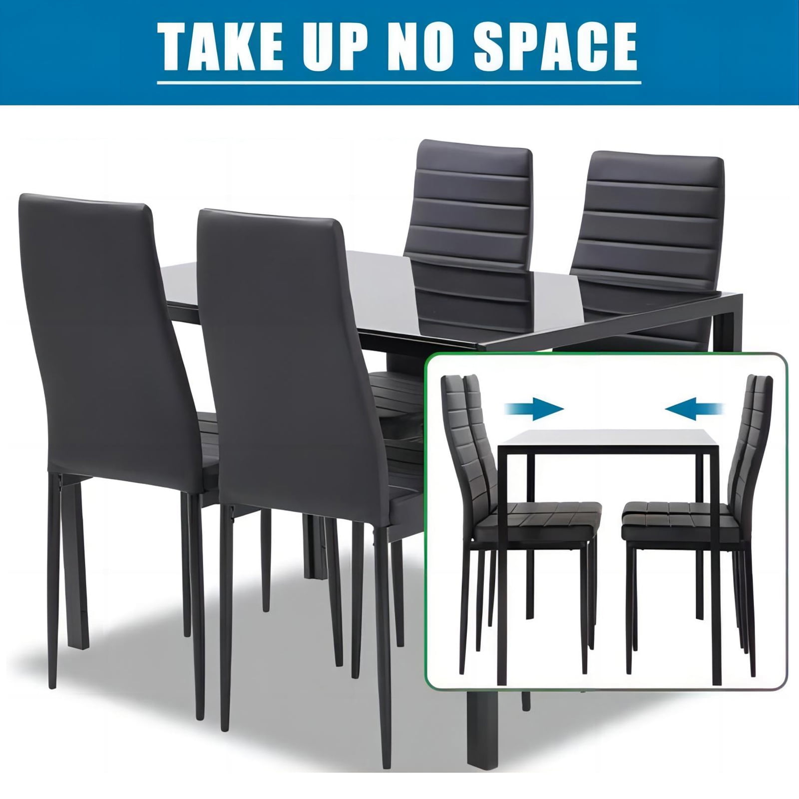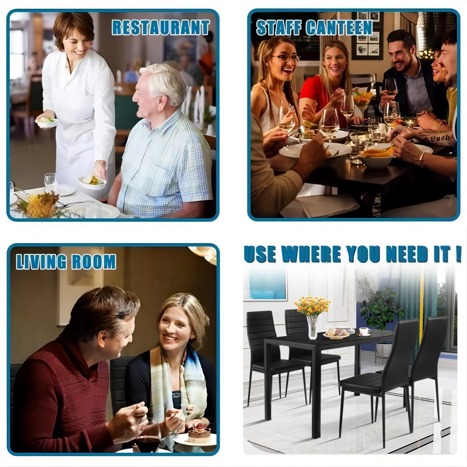 Complete 4-Piece Dining Set: Includes a modern dining table and four matching chairs—ready to use right out of the box for effortless mealtime setups. Comfort-Focused Seating: PU leather-upholstered chairs with plush cushioning ensure lasting comfort, perfect for leisurely meals or extended gatherings. Sleek & Scratch-Resistant Glass Top: Features a tempered safety glass tabletop that resists scratches, stains, and heat, paired with quick-clean convenience for hassle-free maintenance. Industrial-Strength Metal Frame: Built with a robust metal base for rock-solid stability, engineered to withstand daily use while maintaining a sleek, contemporary aesthetic. Compact Family Gathering Space: Ideal for 4-person households or cozy entertaining, offering an intimate setting for shared meals, game nights, or casual conversations.