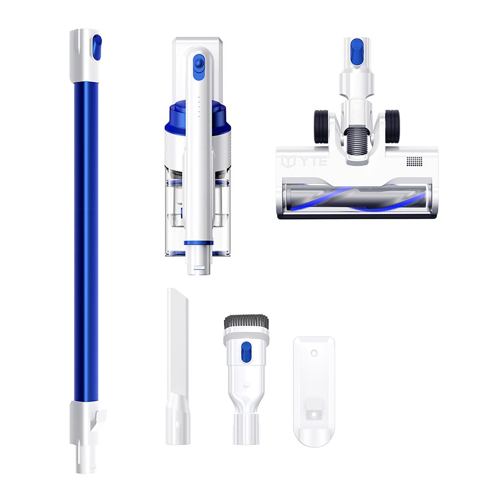 YTE Cordless Stick Vacuum Cleaner This pet hair vacuum comes equipped with strong suction and a 6-stage filtration system that makes it easy to clear dust and pet hair on carpet or floors. What You Get Cordless Vacuum Metal tube Floor brush Long crevice tool 2-in-1 Cleaning tool Charger Rolling brush (preinstalled) Wall mount bracket 2 Wall plugs 2 Screws Quick start guide Instructions