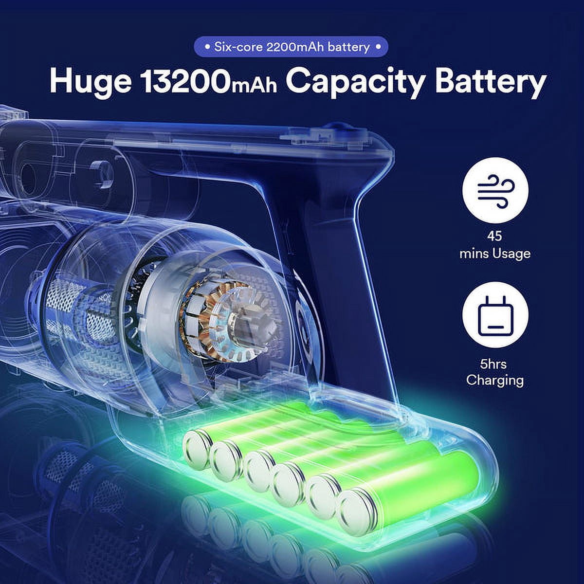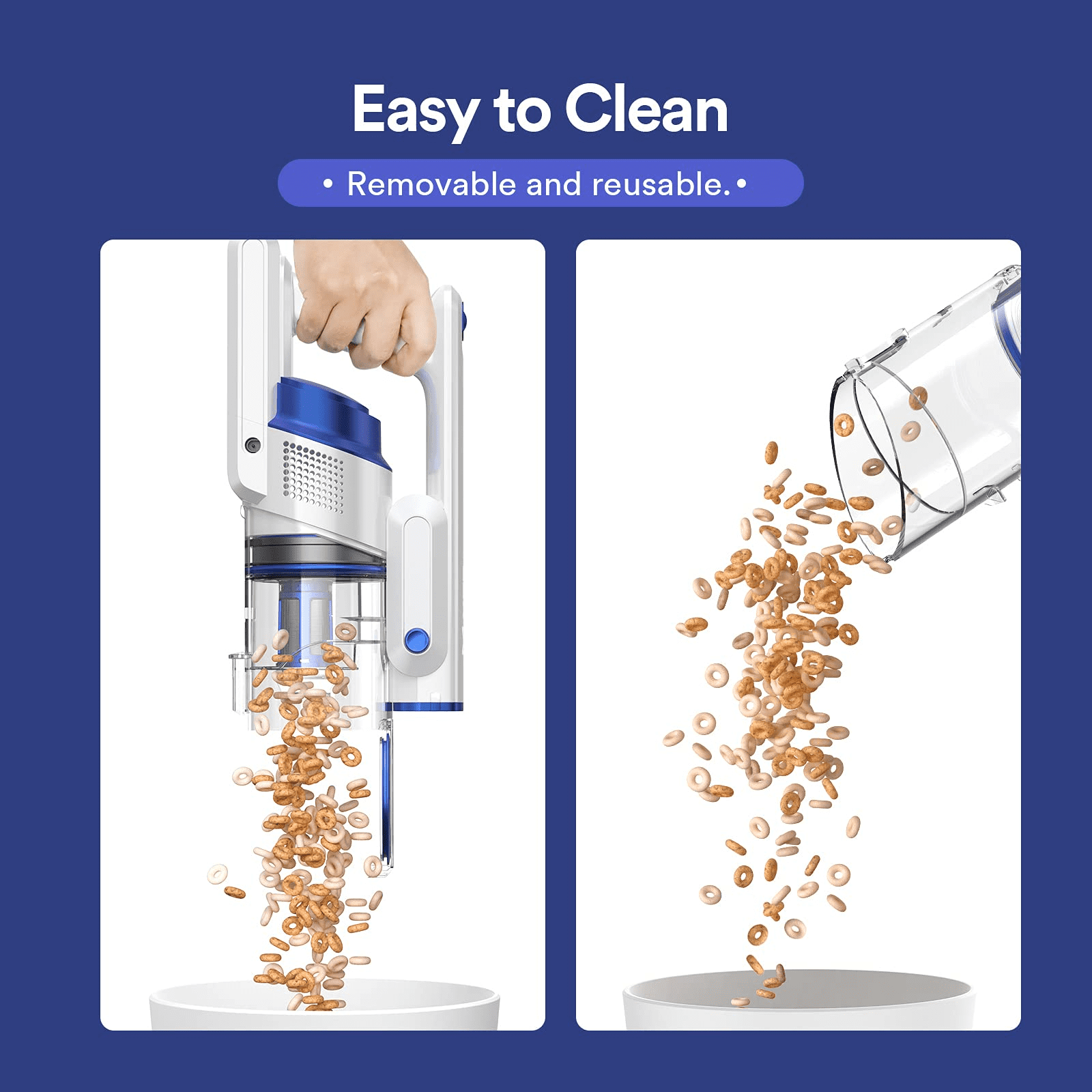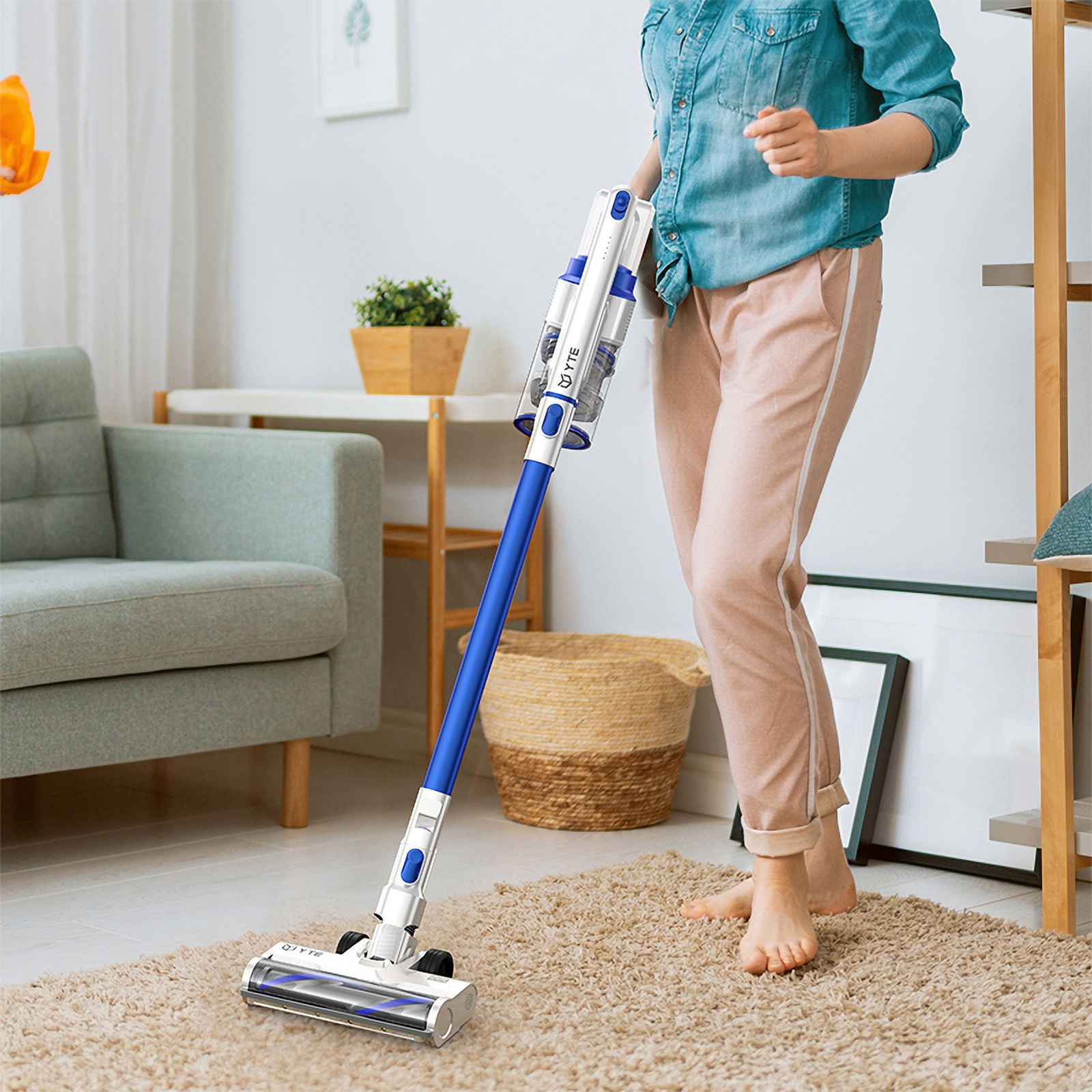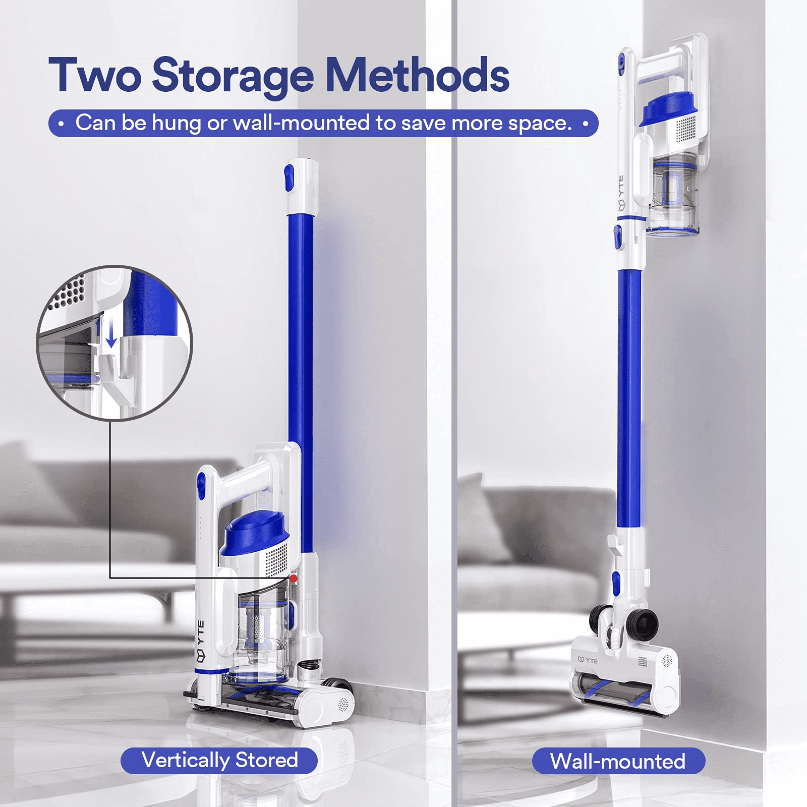 YTE 22.2V Cordless Vacuum Cleaner – Powerful Suction 6-in-1 Functions: Cord-free design with versatile attachments allows for easy transformation into a handheld vacuum, perfect for reaching corners, stairs, and crevices Stiff and Soft Bristles: Integrated bristles on one roller are ideal for various floor types and help prevent hair wrapping Flexible Motorized Brush with LED Lights: Brushes rotate 180 degrees sideways and 90 degrees up-and-down for cleaning under furniture; LED floor light illuminates dark corners Layers Filtration System: Features a large capacity 5-liter dust bucket with a washable filter screen to effectively prevent suction loss and blockage Lightweight and Mountable: Weighs only 2.9 lbs., making it ultra-lightweight and adaptable with different accessories for various cleaning needs