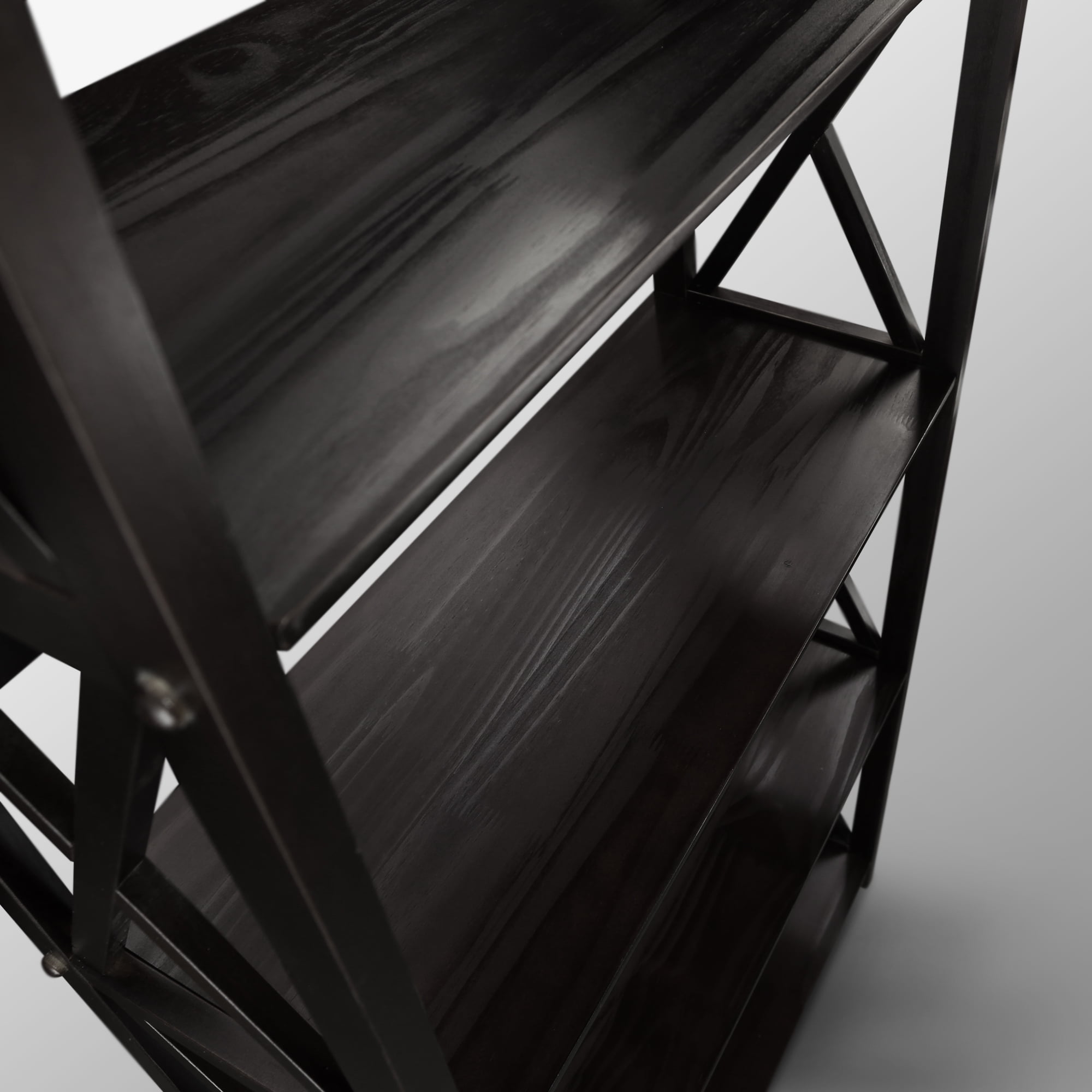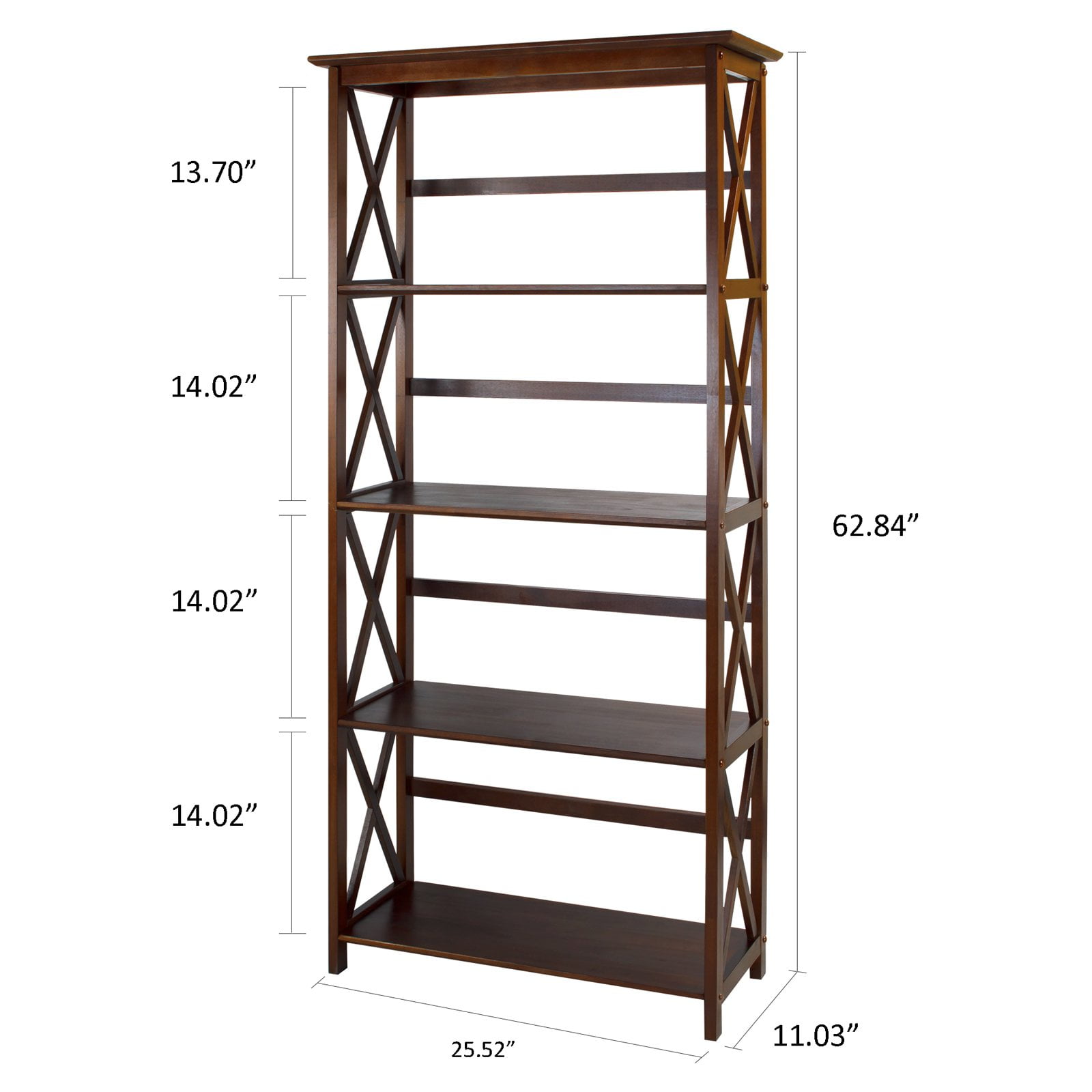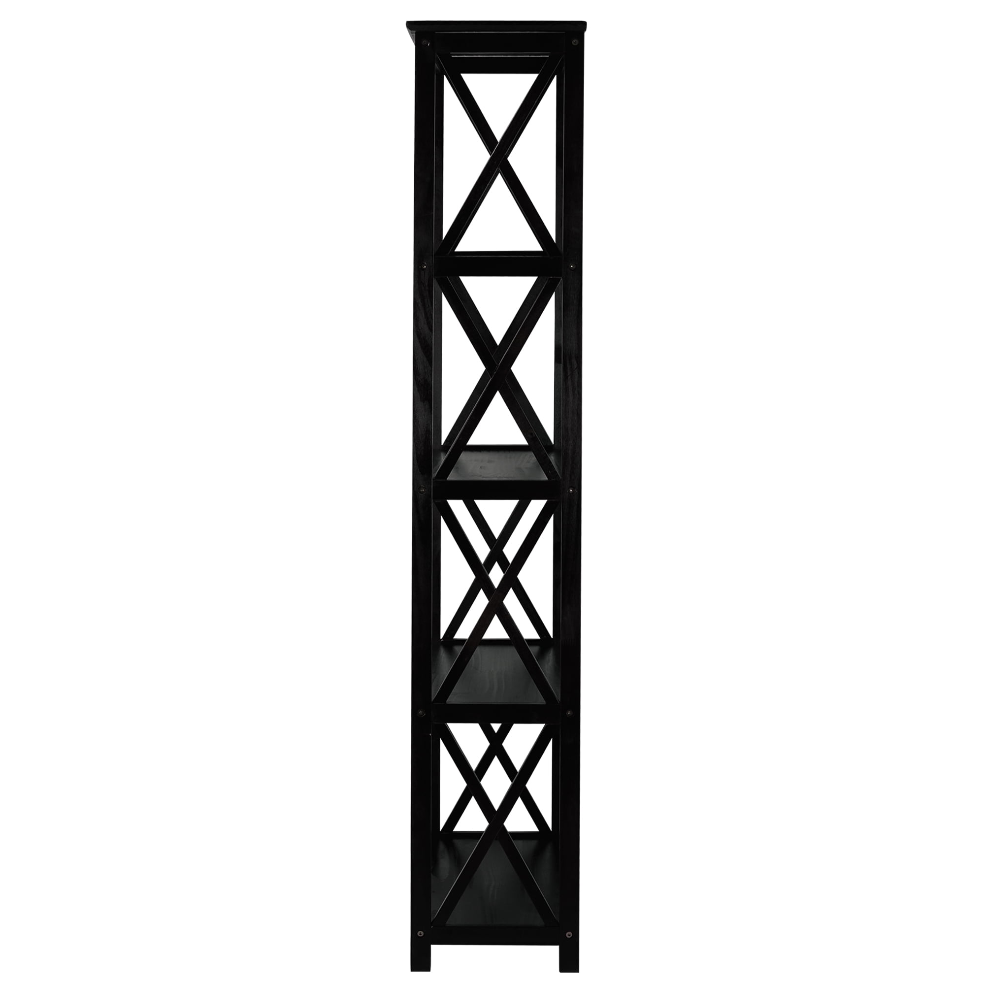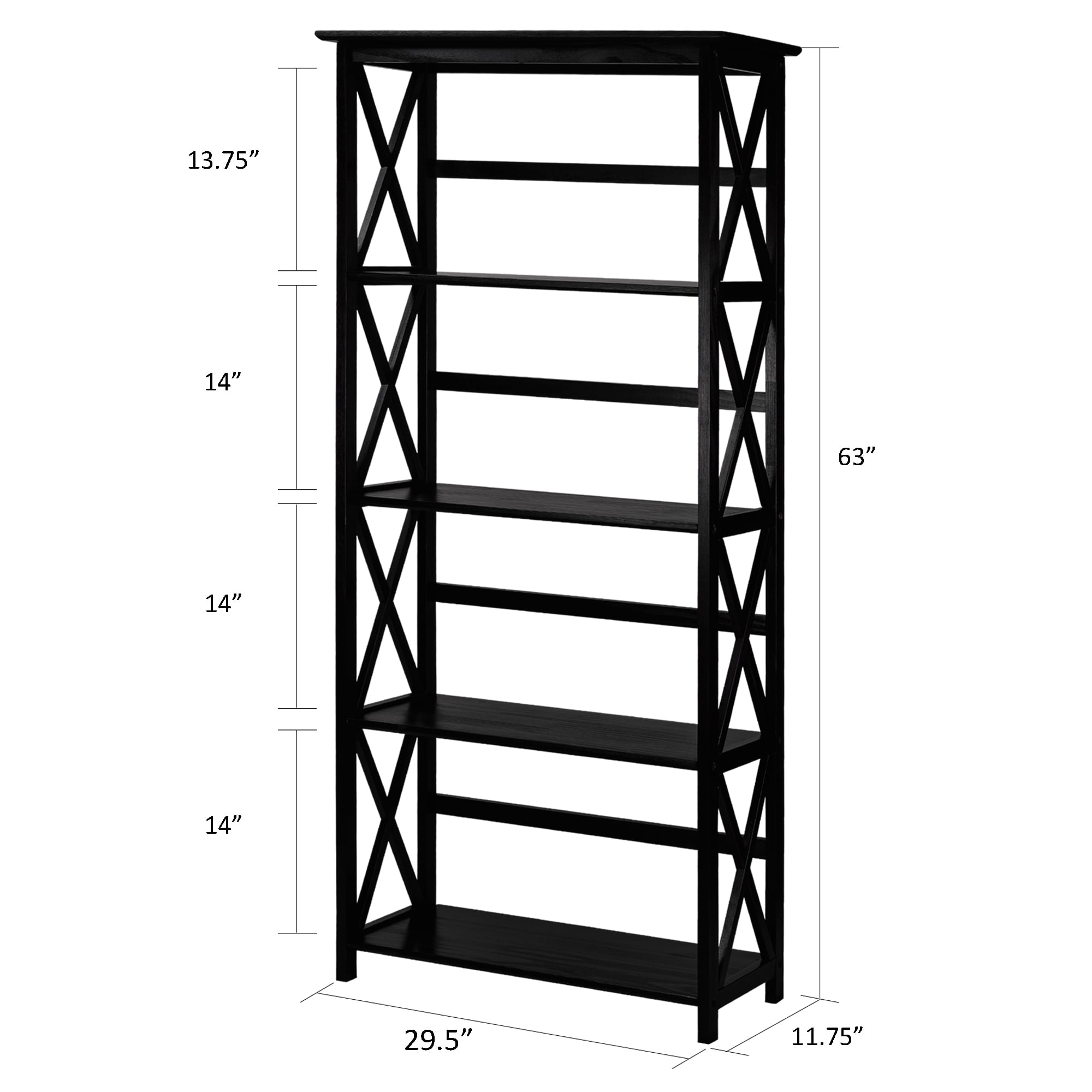 Montego 5-Shelf Bookcase, Black: 5 spacious shelves provide plenty of storage space Contemporary design styling gives this piece a chic, airy look that prevents books from falling This X-design bookcase has 4 durable legs to provide balanced support for your belongings Rich, black finish accentuates your lighter decor Solid wood construction for increased durability and longevity Comes in multiple colors Lightweight and easy to assemble Material: solid pine Assembled product weight 27.00 lbs Assembled product dimensions: 11.75″L x 29.50″W x 63.00″H