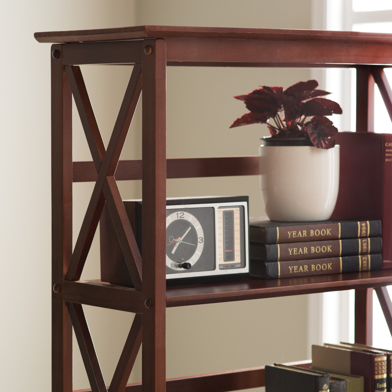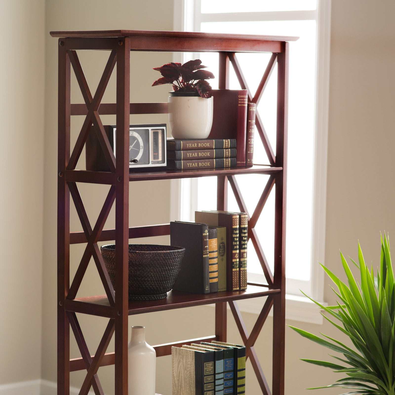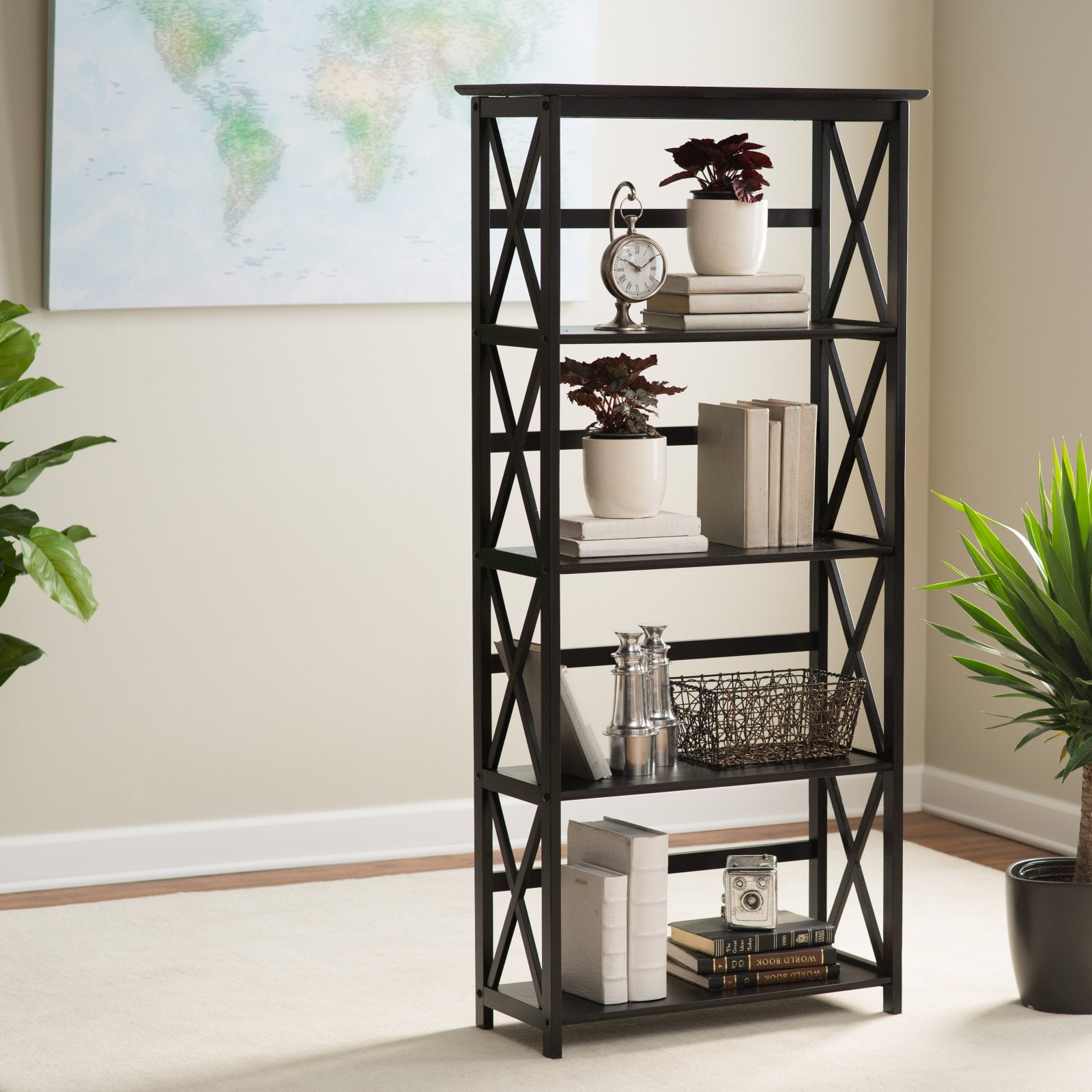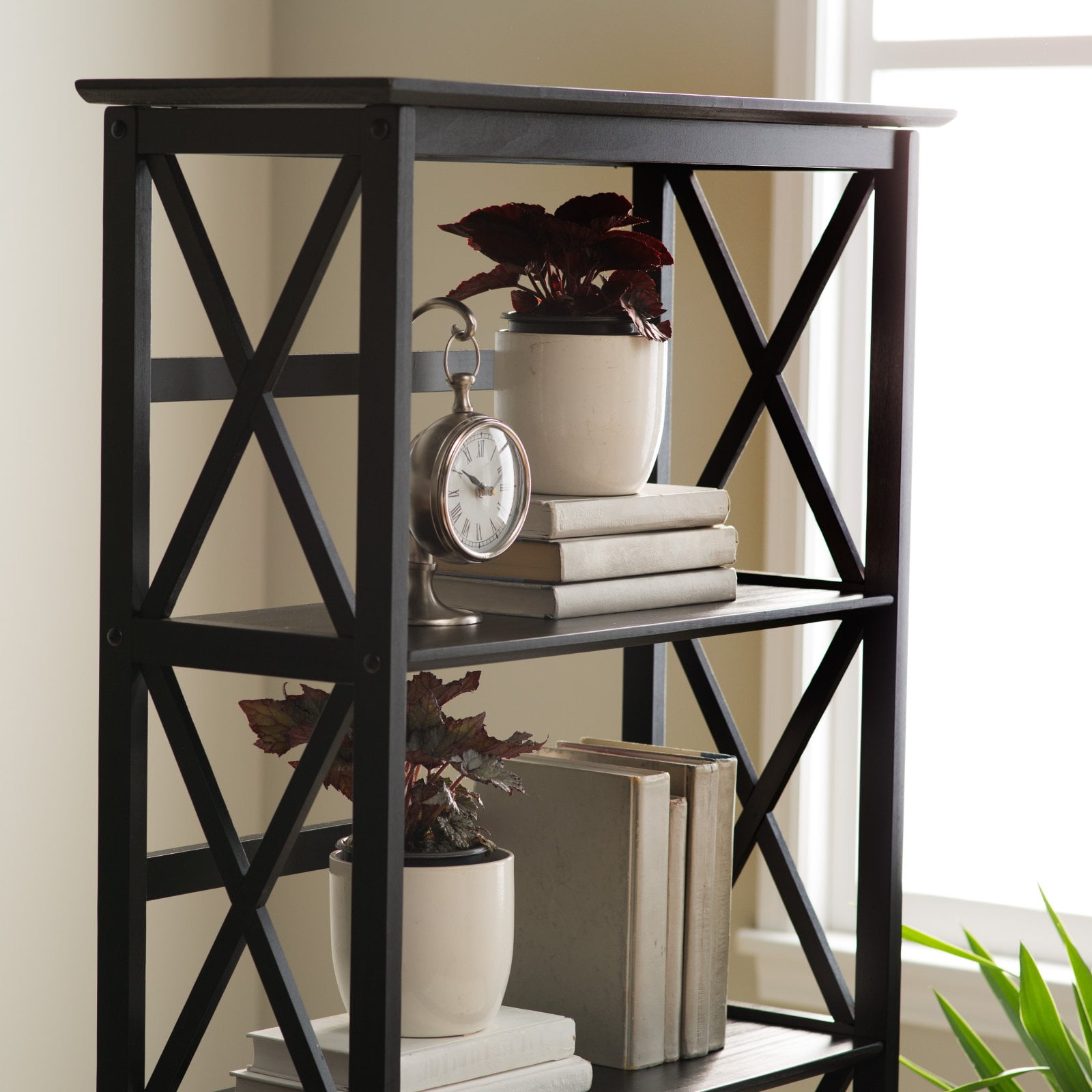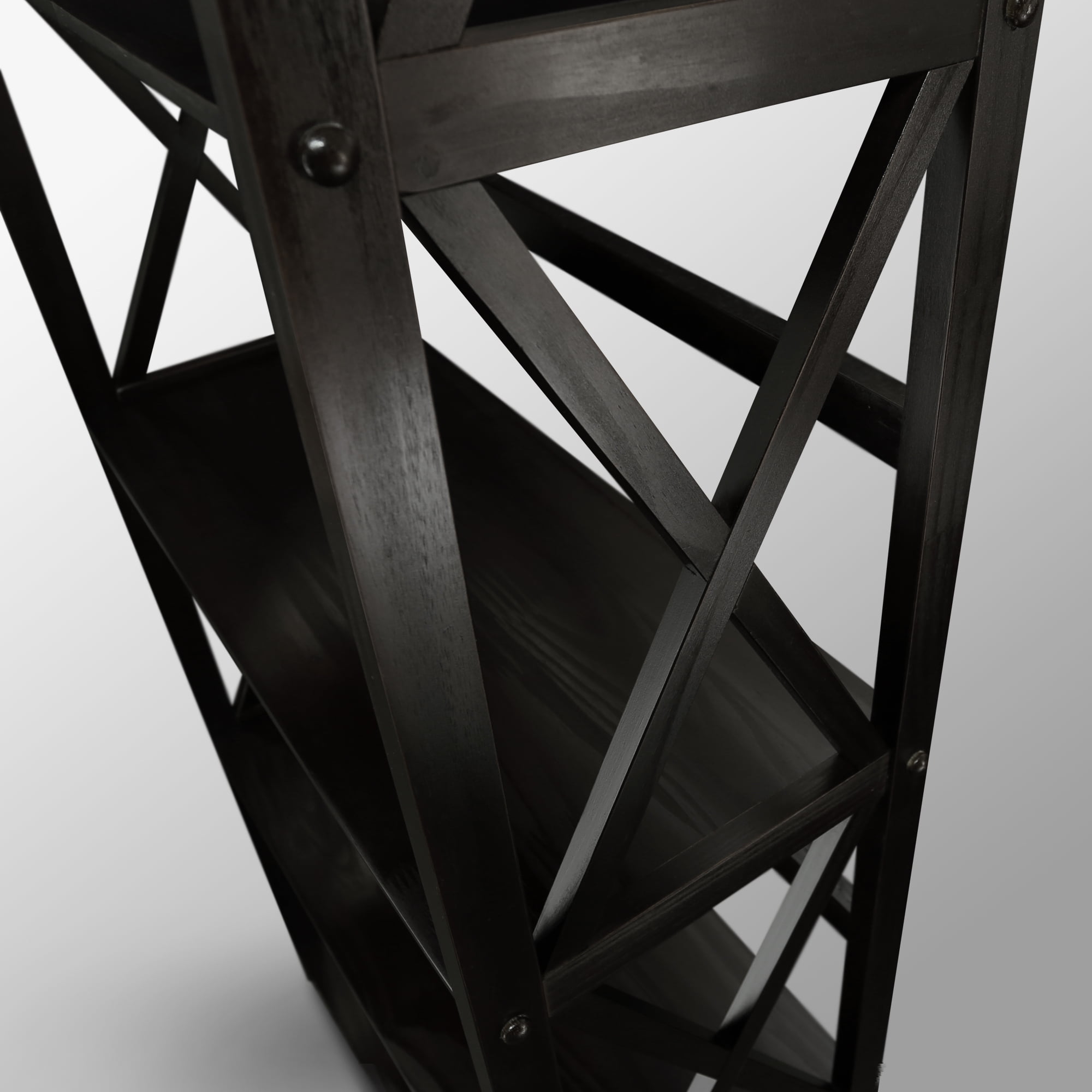 Montego 5-Shelf Bookcase, Black: 5 spacious shelves provide plenty of storage space Contemporary design styling gives this piece a chic, airy look that prevents books from falling This X-design bookcase has 4 durable legs to provide balanced support for your belongings Rich, black finish accentuates your lighter decor Solid wood construction for increased durability and longevity Comes in multiple colors Lightweight and easy to assemble Material: solid pine Assembled product weight 27.00 lbs Assembled product dimensions: 11.75″L x 29.50″W x 63.00″H