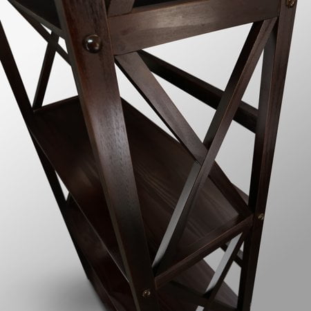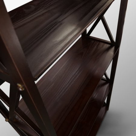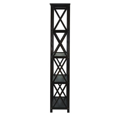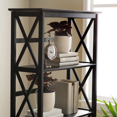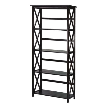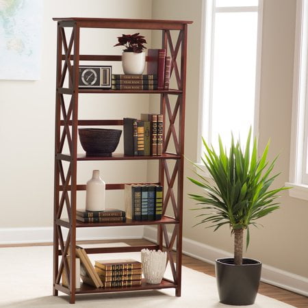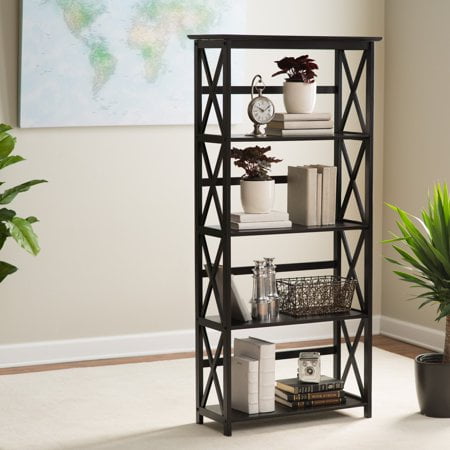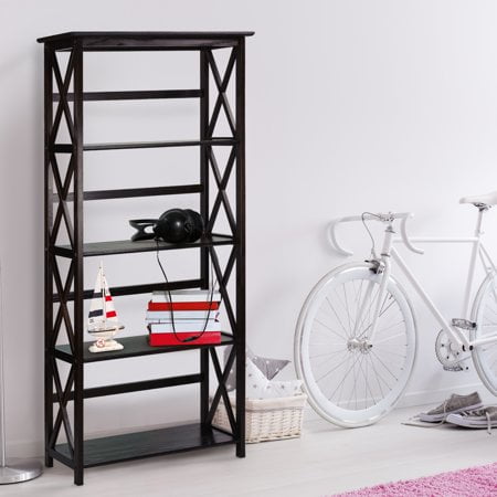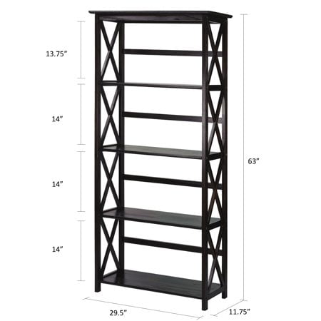 Five (5) spacious shelves provide all the storage space you need Dimensions: 63 inches high x 29.50 inches wide x 11.75 inches deep- Weight Item Weight: 33.5 pounds Product Dimensions (L x W x H): 11.75″ x 29.50″ x 63.00″ Size: 5-Shelf Color: Espresso Contemporary x-design styling gives this piece a chic airy look that prevents books from falling Four (4) durable legs provide balanced support for your belongings Solid wood construction for increased durability and longevity with light and easy assembly Light and easy assembly.