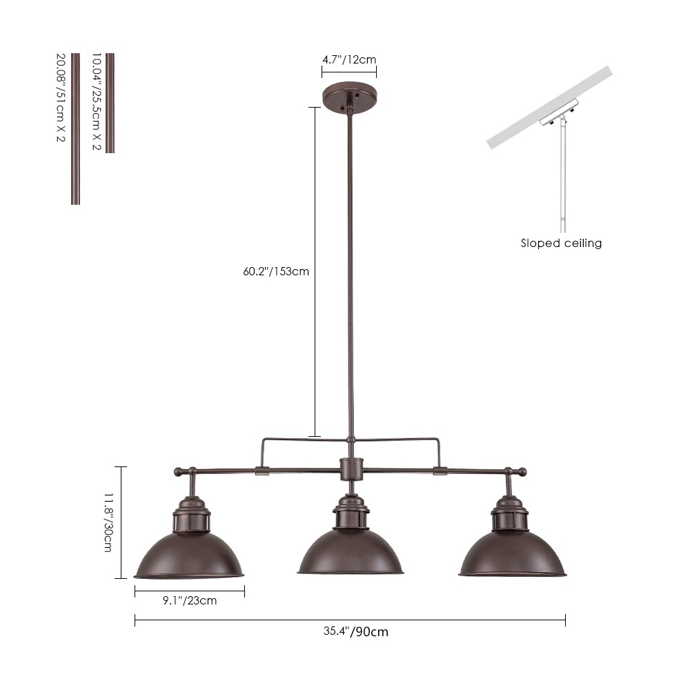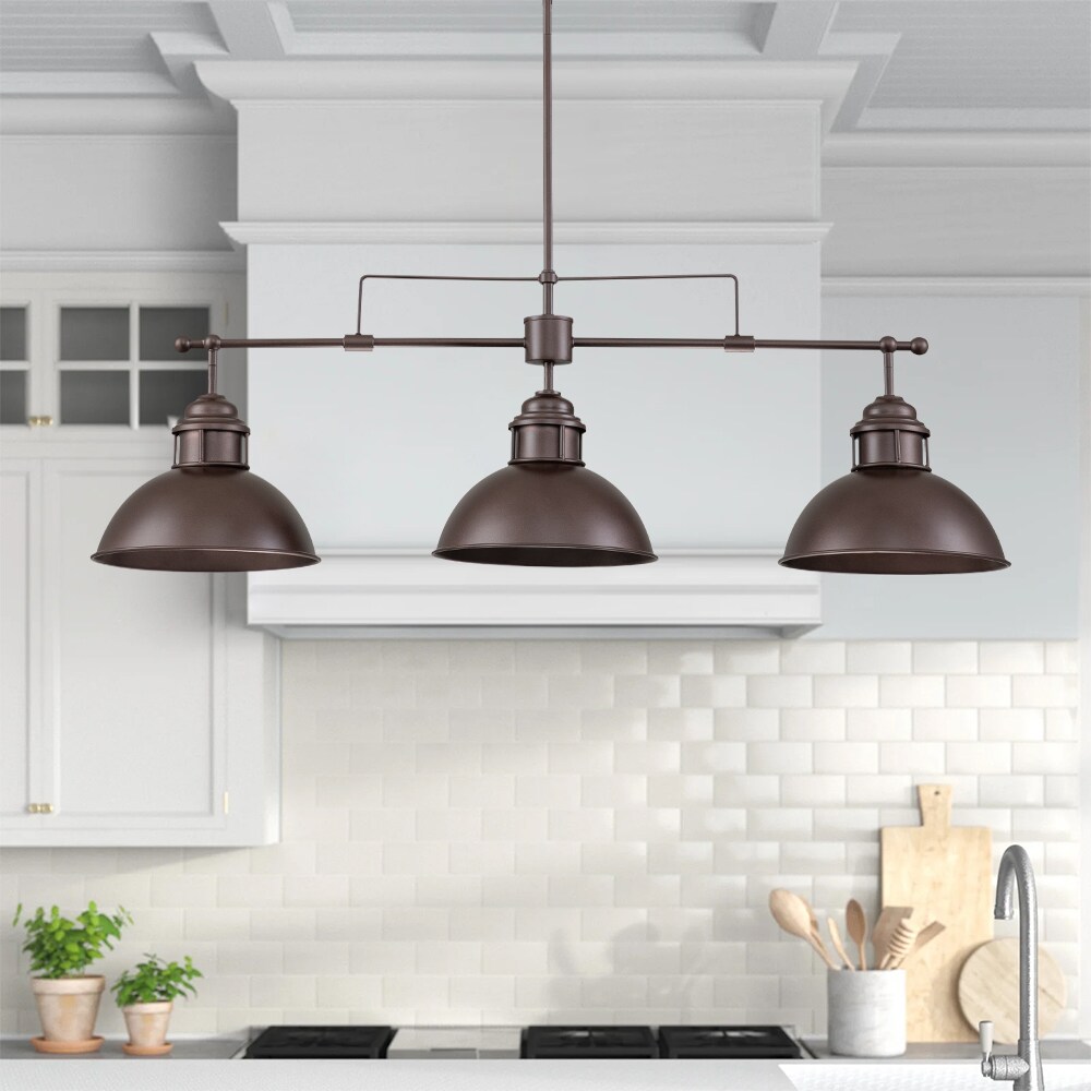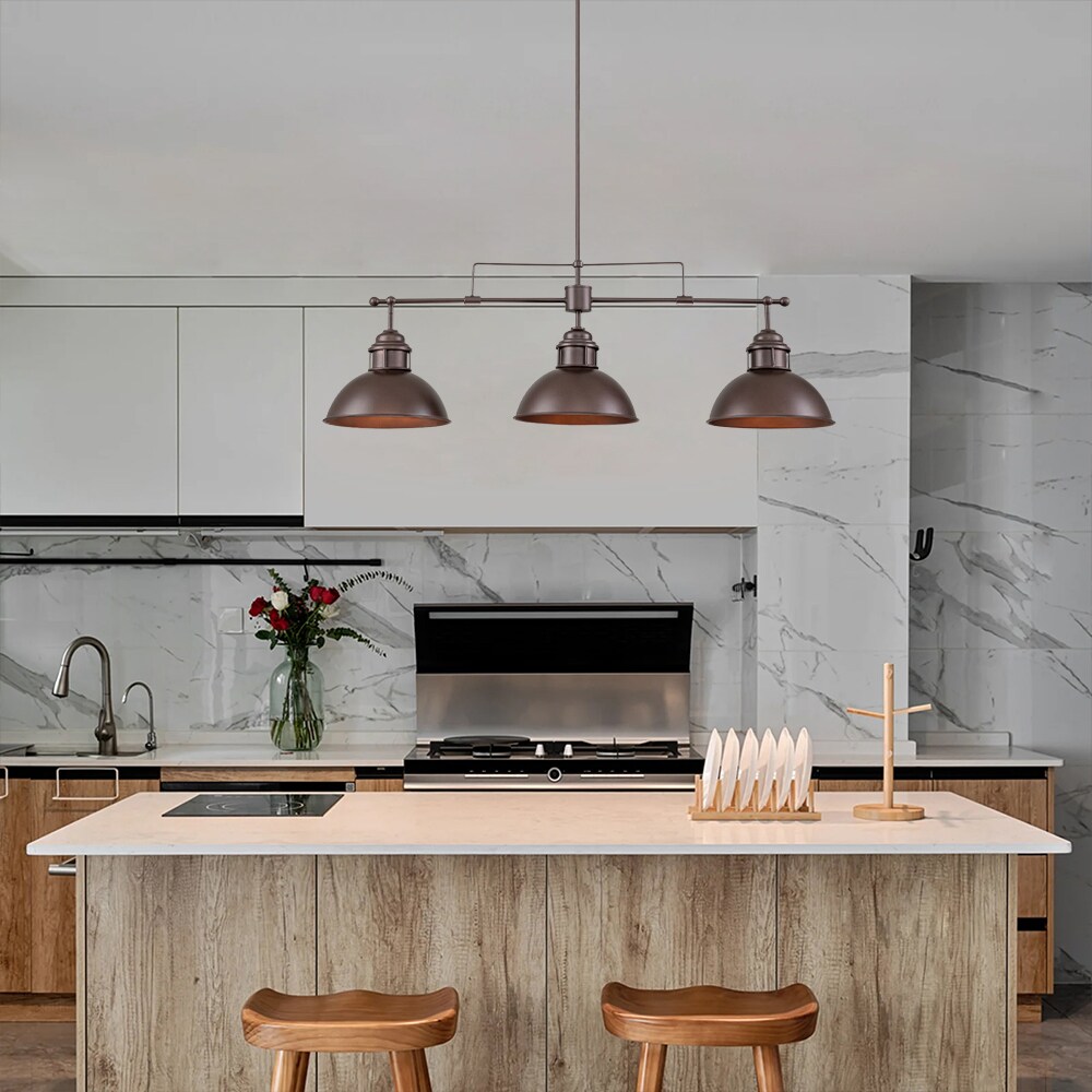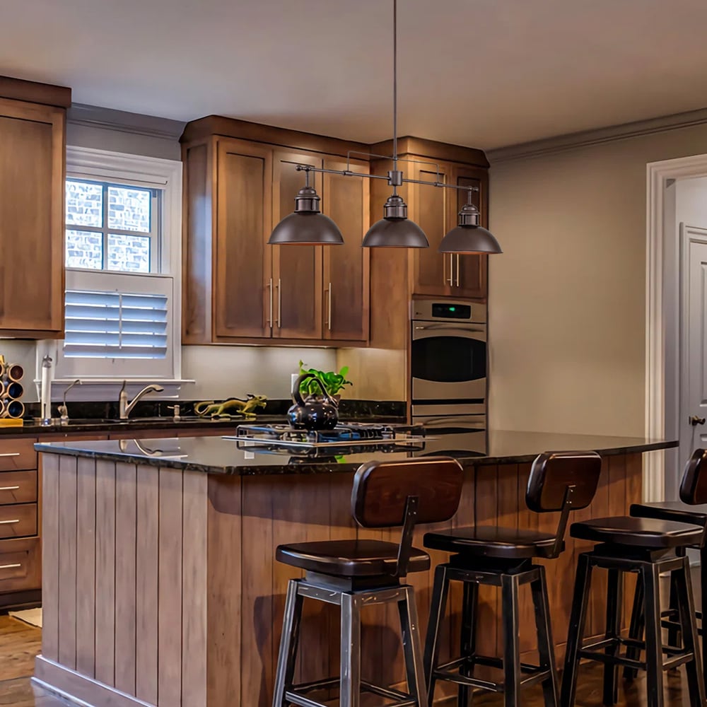 Elevate your kitchen island or dining area with our Yuna 3-Light Linear Pendant, designed to blend seamlessly with modern farmhouse, rustic, or industrial interiors. Crafted from high-quality metal with a sleek finish, this pendant light features a distinctive horizontal rod that supports three vintage-inspired dome shades, adding a touch of timeless elegance to any space. Its simple yet elegant design makes it a standout piece in any modern farmhouse, rustic kitchen, or industrial interior. Compatible with dimmer switches, this pendant light allows you to effortlessly adjust the lighting from bright daytime to cozy evening settings.