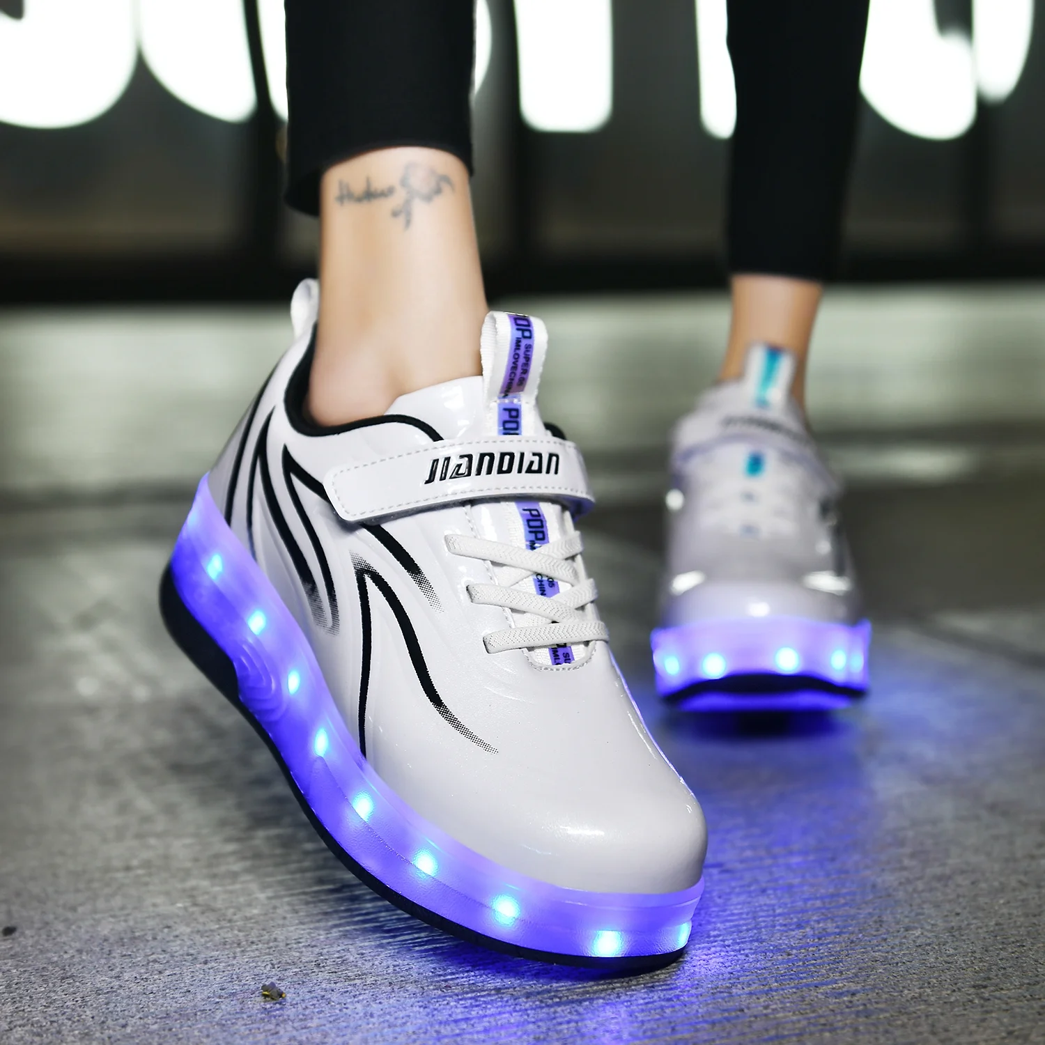 3 in 1 USB Chargeable Led Roller Sneakers 3 in 1 Roller Skates: Can be used as Double wheel shoes, Single wheel shoes(remove the front wheel and add a cover) or Flat sneakers(hold the button behind shoes to shrink the rear wheel and remove the front wheel). Hidden USB Rechargeable: 2-3 hours charged makes 6-8 hours LED lights flash. Long press for 3 seconds to turn off. Multicolored Flashing Modes: 7 kinds of Static colors, 9 kinds of Flashing modes, change it as you like. Great Gift: The best gift for kids for birthday, performances, Halloween, Thanksgiving, Christmas Day and other celebrations. Better late than never. Most Occasion: The Light up Roller Shoes perfect for the club, a rave party, or just a night out on the town.