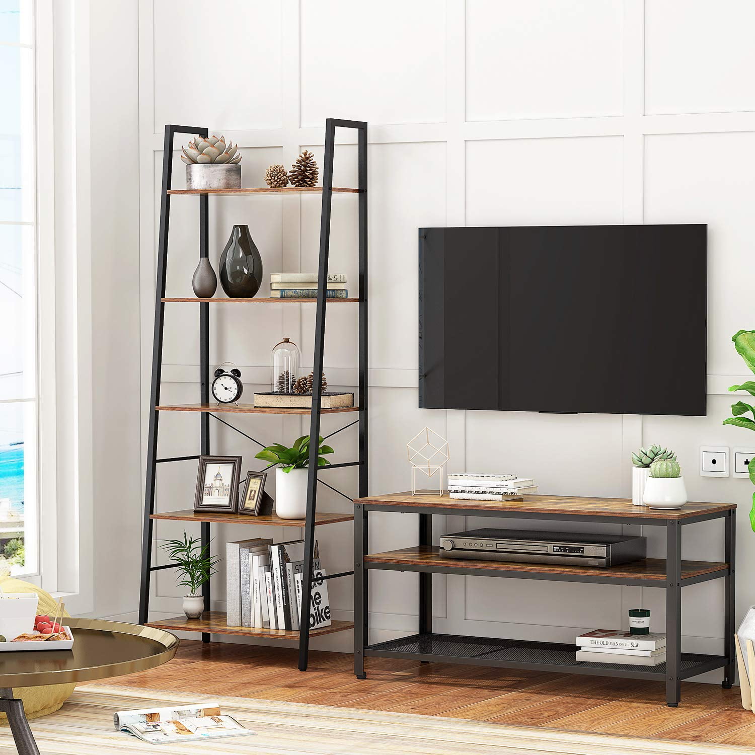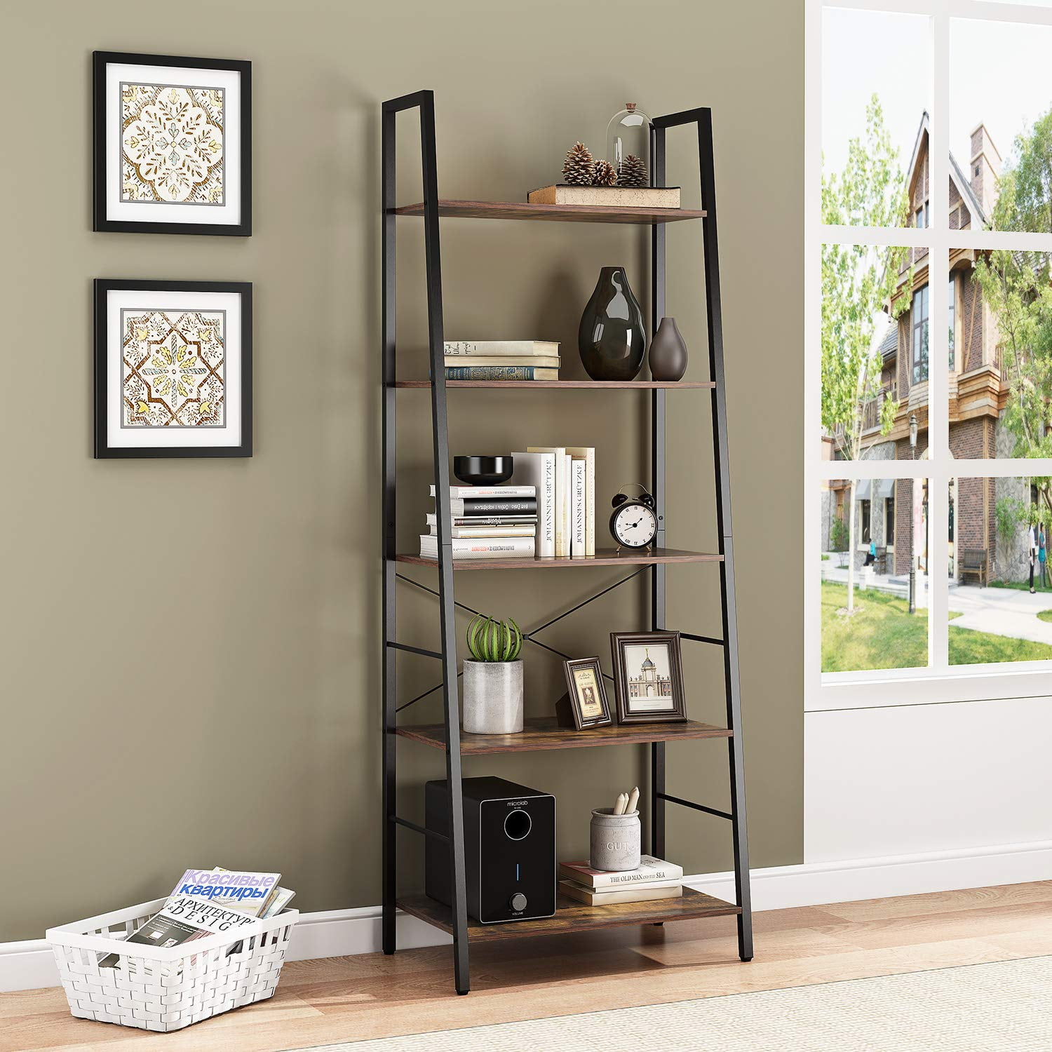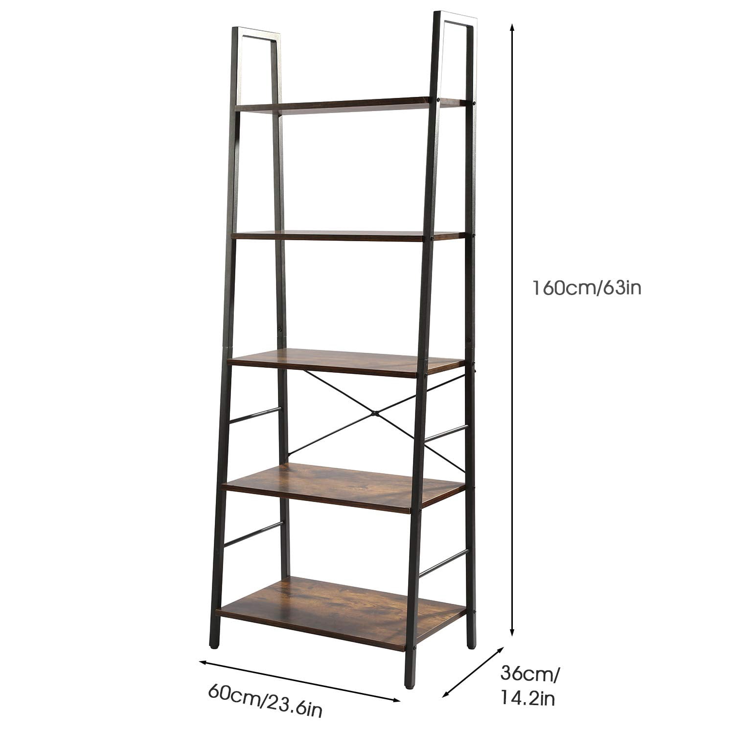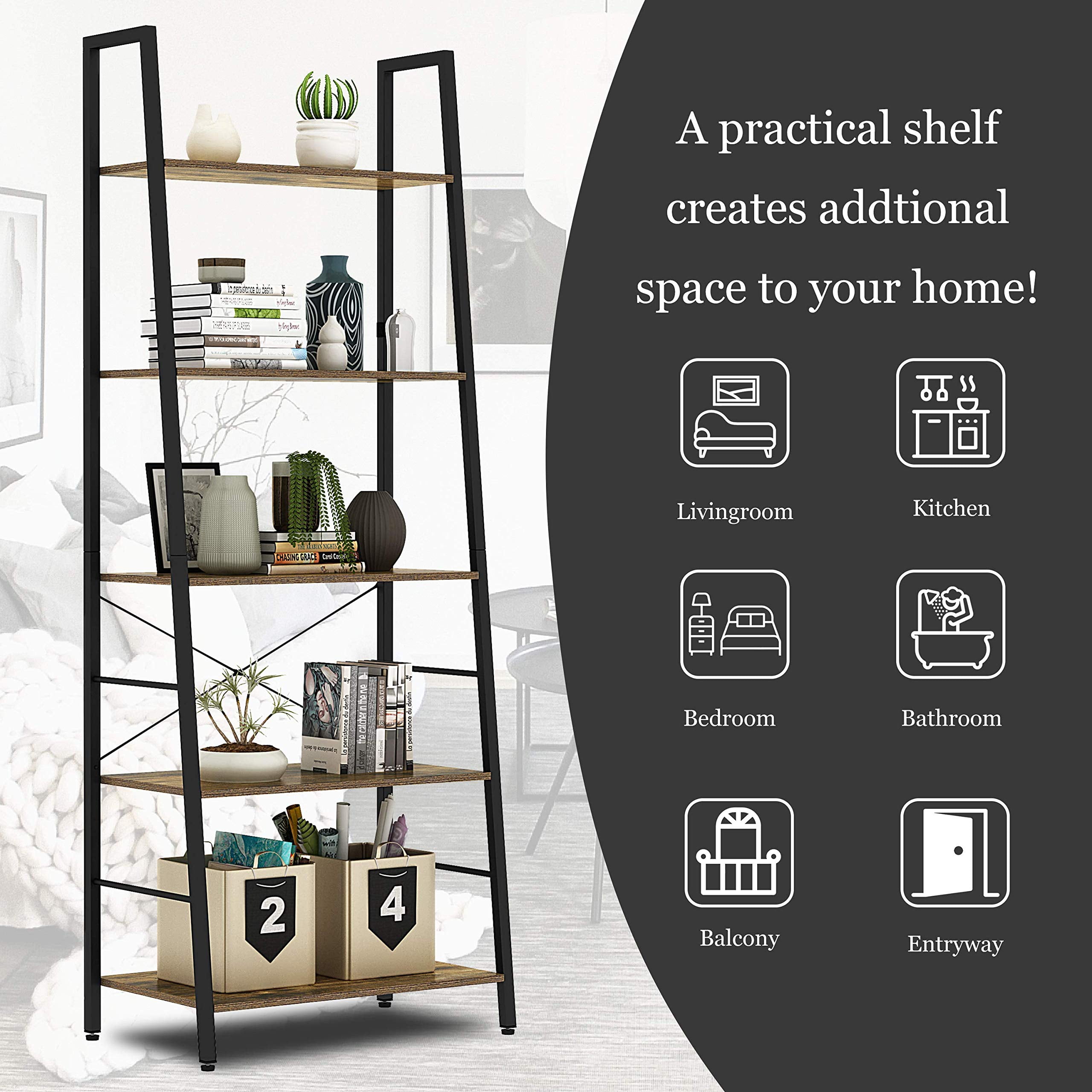 Yusong Bookshelf, Ladder Shelf 5-Tier Bookcase for Bedroom, Industrial Book Shelves Storage Rack with Metal Frame for Home Office, Rustic Brown