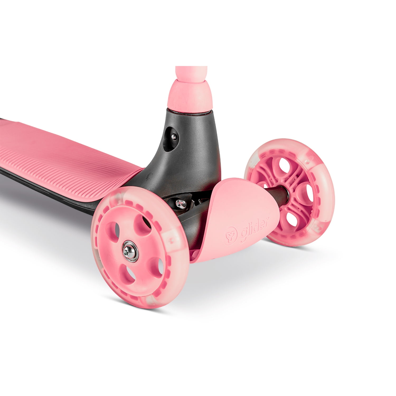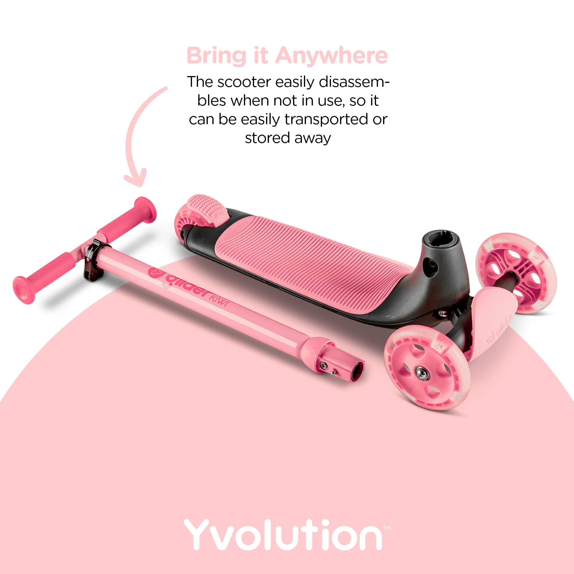 FRESH DESIGN – The Glider Kiwi is a sleek new scooter with a curved design that comes with easy grip handlebars and an extra-wide deck and rear break. The scooter is incredibly lightweight, allowing both you and your children to carry it effortless. SHINE BRIGHT – The Glider Kiwi rolls in with its dazzling, extra-wide LED front wheels, giving it a vibrant glow that’s sure to turn heads and light up the streets for safer adventures! GROW WITH ME – The handlebars adjust in three settings, perfect for growing with kids aged 3 – 8 years or up to 55 lbs / 25kg. At a push of a button, the handlebar can also be removed for easy transport and storage. SAFETY FIRST – Featuring a wide rear wheel, extra-wide deck, and rear brake for quick stops, the Y Glider Kiwi keeps kids secure. RAINBOW OF FUN – Available in a range of colors, it’s the perfect ride for endless adventures! Age Range: 3-8 years old 3 adjustable handlebar height settings: min = 22.63in / med = 26.57in / max = 26.57in Max Weight: 50kg/110lbs Product Weight: 2.5kg / 5.5lbs Extra-wide deck for side-by-side foot placement Smooth curved design Easy-release adjustable handlebar Durable cast PU wheels Wide read break and wheel Ergonomic handle grips perfect for those tiny hands Light Up Wheels Unisex 1 case