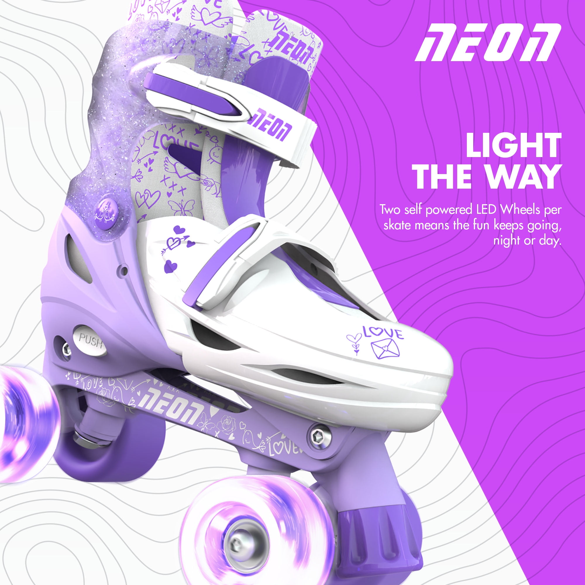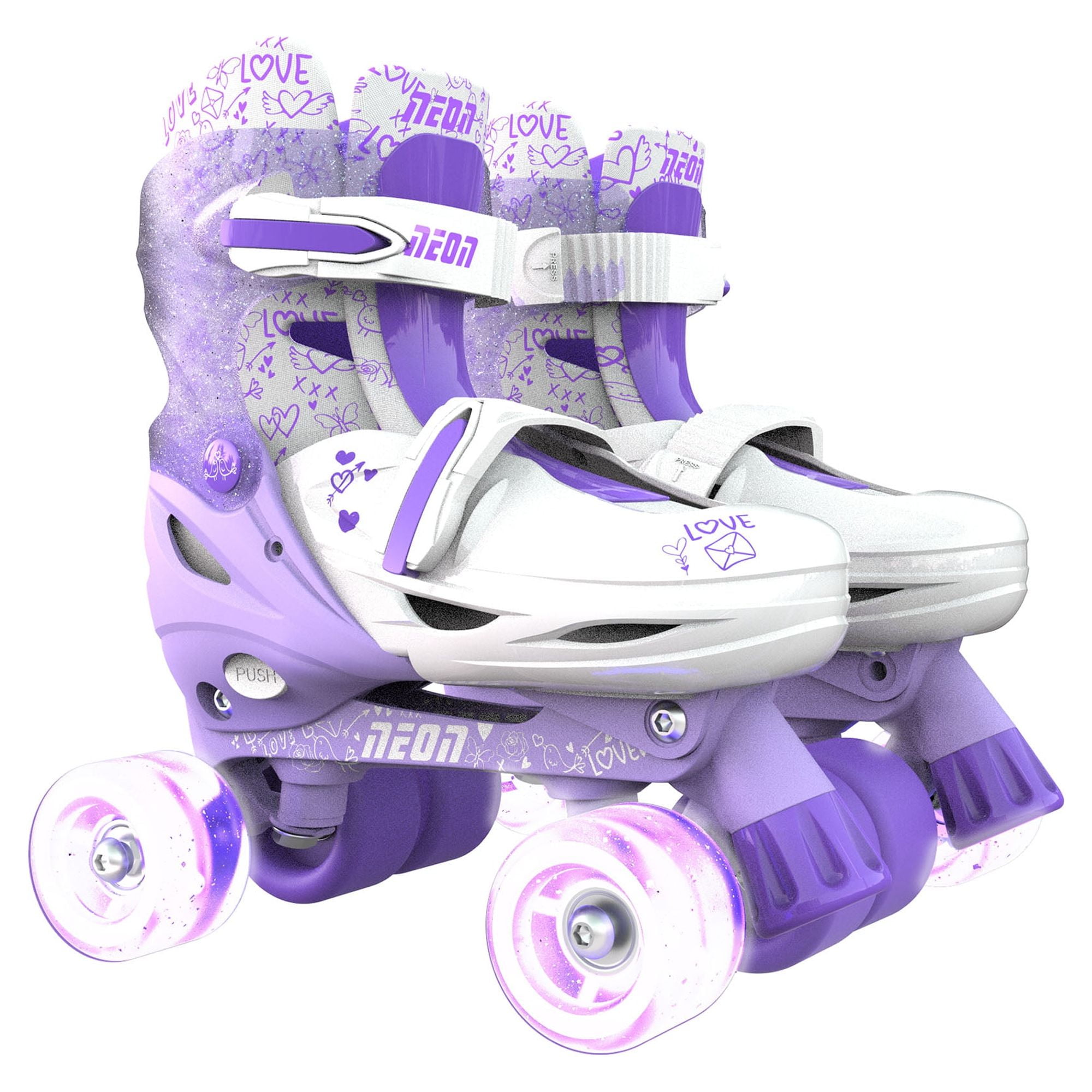 ADJUSTABLE SIZING – Enjoy versatility with our Combo Skates, available in two adjustable sizes: US (12-2): 7.28″ – 8.08″, and, US(3-6): 8.45″ – 9.45″. Changing the size of these skates is a breeze – just press the button to move the interior toe cap back and forth in the boot to increase or decrease the size as needed. Experience the perfect fit for your skating adventures! TRIPLE PROTECTION FOR ULTIMATE SAFETY – Our kids’ skates are equipped with a comprehensive triple protection system to ensure the safety of young skaters. Featuring a sturdy velcro strap, high-strength buckle, and secure laces, these measures work together to provide maximum security and support during skating sessions. Added reassurance double brake design for safety and stability. COLORFUL AND AUTOMATIC LIGHTING – Our skates feature vibrant LED wheels that light up in both modes, creating a stunning glow effect with every roll! What’s more, these wheels illuminate without the need for batteries. Perfect to enhance safety by increasing visibility in low-light conditions. Enjoy a magical skating experience with our automatic lighting colorful wheels. SIZE CHART – US (12-2): 7.28″ – 8.08″, US(3-6): 8.45″ – 9.45″. HIGH PERFORMANCE – Enjoy smooth and effortless gliding with our high-speed mute 608Z metal bearing. Designed for precision and durability, these bearings ensure a seamless ride, allowing you to skate with ease and confidence. Please check the size before placing the order. Age: 5+ Product weight: 2.4kg | 5.29lbs Adjustable sizing and buckles Heel Brake (Inline mode) | Toe Stop (Quad mode) LED light-up wheels, no batteries required Inner liner is breathable and machine washable 1 case