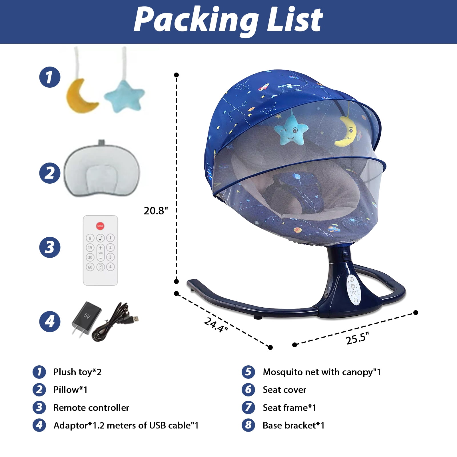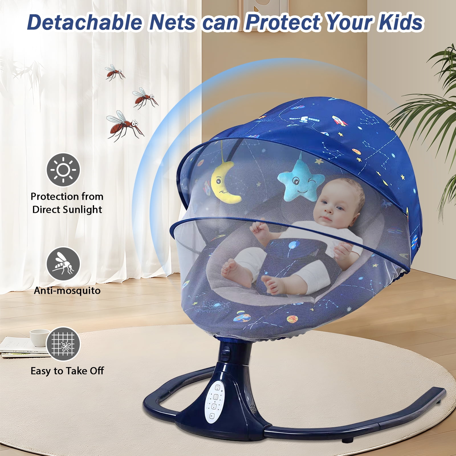 【3 Gear Adjustable Seat】– Adjustable seat helps to help adjust the baby’s lay position and find a more comfortable position for the baby. 【Great Relief for Moms & Dads】–Featuring 4 swing speeds, this baby swing moves at a constant speed so babies can quickly get familiar and fall in love with its pace. It relieves moms and dads from holding the baby all day and especially at midnight. Anytime needed, it swings your baby, comfortably and soothingly. 【Sweet Lullabies & Timing Function】–This baby swings comes with 12 built-in lullabies. It supports connecting to your phone ,so you can play the lullaby you want to play, which can soothe the crying baby. 【Ergonomics for Comfort & Safety】–The baby swing protects the baby’s spine well, and at the same time makes him/her feel like he/she is in the arms of the mother,and mosquito nets protect your child from mosquito bites. giving him/her enough security. 【Easy to Use】 — Made for easy use, it can work once connected to a power outlet, requiring no batteries or charging. With a convenient control panel and remote control, you can play lullabies, set a timer, adjust the swing angles or turn on mode with just a press when you’re doing housework or busy in your e-meeting. 【Detachable & Machine Washable】–The detachable fly-net, pillow, and seat cover add great convenience for machine wash. It measures 25.5″ x 27.5″ x 20.8″, fitting in most rooms easily.Product SpecificationsBrand: LPAMEOIUMaterial: Alloy Steel/ Polyester Fiber/ ABSColor: Blue; PinkSize: 25.5″ x 27.5″ x 20.8″Applicable Age: 0-12 MonthsWeight: Below 44lbsDesign: Electric,with USB InterfacePower Supply: 5v/1aPower: 1-3wStyle: CartoonWeight: 8.8lbsWireless_technology: Bluetooth