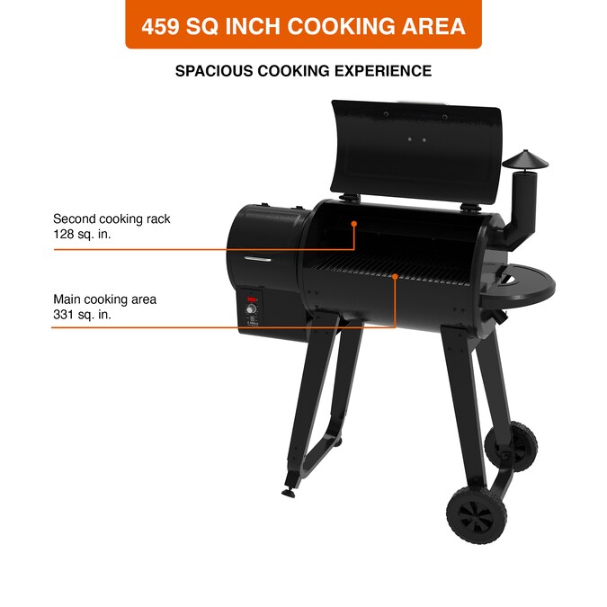 - Huge 459 sq in grilling area, 15 lbs hopper capacity, foldable working shelf, heavy-duty all-terrain wheels, rustproof cover and racks