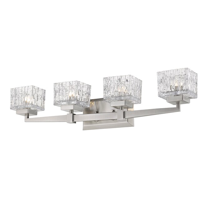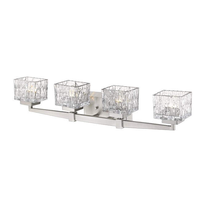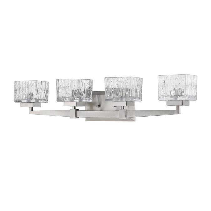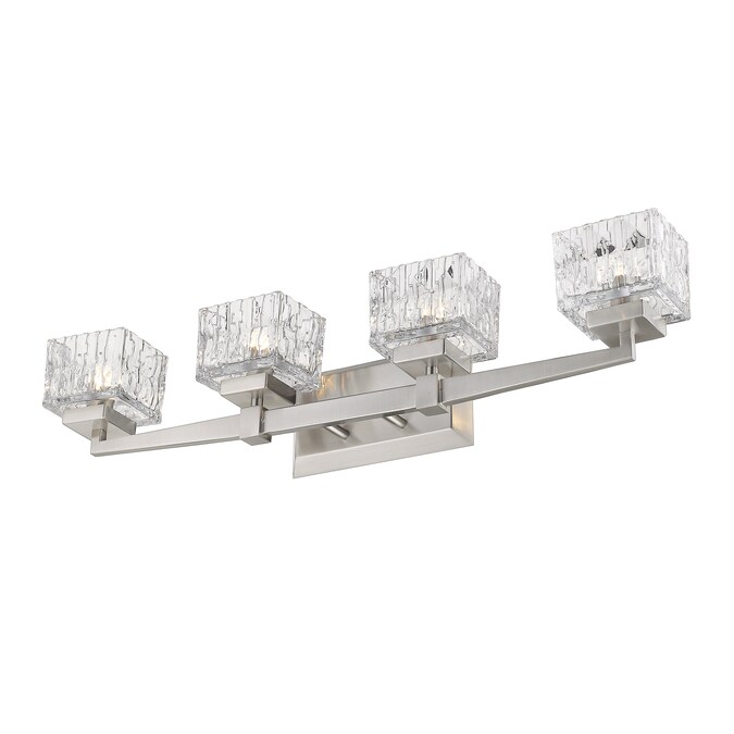 A new personality emerges in a contemporary bath space with the addition of this brushed steel finish four-light vanity light. Chic detailing transforms a steel frame into a work of art complete with crystal cut clear glass shades for an energetic effect.