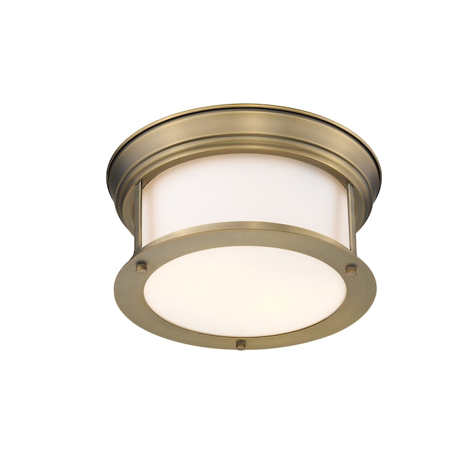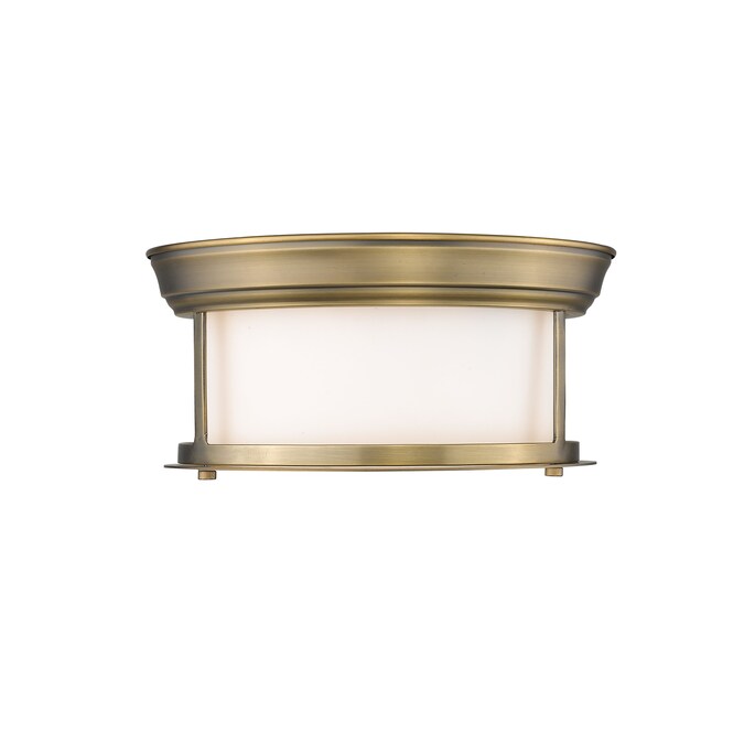 Let classic design create sophistication in a transitional living space. A wide cylindrical clear seedy glass shade nested in an open metal frame with a sleek Heritage Brass finish places this two-light flush mount ceiling light in a class of its own.