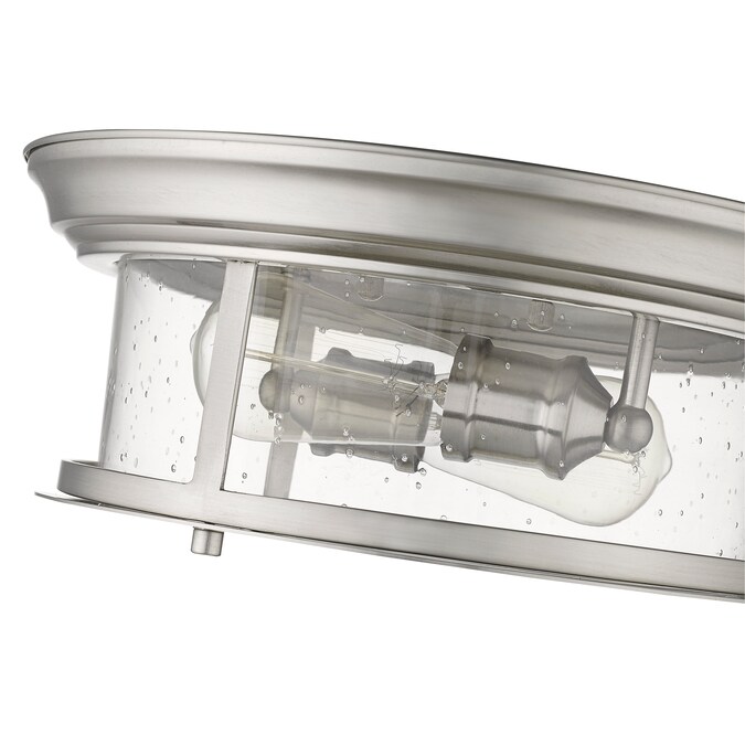 Cool industrial ambiance offers a stylish look to transitional spaces in need of functional, fashionable fixtures. With gorgeous Brushed Nickel finish metal providing a circular cage-like frame and a wide cylindrical clear seedy glass shade completing its visual package, this two-light flush mount ceiling light offers a focal point in a redesigned space devoted to carefree living.