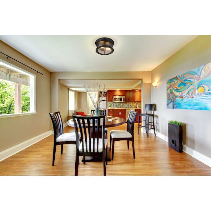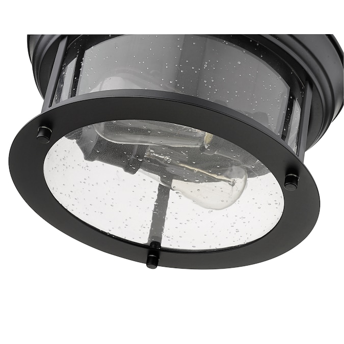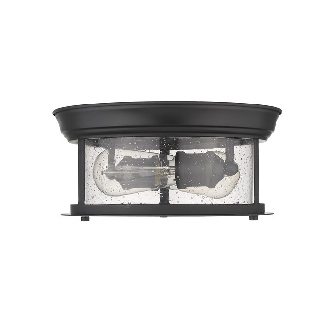 Cool industrial ambiance offers a stylish look to transitional spaces in need of functional, fashionable fixtures. With bold Matte Black finish metal providing a circular cage-like frame and a wide cylindrical clear seedy glass shade completing its visual package, this two-light flush mount ceiling light wraps up a custom kitchen or living area design.