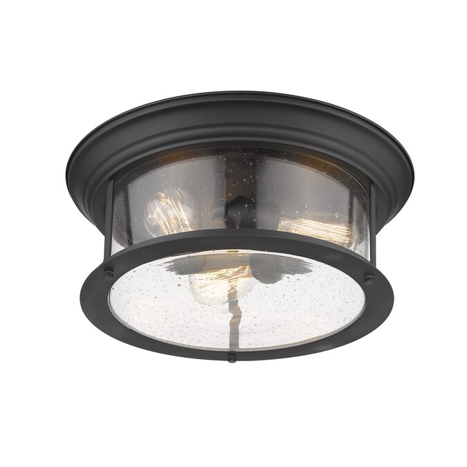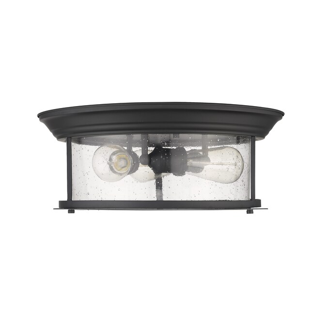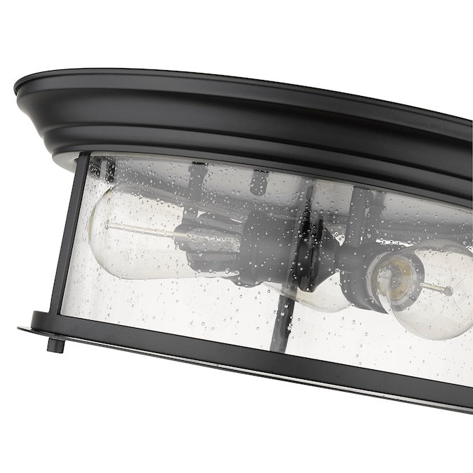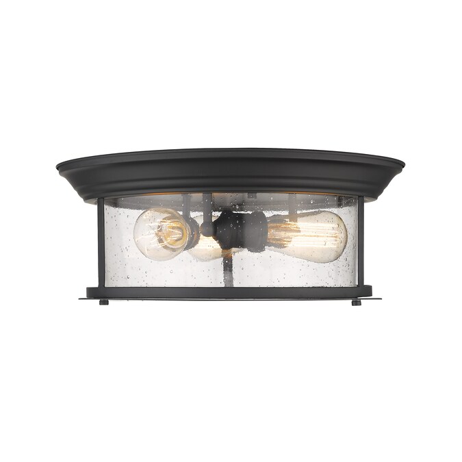 Cool industrial ambiance offers a stylish look to transitional spaces in need of functional, fashionable fixtures. With bold Matte Black finish metal providing a circular cage-like frame and a wide cylindrical clear seedy glass shade completing its visual package, this three-light flush mount ceiling light becomes an integral part of an overall design scheme as it delivers ambient lighting.