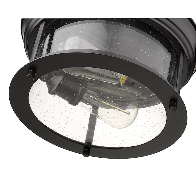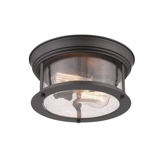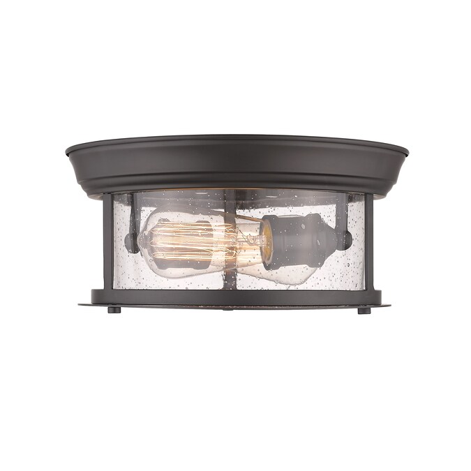 Cool industrial ambiance offers a stylish look to transitional spaces in need of functional, fashionable fixtures. With beautiful Bronze finish metal providing a circular cage-like frame and a wide cylindrical clear seedy glass shade completing its visual package, this two-light flush mount ceiling light wraps up a custom kitchen or living area design.