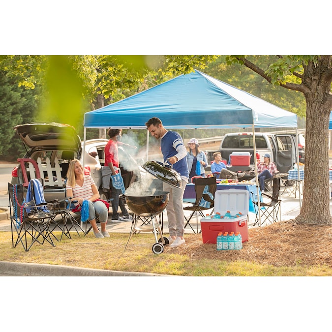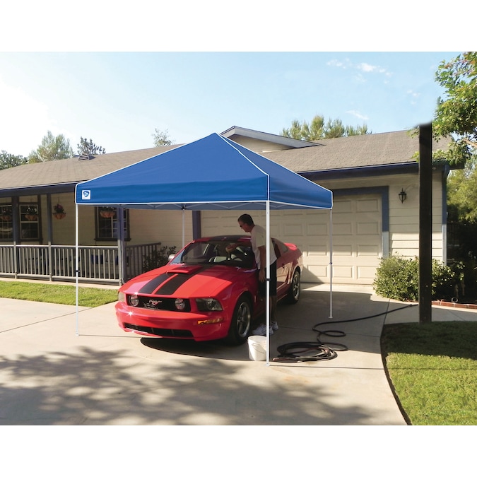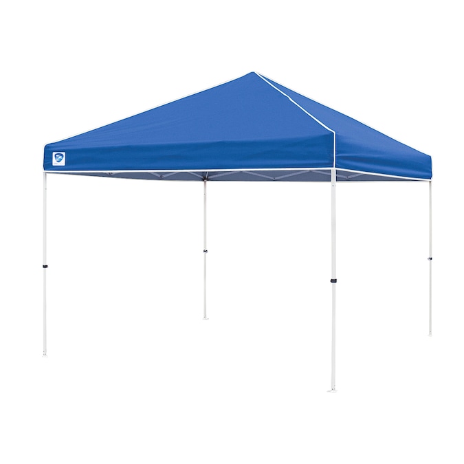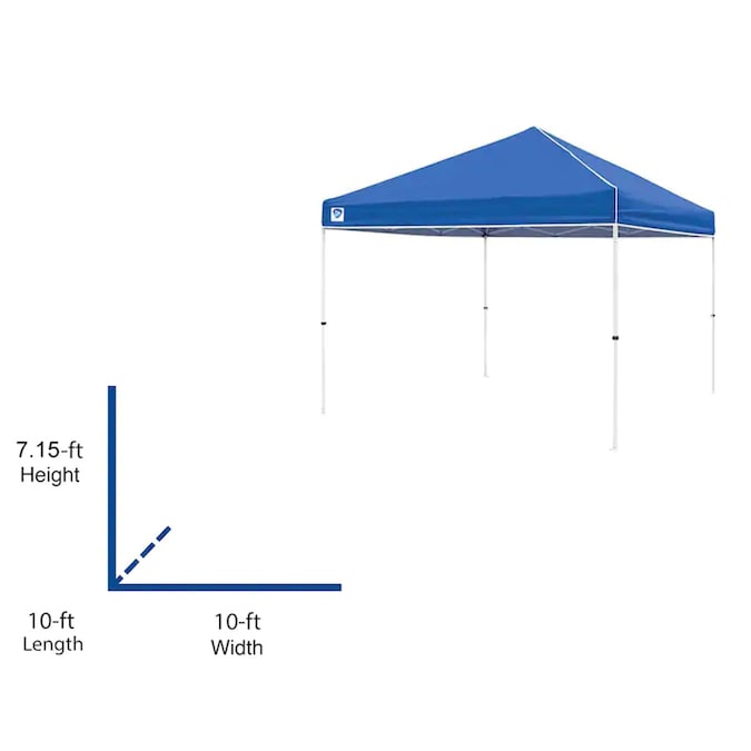Steel 10 ft – 10 ft canopy with roller bag. White powder coated steel tube with 150D blue polyester fabric. Adjustable leg height, easy to assemble.
