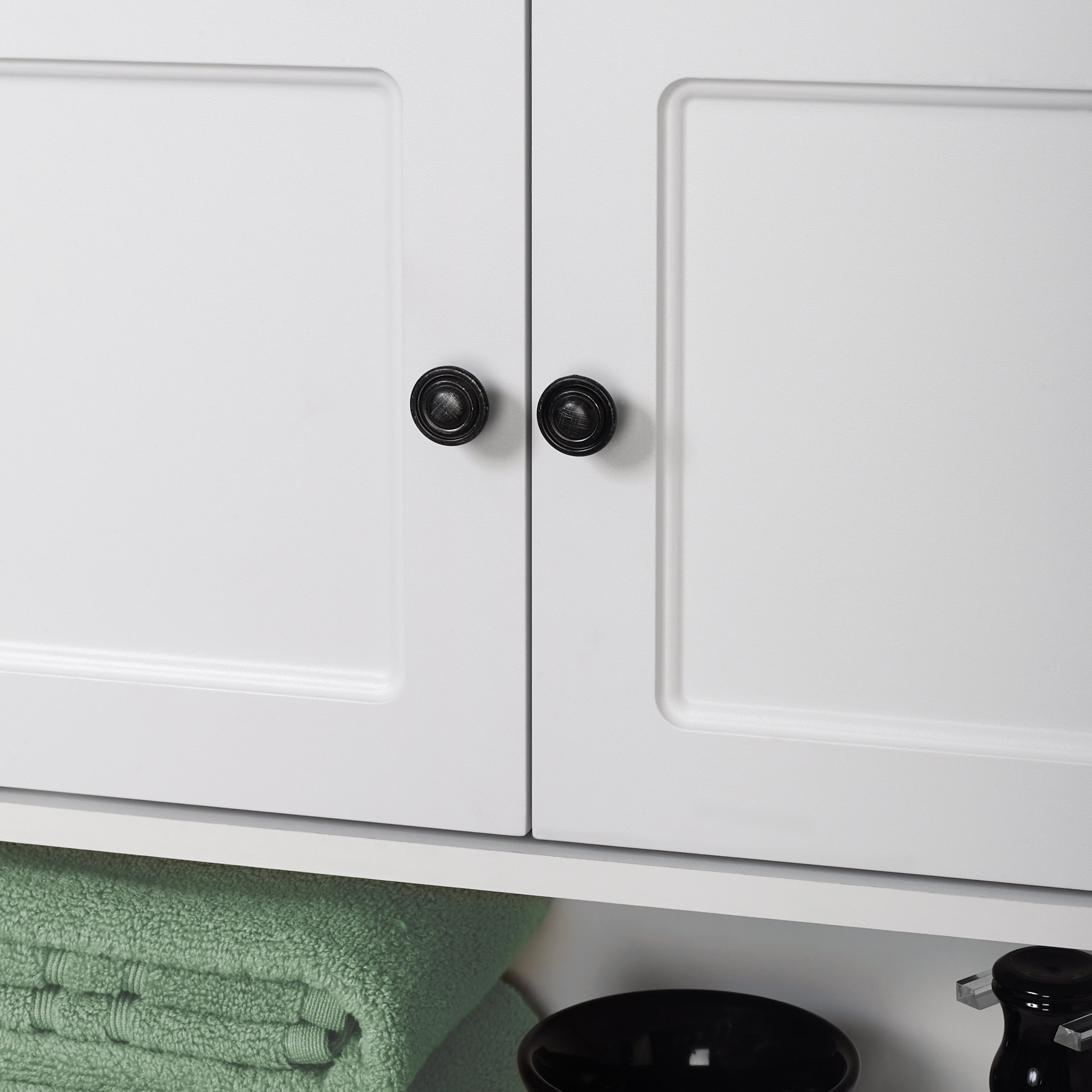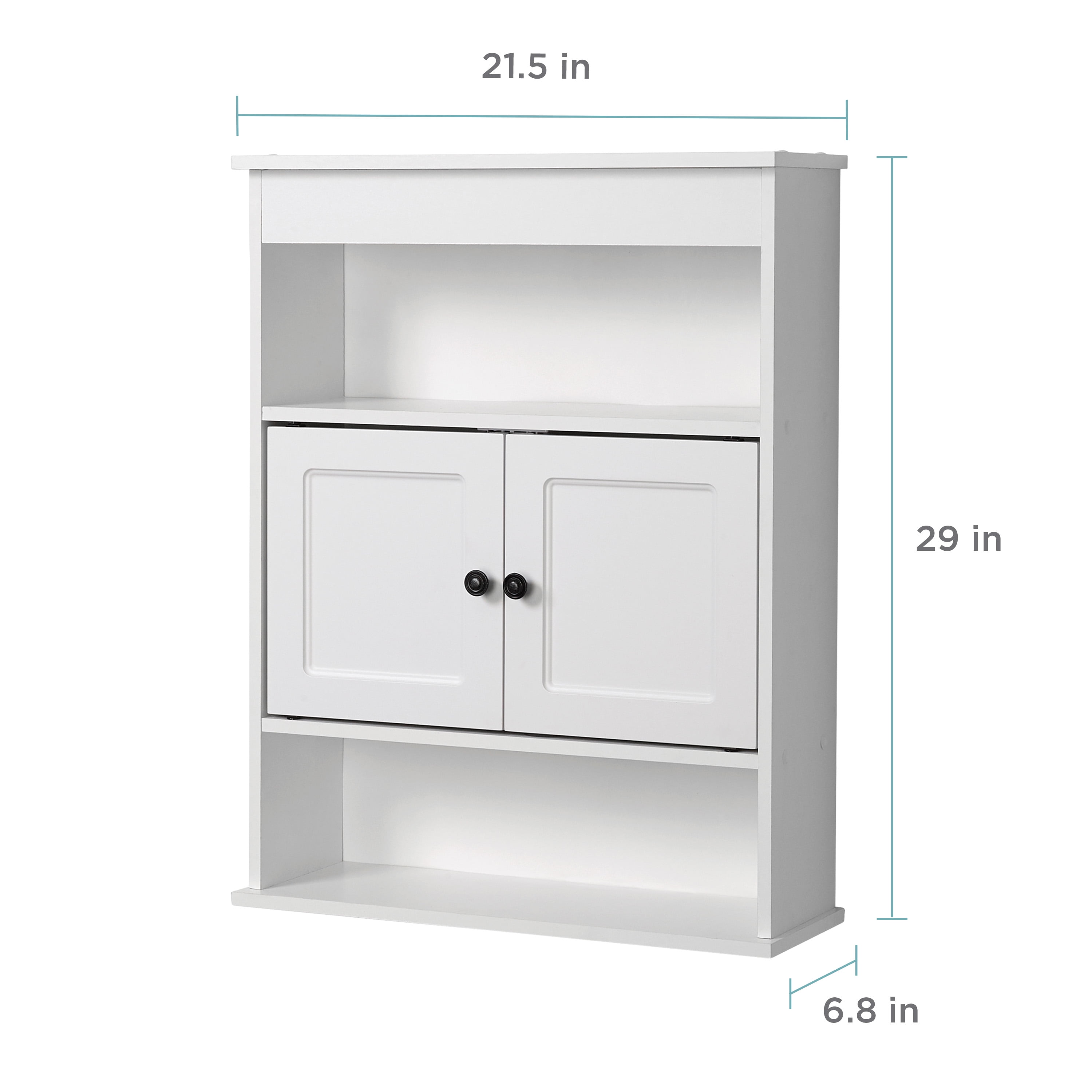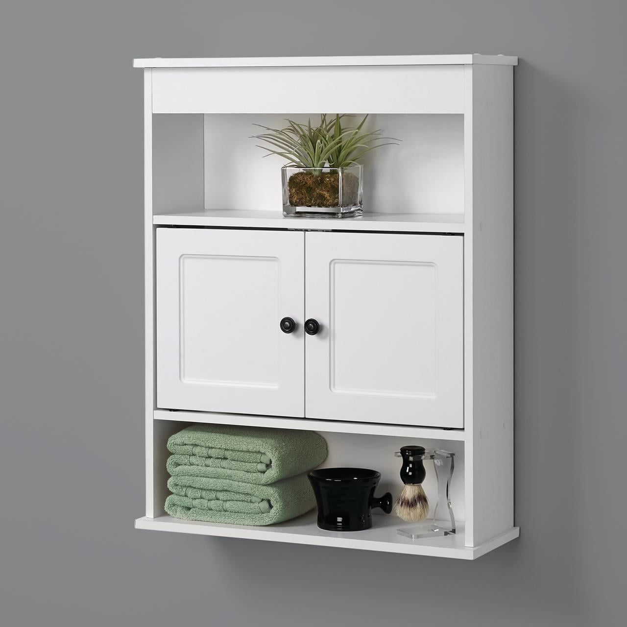Versatile wall cabinet helps you regain control of a cluttered bathroom Cabinet features 3 shelves total (2 open shelves plus 1 concealed shelf behind its doors); great for storage and display Perfect for bathroom, but use in any room with limited space Features finished edges and a moisture-resistant laminated backer Cabinet’s white finish looks great in any room setting Easy to assemble and includes hardware and step-by-step instructions for surface-mount installation
