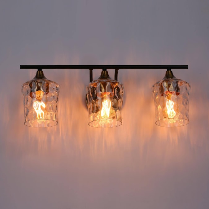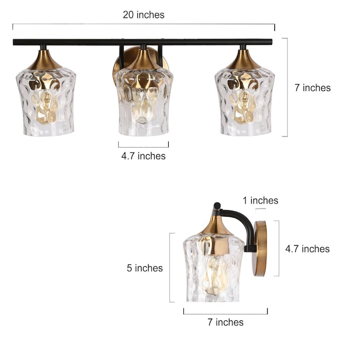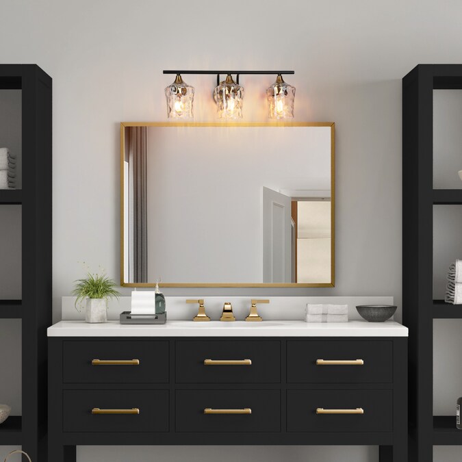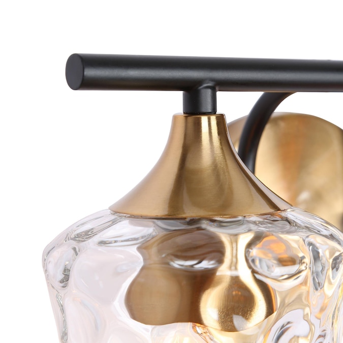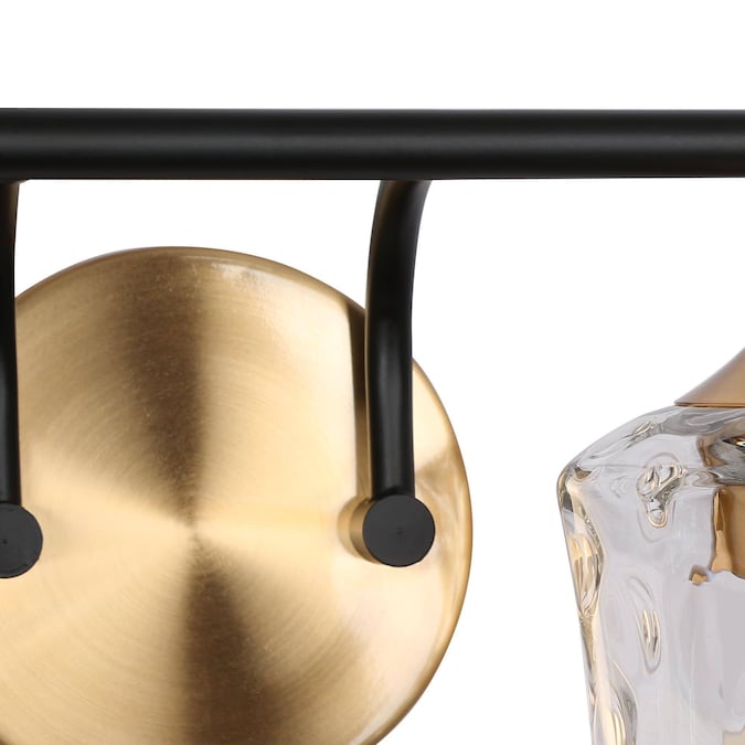 This vanity light stands out with its uniquely-designed water glass shades. The 3-light bath and vanity fixture features clear water glass shades paired with a sleek black finish and plated brass gold accents, creating a stunning visual contrast. Merging form and function, this light fixture is truly versatile, complementing a wide range of design spaces from modern farmhouse to contemporary and transitional interiors. Perfect for adding a touch of refined elegance to any bathroom, hallway, or vanity area.