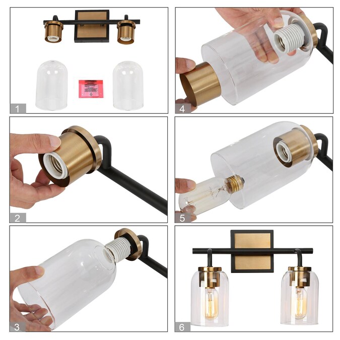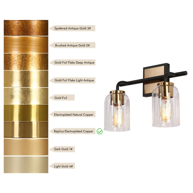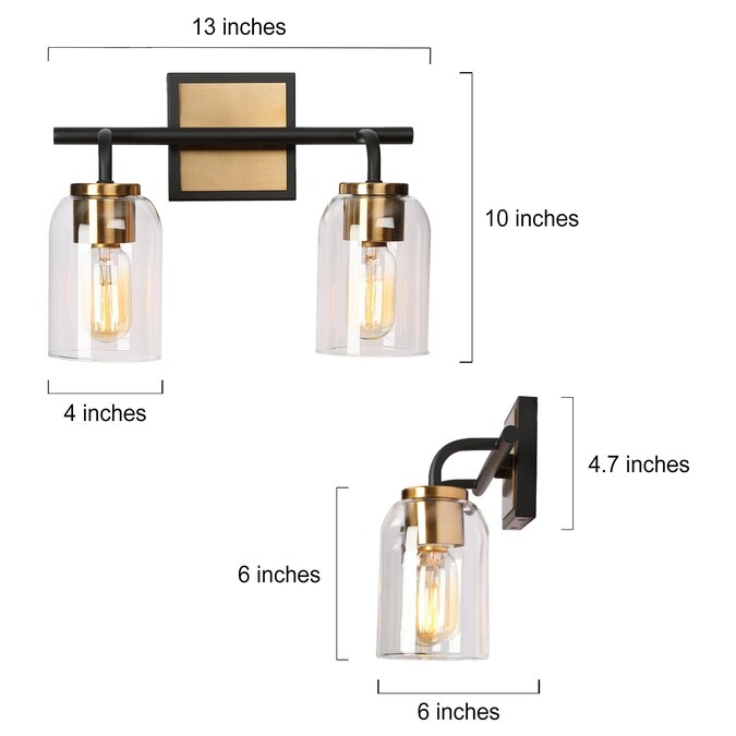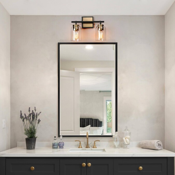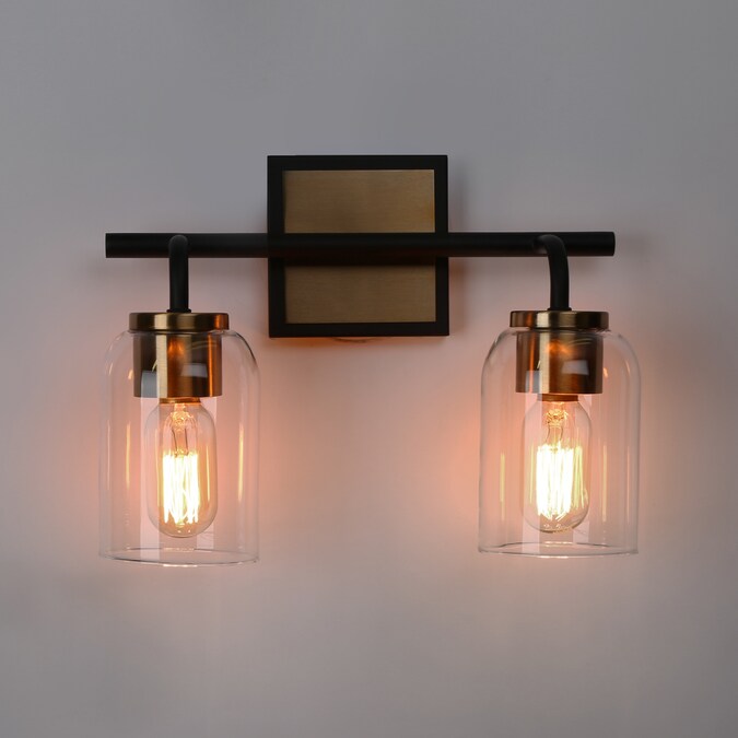 Consisting of a slender metal bar and individual curved arms, this 2-light bath bar vanity light is a perfect blending of modern, classic, and traditional elements, bringing a new modern yet vintage look for your house decor. The black frame on the outside of the brass canopy and the no-exaggerated curves present careful design in detail and make the wall light more distinctive. With cylinder clear glass shades and higher compatible bulb wattage (60W maximum), there is no worry about the brightness in your bathroom, powder room, entryway, and any other space you want to update.