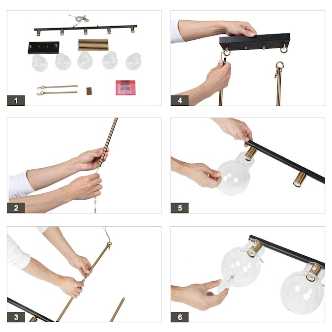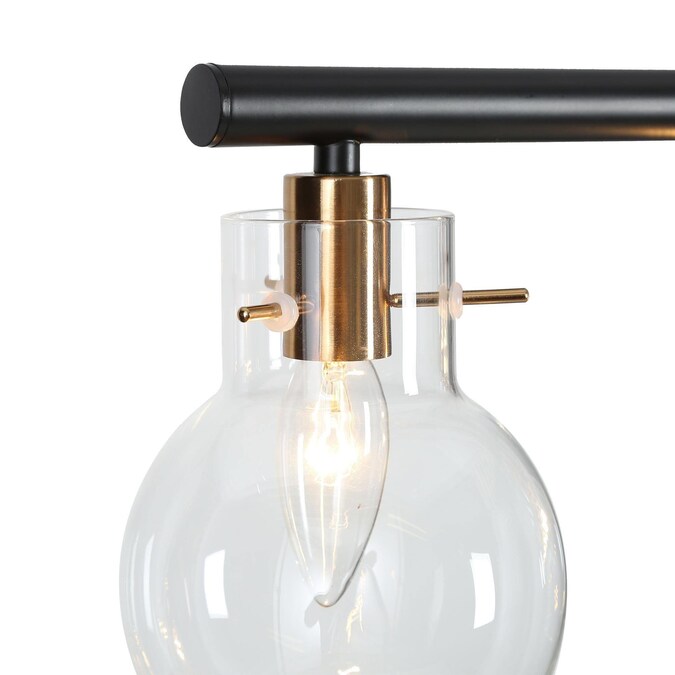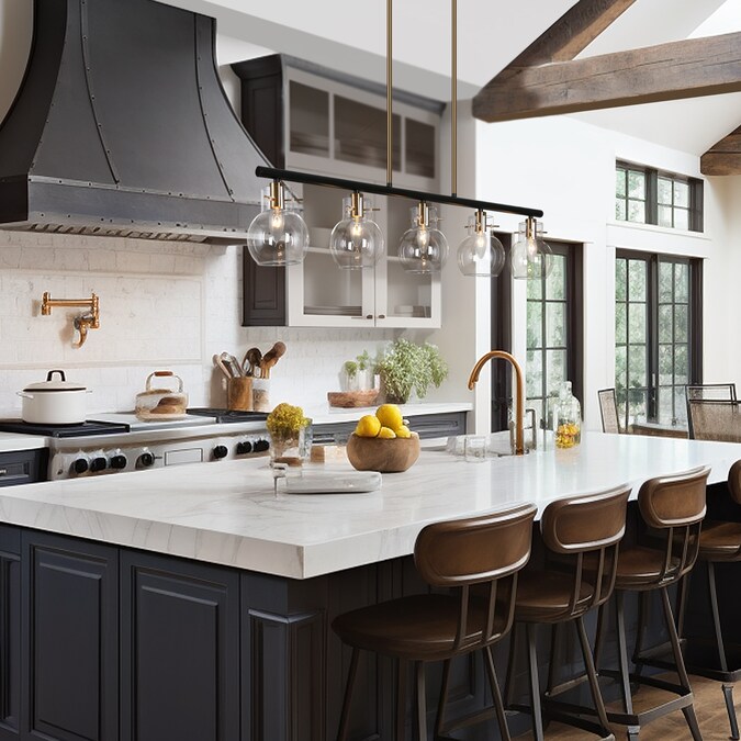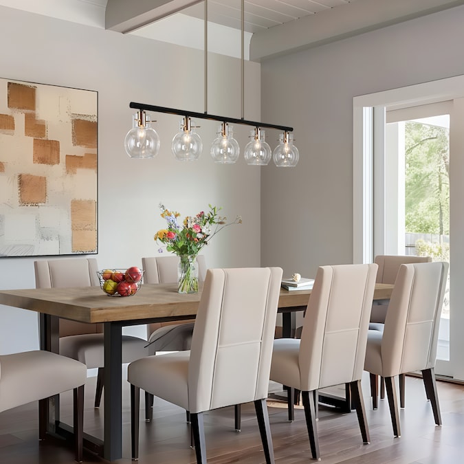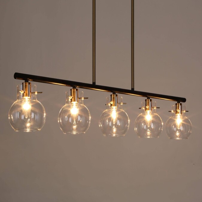 Elevate your kitchen’s ambiance with this stunning 5-light kitchen island lighting fixture. Featuring a sleek metal frame in a sophisticated matte black and plated brassy gold finish, it showcases five clear globe glass shades for a modern yet timeless appeal. Measuring 38 inches in length, this linear chandelier is height adjustable from 12 inches to 72 inches, making it perfect for both high and low ceilings. Designed to accommodate E12 40W bulbs (not included), this dining room light fixture is fully dimmable when paired with dimmers and dimming bulbs (both not included), allowing you to customize your lighting experience. Easy to install, this black and gold chandelier comes with a 2-year warranty and offers free replacement for any broken or missing parts. Add a touch of elegance to your kitchen with this versatile and stylish lighting solution.