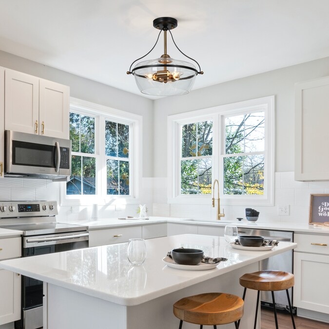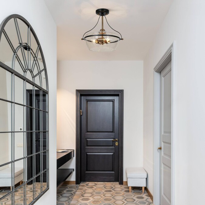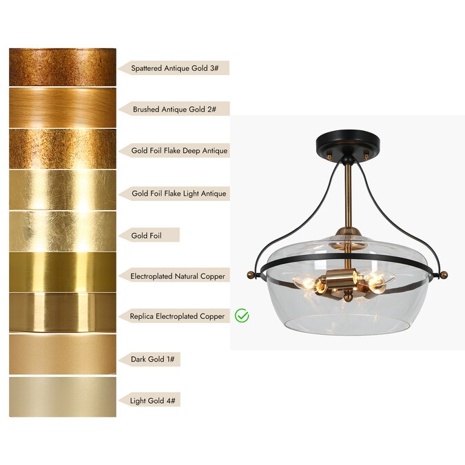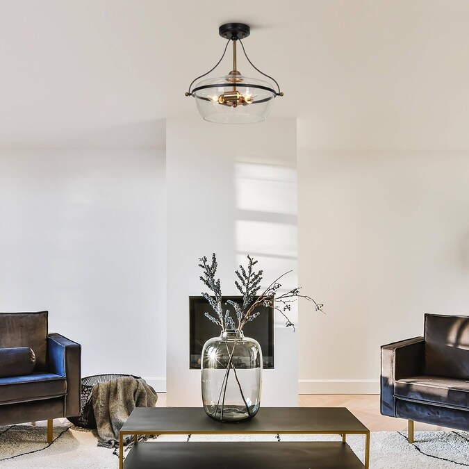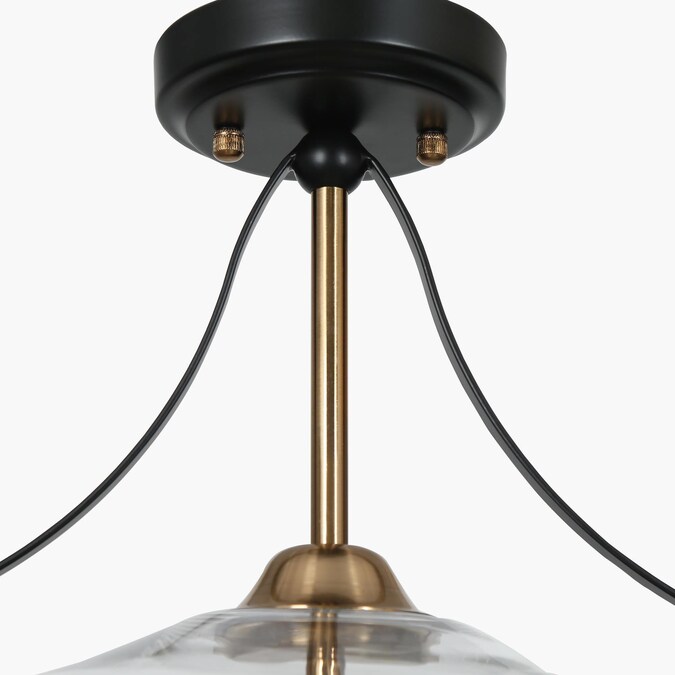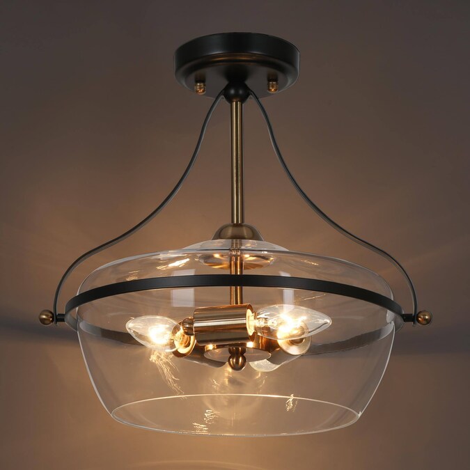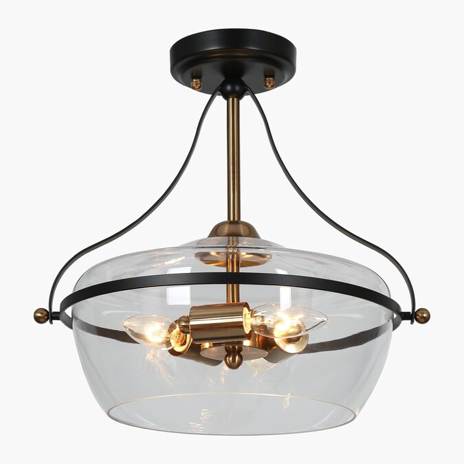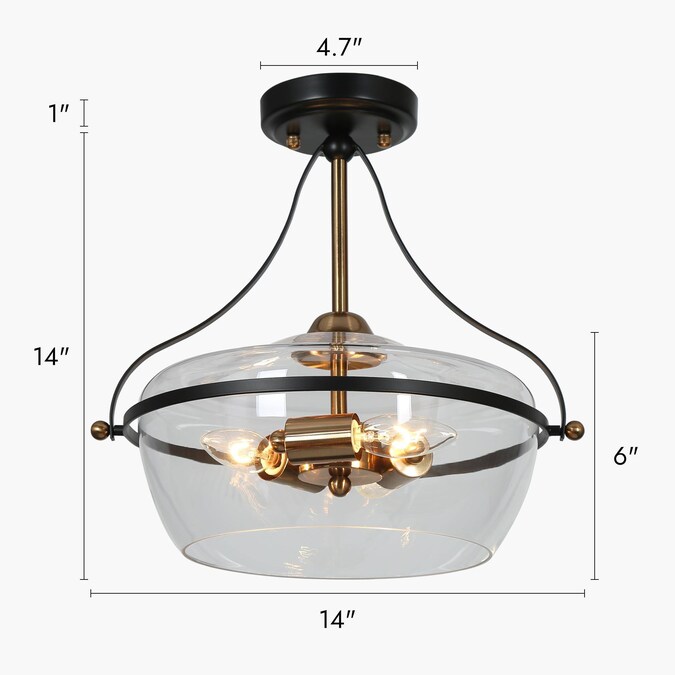 Illuminate your space with this stunning 3-light semi-flush mount lighting fixture. Showcasing a sleek metal frame in a matte black and plated brassy gold finish, this ceiling light fixture is topped with a large clear glass shade, making it a stylish addition to any room. Measuring 14 inches in diameter, it offers a perfect blend of modern elegance and functional lighting. Compatible with E12 40W bulbs (not included), this black gold ceiling light is fully dimmable when paired with dimmers and dimming bulbs (both not included), allowing you to create the perfect ambiance. Enjoy peace of mind with free replacement for any broken or missing parts. Ideal for foyers, living rooms, or dining areas, this modern light fixture enhances your home with its sophisticated design and warm illumination.