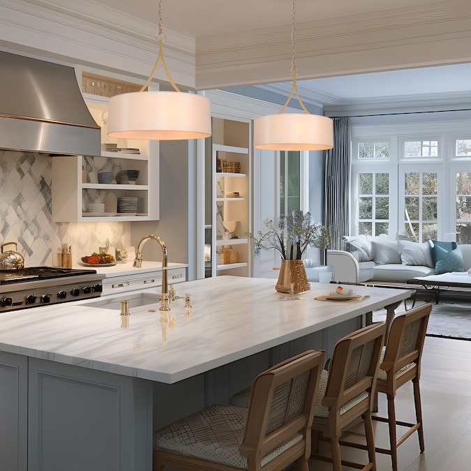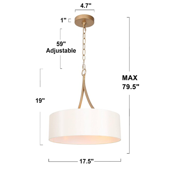 The 3-light drum chandelier is a stunning lighting fixture that features a matte gold finish, perfect for adding a touch of elegance to any home decor. Designed with a drum-shaped structure and surrounded by a fabric shade that diffuses the light sources, this gold chandelier creates a soft, warm ambiance in any room. With a durable gold metal chain that can be easily adjusted to achieve the desired height, it is suitable for use in rooms with vaulted, sloped, or slanted ceilings. The pendant chandelier’s matte gold finish gives it a classic and timeless look, making it suitable for a variety of home decor styles, including the farmhouse, contemporary, traditional, and modern farmhouse. This modern drum chandelier is ideal for use in the dining room, kitchen island, living room, entryway, or foyer, where it can create a welcoming and cozy atmosphere while providing ample lighting for any occasion.