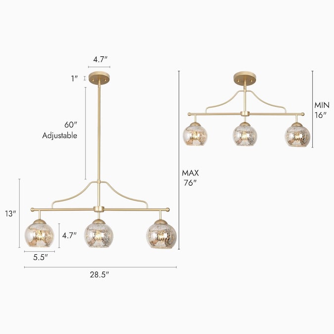 With a sleek modern design, this linear chandelier features a stunning satin gold finish, creating a bold statement piece that’s both stylish and versatile. The open-bottom mercury globe glass shades are a true highlight of this chandelier, creating a warm and inviting glow that illuminates any space with a soft, ambient light. Whether you’re entertaining guests or simply relaxing at home, this gold chandelier is sure to create the perfect atmosphere. One of the best features of this chandelier is its dimmable capability. When used with dimming bulbs and dimmer switches (not included), you can easily adjust the lighting to your desired level, making it ideal for any occasion. Additionally, the height of this chandelier is adjustable, allowing you to customize the placement to fit your specific needs. And, its versatile design makes it a perfect match for a wide range of home decor styles, including the contemporary, modern farmhouse, mid-century modern, transitional, and traditional. Whether you’re looking to add a touch of sophistication to your dining room, living room, or bedroom, this modern chandelier is sure to impress.
