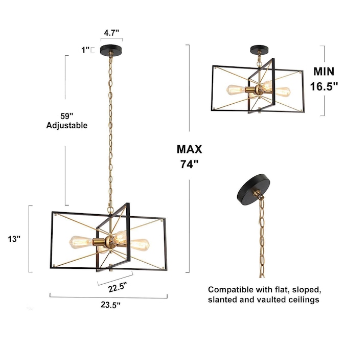 - Comes with an adjustable gold chain of 59-in and allows adjusting the hanging height of the ceiling light from 16.5-74 in