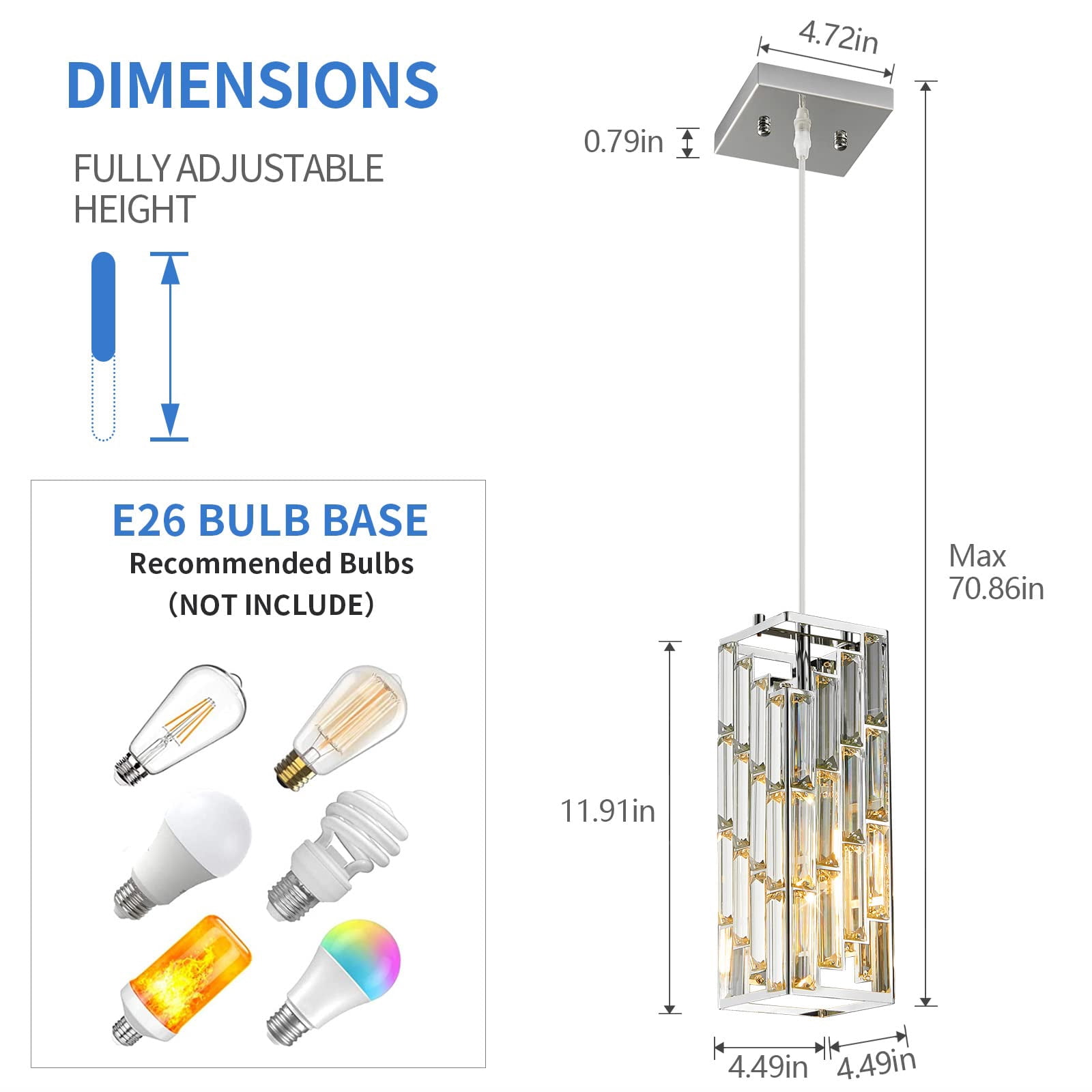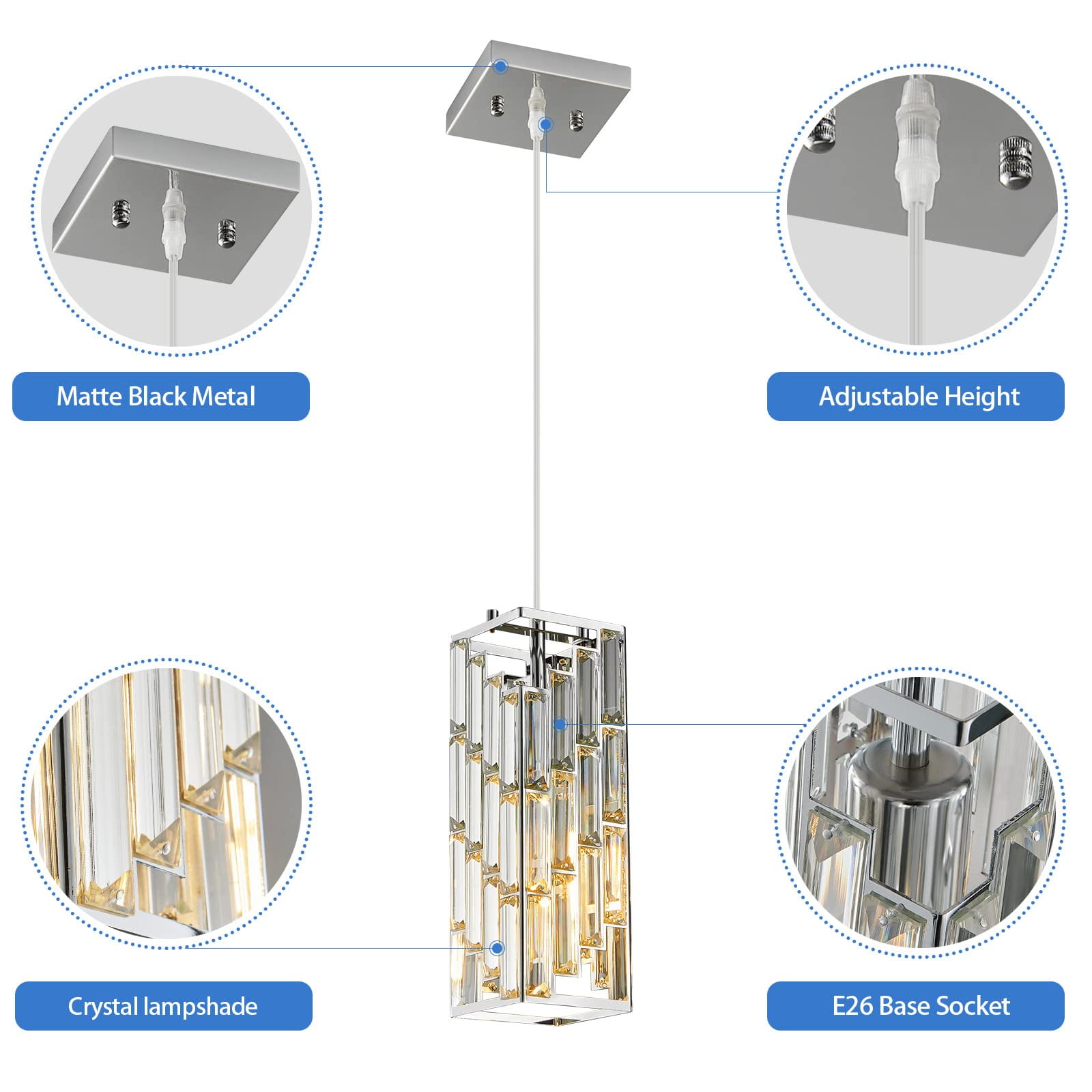 【Inspired design】The perfect combination of chrome finish metal and crystal brings charming retro and modern industrial charm, which matches most furniture styles and adds beautiful decoration to your home 【DimensionI】Chandelier base: 4.72 inches (about 12 cm) , Body length 11.91 inches (about 30.25 cm) high; Adjustable rope length: 0-70.86 inches (about 180 cm). 110-120V AC hardwired. Includes all installation hardware for quick installation. 【Bulb requirements】 This crystal light requires 1 x E26 base bulb (LED,CFL or Incandescent), 60W max. Fully dimmable when used with a dimmable bulb and dimmer switch (bulb and dimmer switch not included). 【Easy to install】 Soft Wired, no complicated installation procedures are required. This celling lamp is specially designed for the American standard junction box and can be installed horizontally or vertically for decoration. All required parts are included in the package. Note: For your safety, please install it under the guidance of an electrician. 【After-Sales SUPPORT】 We provide the best customer service. 100% Refund/Replacement for any quality problems. If you have any questions about the mini pendant lighting just feel free to contact us.