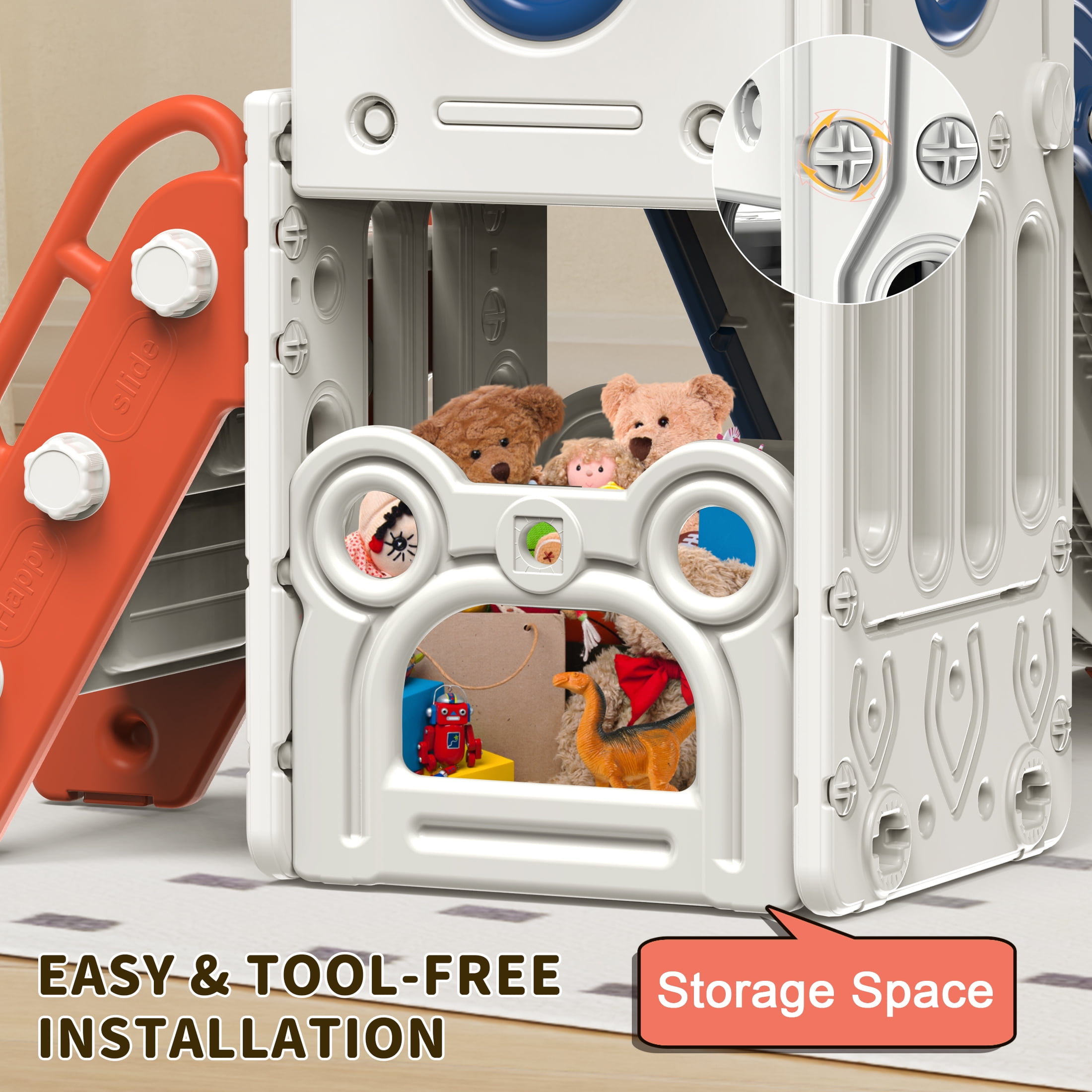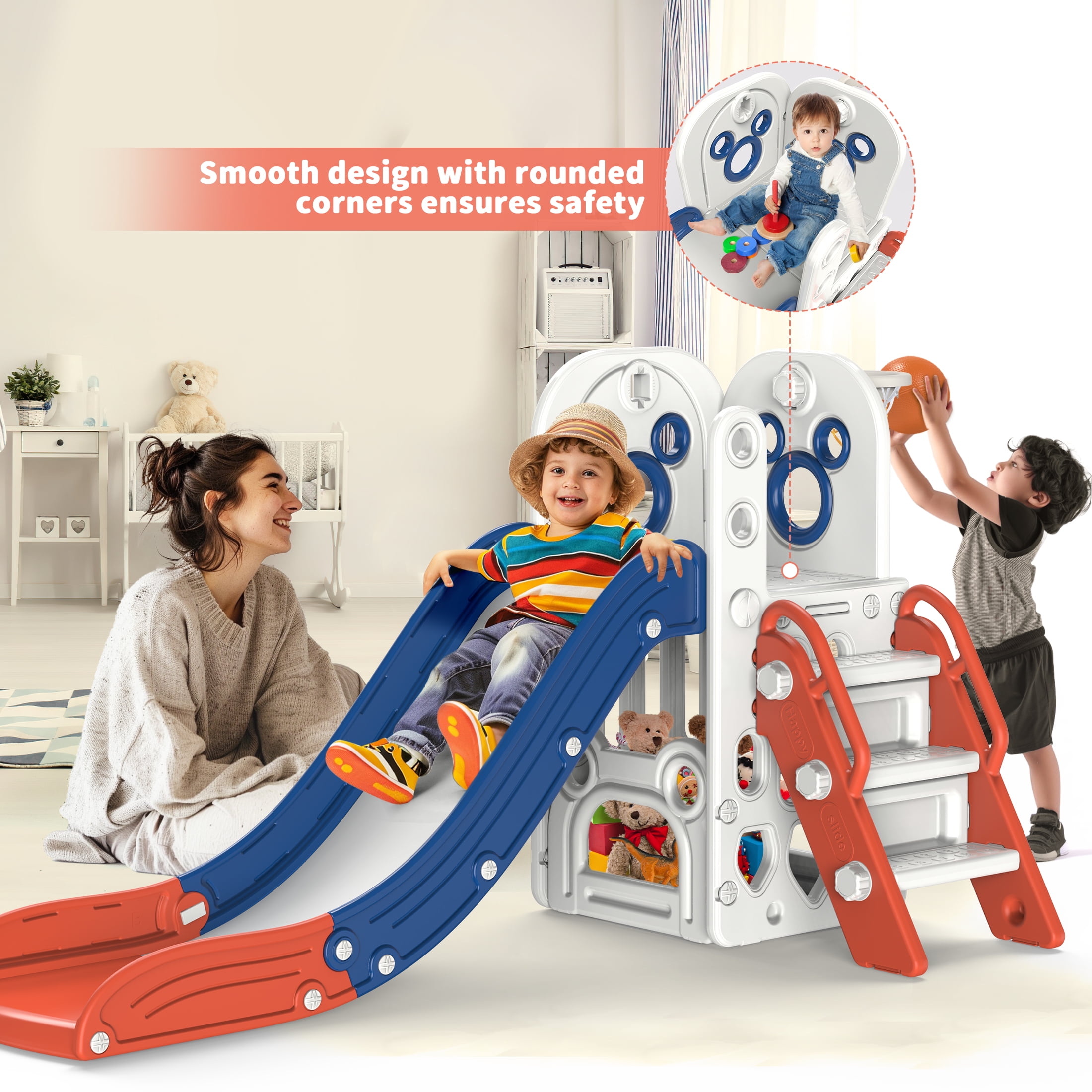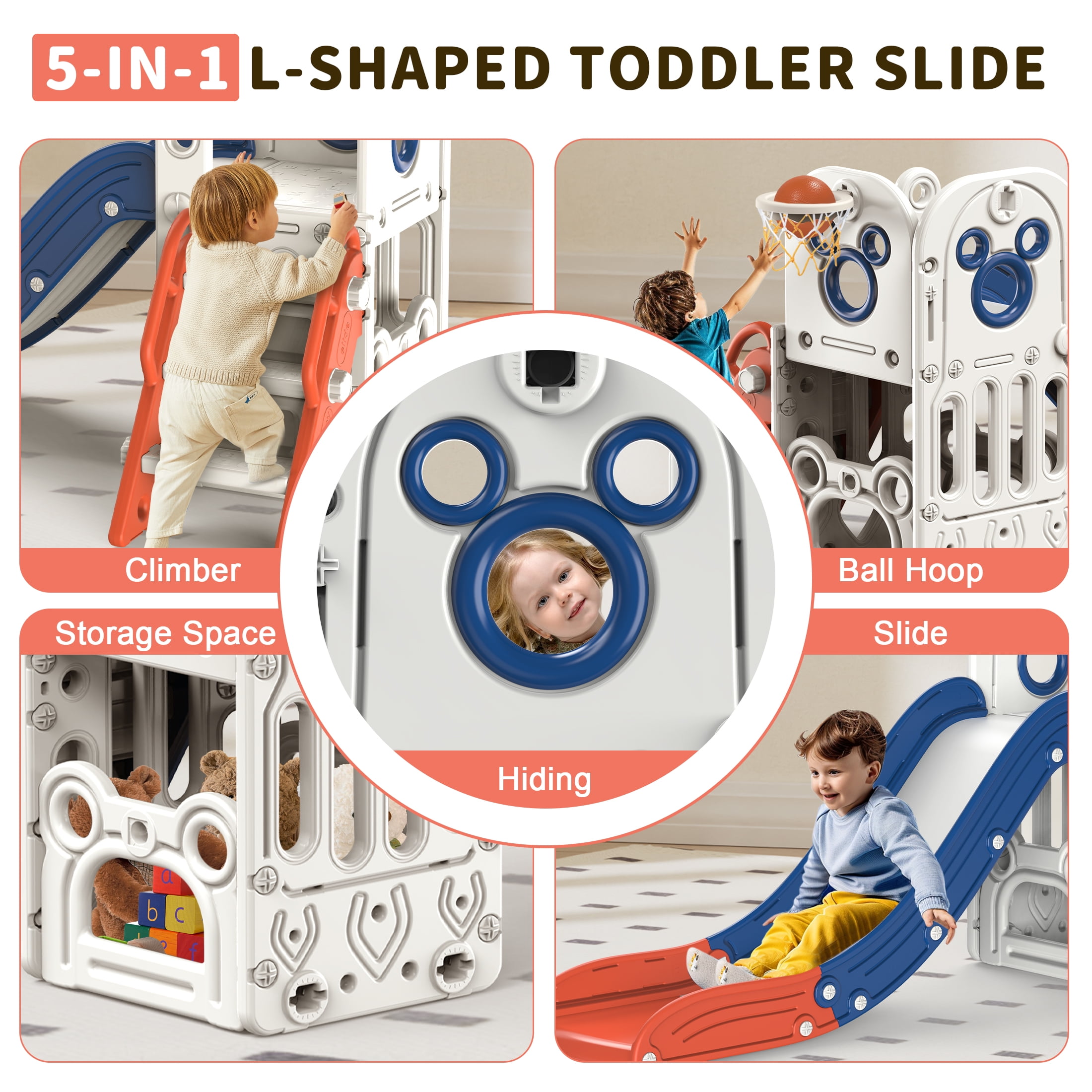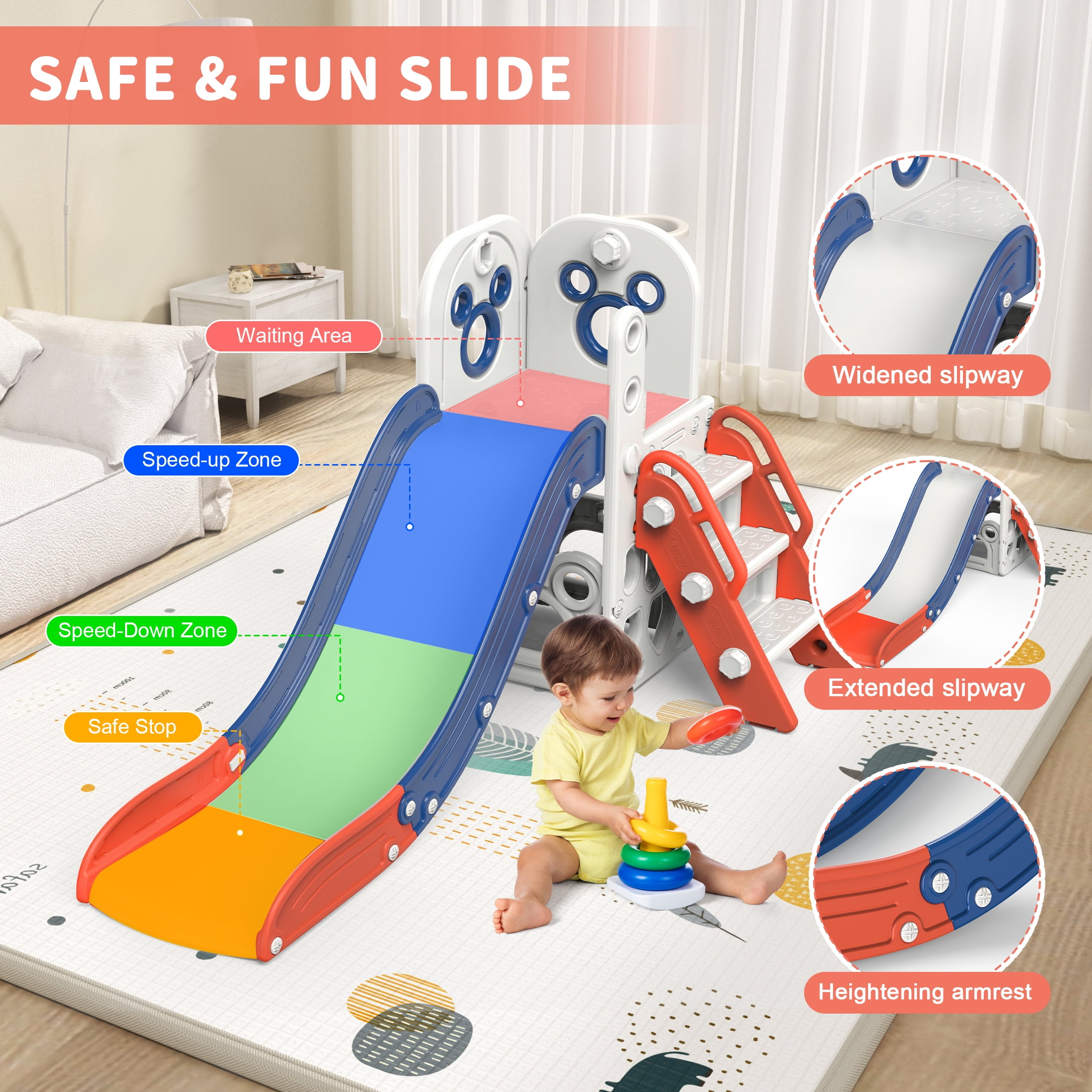 The Zifadola Sturdy Kids Slide is a versatile 4-in-1 playset that offers endless fun for toddlers aged 2-5 years. Zifadola Toddler Slide is made with durable and safe odor-free HDPE materials, that is safe for kids to play on and has a weight capacity of up to 110lbs. Our Kids slide has 4 activity areas, plus a storage space, including stairs, slides and shoot a basket area. It is also perfect for indoor or outdoor use and can be easily assembled and disassembled without the need for any tools. The baby slide features enclosed staircase design and wide steps that make it easy for toddlers to climb up and slide down safely. It also has smooth edges and rounded corners that protect todder from injuries while playing. Additionally, the toddler slide has a stable base that prevents it from tipping over during playtime. This engaging toddler slide is the perfect gift to help your little one develop their motor skills and enjoy hours of active play, so that children have fun and parents are more at ease.