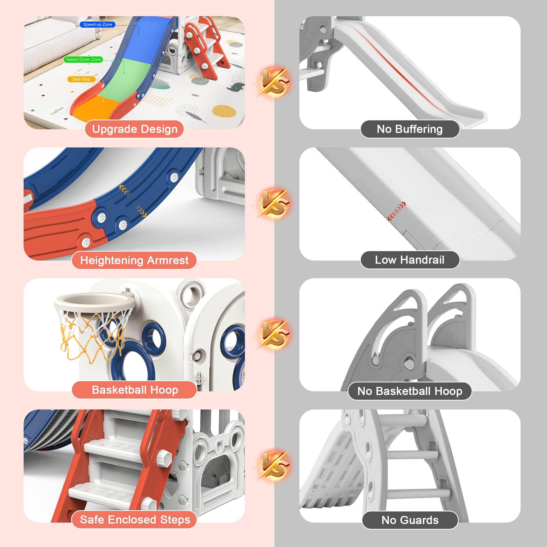 ✅4-1 Toddler Slide – Our kids slide comes with exciting slide, a storage space, roomy aisles, safety climber, funny basketball and basketball hoop. Features up to 4 different ways for your kids to explore. Our kids slide not only provides children with joyous playtime but also helps them develop and enhance their motor skills during play. ✅ Special Design – Toddler slide indoor is designed with 3 slide areas: acceleration area, deceleration area and buffer zone. The spacious pre-sliding area ensures that children can pass safely. Enclosed steps with anti-slip patterns prevent children’s feet from slipping or getting stuck, reducing the risk of tripping or falling. Guardrails on both sides of the widen slide and widen climber enhance safety. ✅ Safety HDPE Material – Our indoor&Outdoor toddler slide is made of high-density and durable HDPE material, ensuring it’s non-toxic, odorless, and capable of withstanding the tear and wear of everyday use. All Zifadola toddler slide are rigorously ASTM certified to ensure children’s safety. The baby slide can support up to 110 lbs, suitable for almost all toddler to play on. ✅ Indoor&Outdoor Toddler Toys – The slide for toddlers age 2-5 is easy to assemble and disassemble, no more tools needed. The assembly simply requires fastening the various parts together. Installation typically can be completed within a few hours. Please note: We recommend securely fastening each screw and checking the stability of the slide every week to ensure safe use for children. ✅Perfect Gift for your Kids – The toddle slide is a perfect gift for children. With this gift, children can enjoy a variety of play styles, experience different joys, and develop physical coordination, balance, climbing skills, and confidence in exploring various activities. We believe your child will absolutely love this gift.