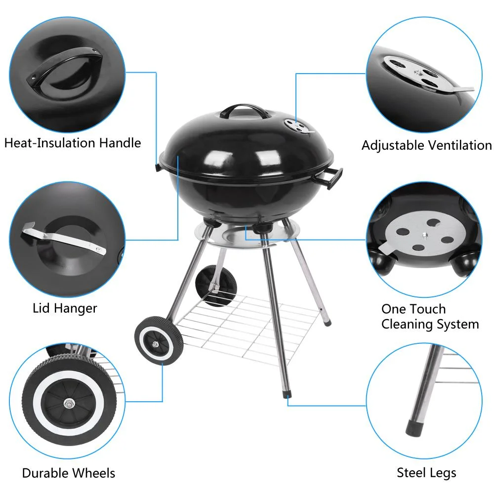 Feature HIGH QUALITY:Made of high quality galvanized steel, no rust, no corrosion, fine workmanship and durable EASY TO USE & CLEAN:The ash leak under the bowl and the ash catcher become the best choice to be one-touch cleaning system. You just need to rotate the ash leak to move the ash down into the ash catcher for easy ash disposal and cleaning. The durable wheels make this charcoal BBQ grill to be easy to move and transport for outdoor picnic tailgate camping. PORTABLE CHARCOAL GRILL:This product uses a spherical design, multi-function oven, because of its small footprint, it can save space, so it can be easily carried anywhere and enjoy cooking. PERFECT HEAT CONTROL & RETENTION:Air vents of charcoal barbecue grills lid adjusts for maximum heat control. EASY TO ASSEMBLE & PERFECT GRILLING:This portable charcoal barbecue grill is easy to assemble with step by step instruction. The thick grilling bowl and lid with porcelain-enameled coating provides precise heat retention for grilling tastier food. Just adjust the air vent damper to any grilling condition you’d like. You will love superior smoky flavor and then enjoy your wonderful meal of filet mignon, burgers, steaks, chickens, chop, turkey, summer squash, onion, asparagus, and shrimp. Specification: Size: 18-Inch Charcoal Grill Material: Steel Fuel Type: Charcoal Cooking Height: 60cm / 23.6 Inches Firebowl Size: Dia 46.5cm / 18.3 Inches Lid Size: Dia 47cm / 18.5 Inches Cooking Grid: Dia 44cm / 17.3 Inches Thickness Of Material: 0.4mm Package Includes: 1 x 18-Inch Charcoal Grill 1 x User Manual