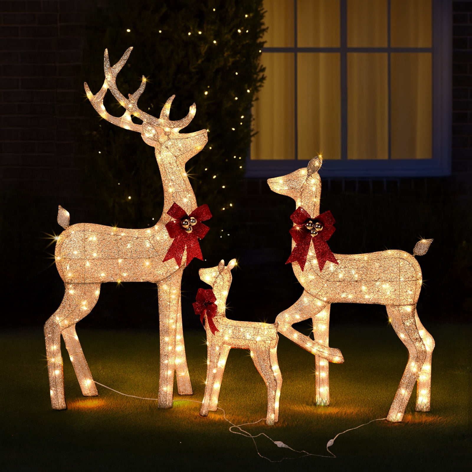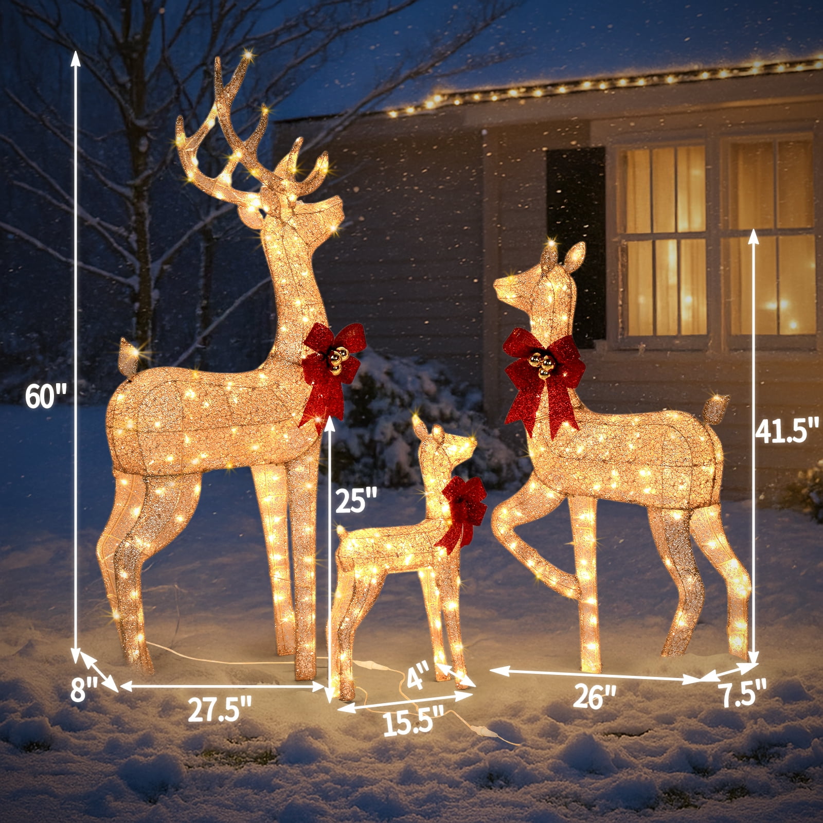 Introductions: Enhance the festive charm of your outdoor space this Christmas season with our Zimtown Outdoor Yard Decoration Set. This set includes three adorable reindeer figures that will surely capture everyone’s attention. Each reindeer stands at a height of 48in, making it an eye-catching addition to your yard. Specifications: 1. Material: Iron Frame, Cotton Thread, Gold Powder, Plastic Decorative Knot 2. Color: White 3. Male Deer Dimensions: (47.24 x 23.62 x 7.87)” 4. Doe Dimensions: (36.22 x 25.2 x 5.91)” 5. Fawn Dimensions: (23.62 x 4.72 x 13.39)” 6. Adapter Parameters: Power 3.6w, Voltage 30v, Current 0.2A 7. Number Of Light Strings: 60 Lights For Fawn; 90 Lights For Doe; 120 Lights For Male Deer Package Includes: 3 x Disassembly Type Elk 1 x 120V Adapter 1 x Power Cord 12 x Ground Spikes 9 x Cable Tie 4 x Foot Support Rod Light String Inside Deer Body