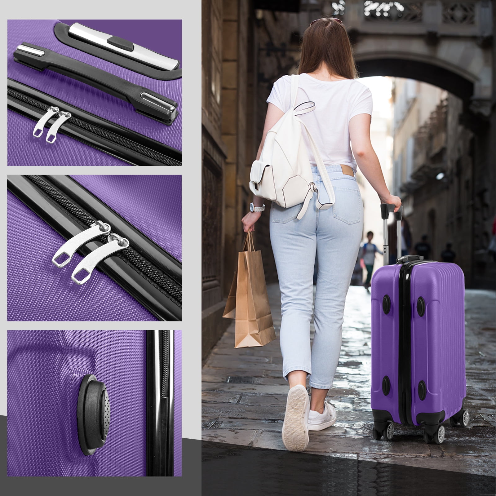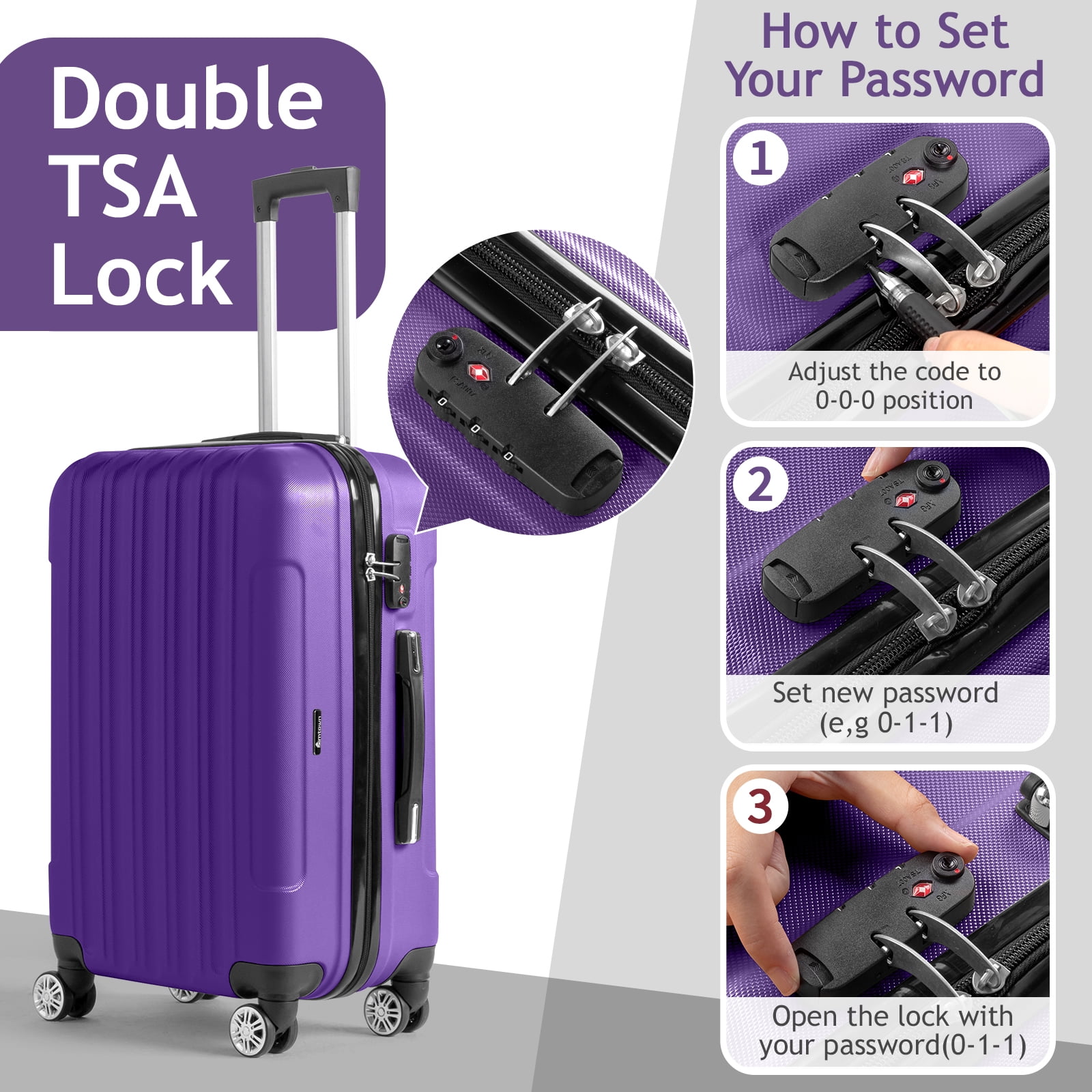 [TSA Approved Lock & Durable Zipper]: A 3-digit TSA lock is installed on the side of hardsided luggage to protect your personal property security. The lock is safe and reliable, and the zipper can withstand high impact and pressure from sharp objects [3-Stage Telescopic Handle]: Easy-to-grip handles on top and sides and retractable (three-section) trolley metal rods. Our suitcase passed the drop test, the load-bearing test perfectly. To ensure that easy movement and comfort. [360°Double Spinner Wheels]: Our luggage set has double wheels that rotate in multiple directions, making it very smooth and quiet when moving. Each suitcase has four molded side legs to provide stable side standing when the suitcase is stored. [Sturdy & Durable Material]: Crafted from premium, ultra-strong ABS material, our Top Quality Hardshell Luggage offers superior durability, a lightweight feel, and enhanced impact resistance. Its textured finish is designed to fend off scratches, ensuring your luggage maintains its pristine appearance even after the most rigorous travels. [After-Sales Warranty]: Includes 1-year manufacturer’s warranty. Feel free to contact us for any issues in purchasing, we are happy to serve you.