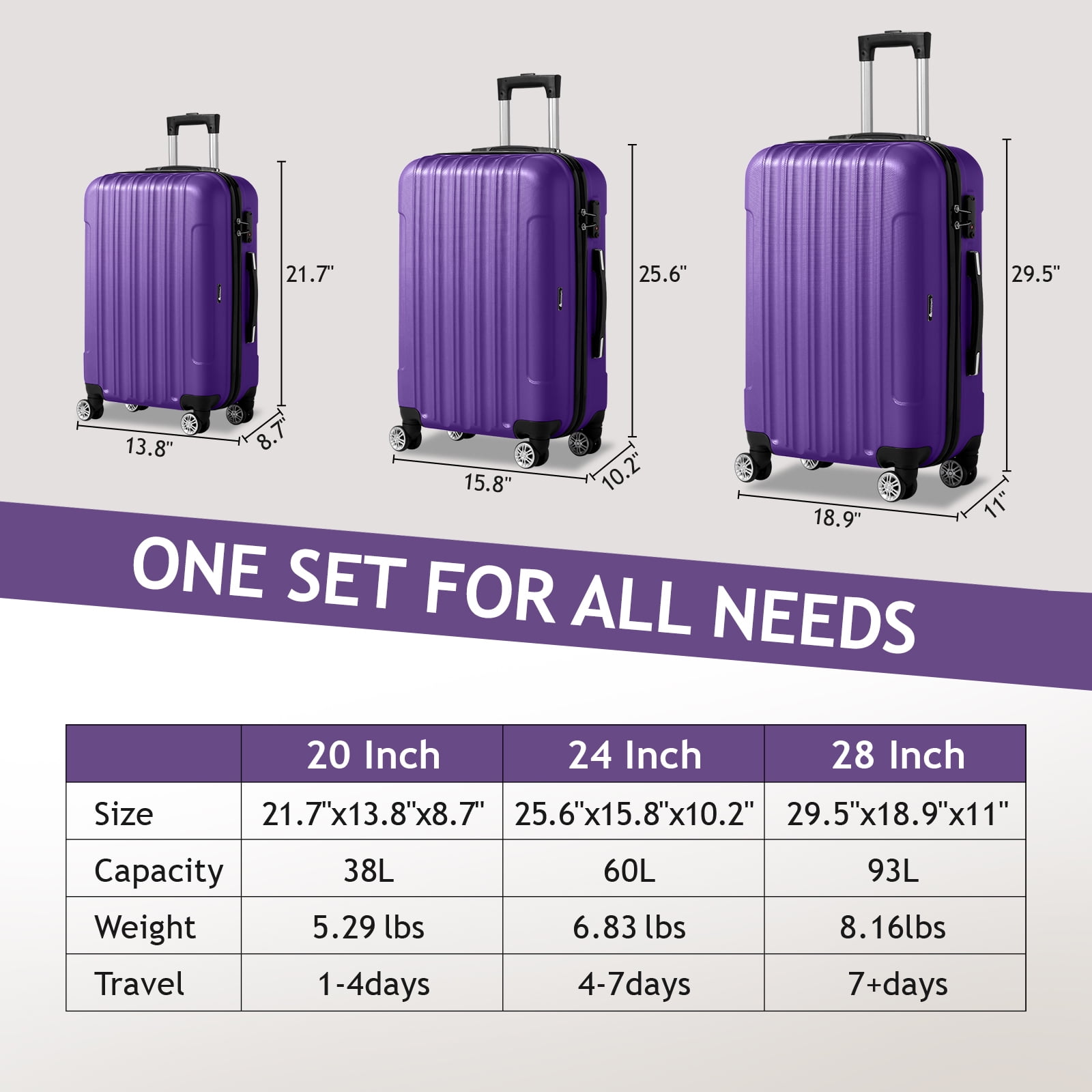 Features: Lightweight enhanced ABS material ensures long-lasting usage and durability. Smooth 360° spinner wheels for impressive mobility and maneuverability. Top and side carrying handles available. Large storage space and fully lined interior with zippered compartment to keep your items organized. Make sure your belongings are secured in the luggage during the entire journey with the 3-digit combination lock. Luggage Set is sure to make your reliable companion on both stress-free vacation and business trip. 3 Pcs luggage set to accommodate all your traveling needs. Following sizes of suitcase are included: 20 inches, 24 inches and 28 inches. The complete 3 piece suitcase set will be shipped with each suitcase inside one another to save space for your convenience. Specifications: 1. Material: ABS 2. Color: Purple 3. Weight: 317.47oz / 9000g 4. Size Of Type 20″”: (8.66 x 13.78 x 21.65)”” / (22 x 35 x 55)cm (L x W x H), 5.29 lbs / 2.4kg 24″”: (10.24 x 15.75 x 25.59)”” / (26 x 40 x 65)cm (L x W x H), 6.83 lbs / 3.1kg 28″”: (11.02 x 18.9 x 29.53)”” / (28 x 48 x 75)cm (L x W x H), 8.16 lbs / 3.7kg Package Includes: 3 x Luggages