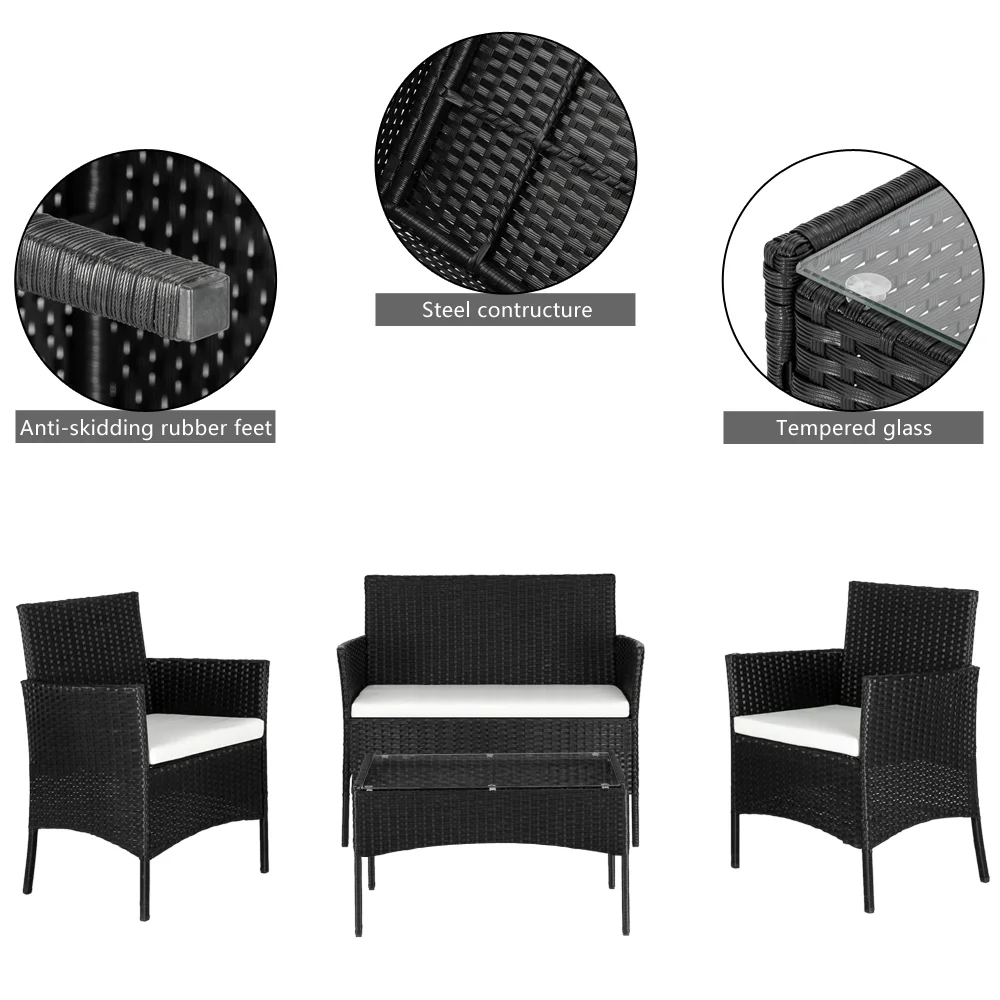 Features: Upgraded Comfort of Chair: The armrest and backrest are designed in curved shape and they will protect and relax your back and arm. Sturdy & Durable Structure: The frame of our furniture set is constructed of strong iron, which ensures sturdiness and stableness of the set. Comfortable Cushion with Washable Cover: Equipped with high elasticity and padded cushions, the seat is really comfortable to sit on and you won’t feel tired even if you sit for long time. Easy toClean: Even the cover is dirty, it is convenient to be taken off with zipper and be cleaned by machine or hand. Specifications: 1. Material: PE Cane Iron Polyester Cloth Upright Cotton 2. Color: Black 3. Cushion Fabric: Polyester 180g White 4. Upright Cotton: 1000g 5. Glass: 5mm Thick Tempered Glass 6. Rattan:8.5×1.1PE Rattan (Black Four-Thread Rattan) 7. Single Chair: (23.03 x 21.26 x 32.28)” / (58.5 x 54 x 82)cm(L x W x H) 8. Double Chair: (39.76 x 21.26 x 32.28)” / (101 x 54x 82)cm(L x W x H) 9. End Table: (27.95 x 16.14 x 15.35)” / (71 x 41 x 39)cm(L x W x H) 10. Total Weight: 51.26lbs / 23.25kg Package Includes: 2 x Single Chair 1 x Double Chairs 1 x Tea Table 2 x Single Seat Cushions 1 x Double Seat Cushions 1 x Glass