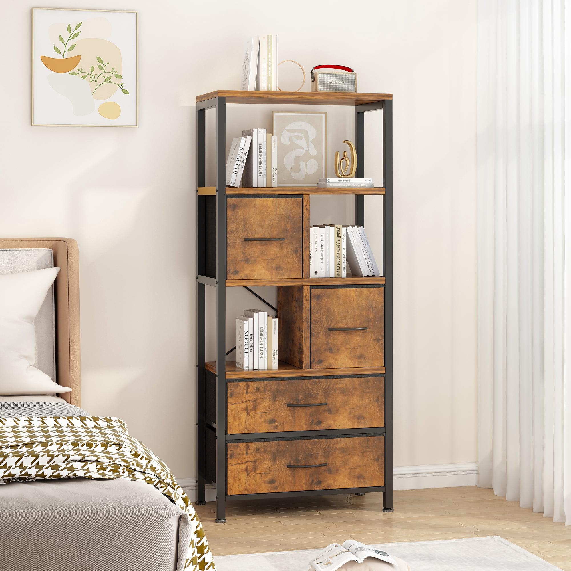 Zimtown 5-tier Iron Bookcase with 4 Drawers, Free Standing Bookshelf Storage Organizer Display shelf with Metal Frame, Brown