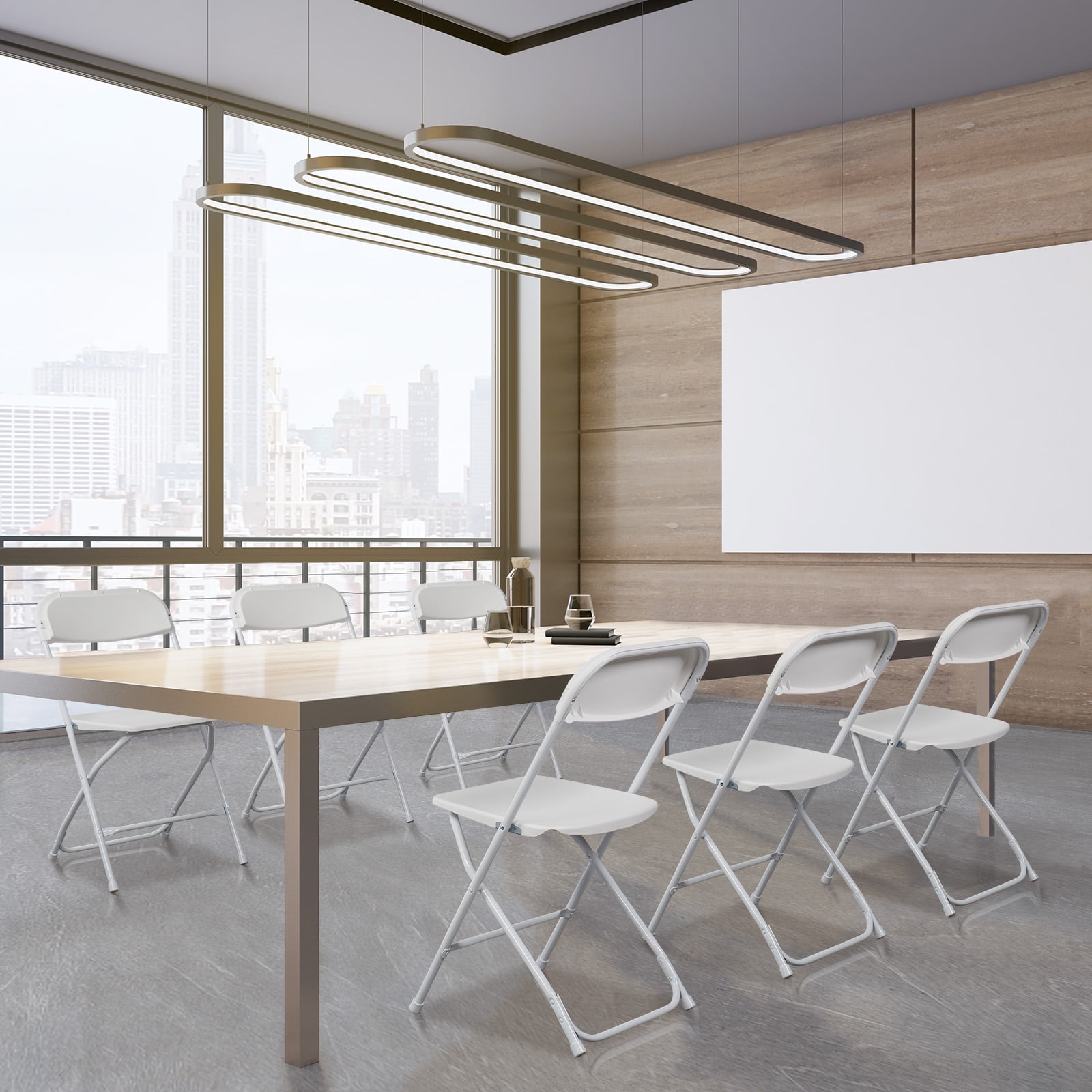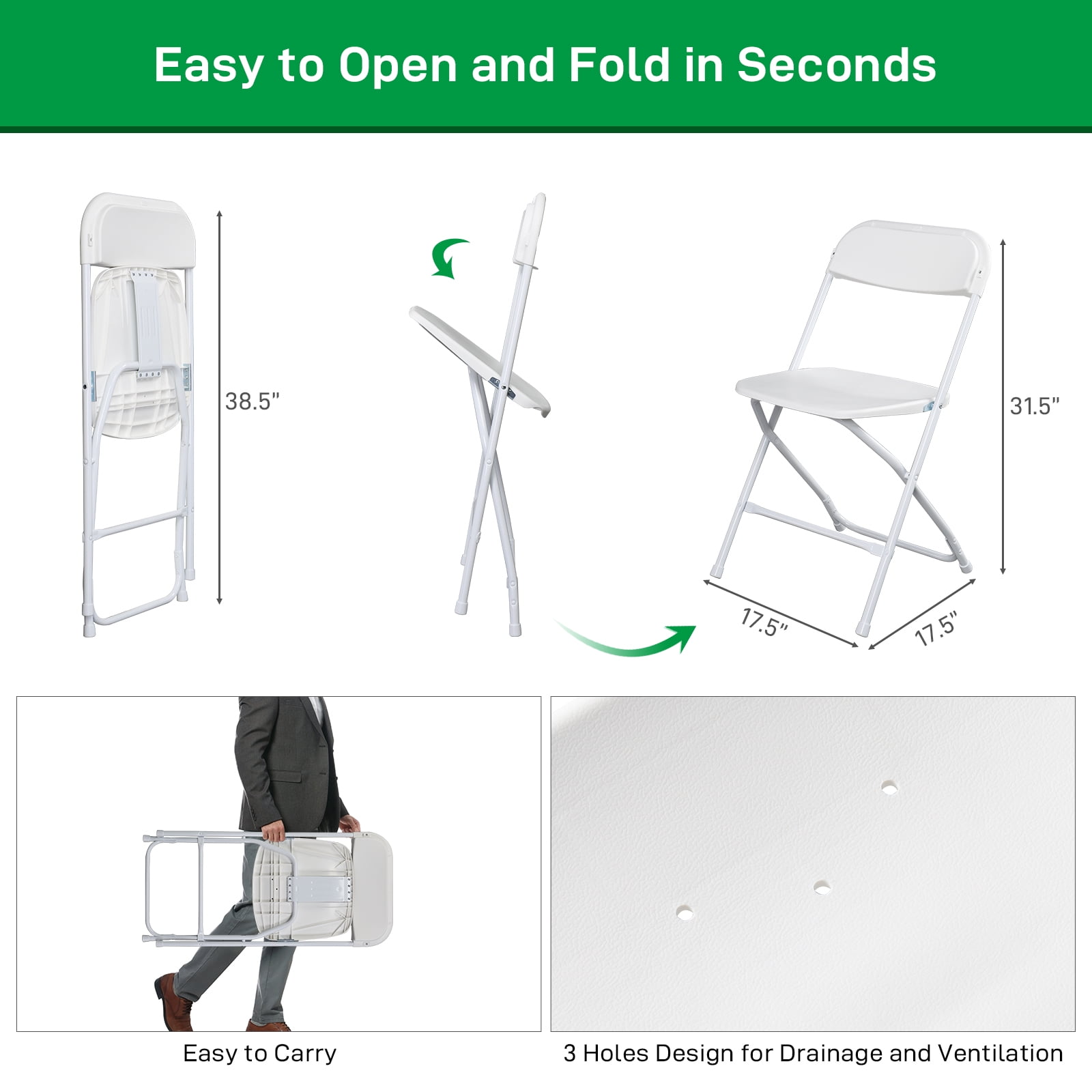 Features: Space-saving Design: Folding, stacking, and locking upright design helps make storage of these chairs almost effortless Sturdy Chairs: Recommended by event planners/organizers which assures weather resistance to rusting, chipping, or cracking. With non-marking floor caps that won’t leave marks or scratches on your floor Multiple Uses: An economical choice for casual affairs or whichever occasion. Perfect for businesses, offices, churches, schools, government, banquet halls, game halls, and anywhere strong comfortable seating is needed Specifications: Material: Plastic Dimensions: (17.5 x 31.5 x 17.5)” / (44.5 x 80 x 44.5)cm (L x W x H) Color: White Seat Dimensions: (15.5 x 15.5)” / (40 x 40)cm (L x W) Seat Height from Floor: 17″ / 44cm Weight Capacity: 350 lbs Package Includes: 6 x Chairs