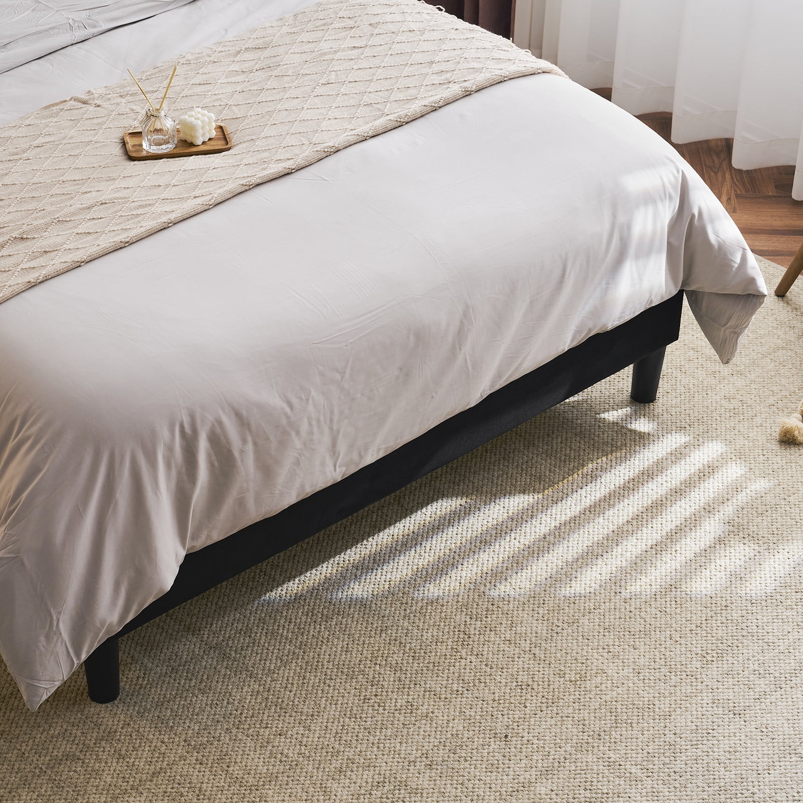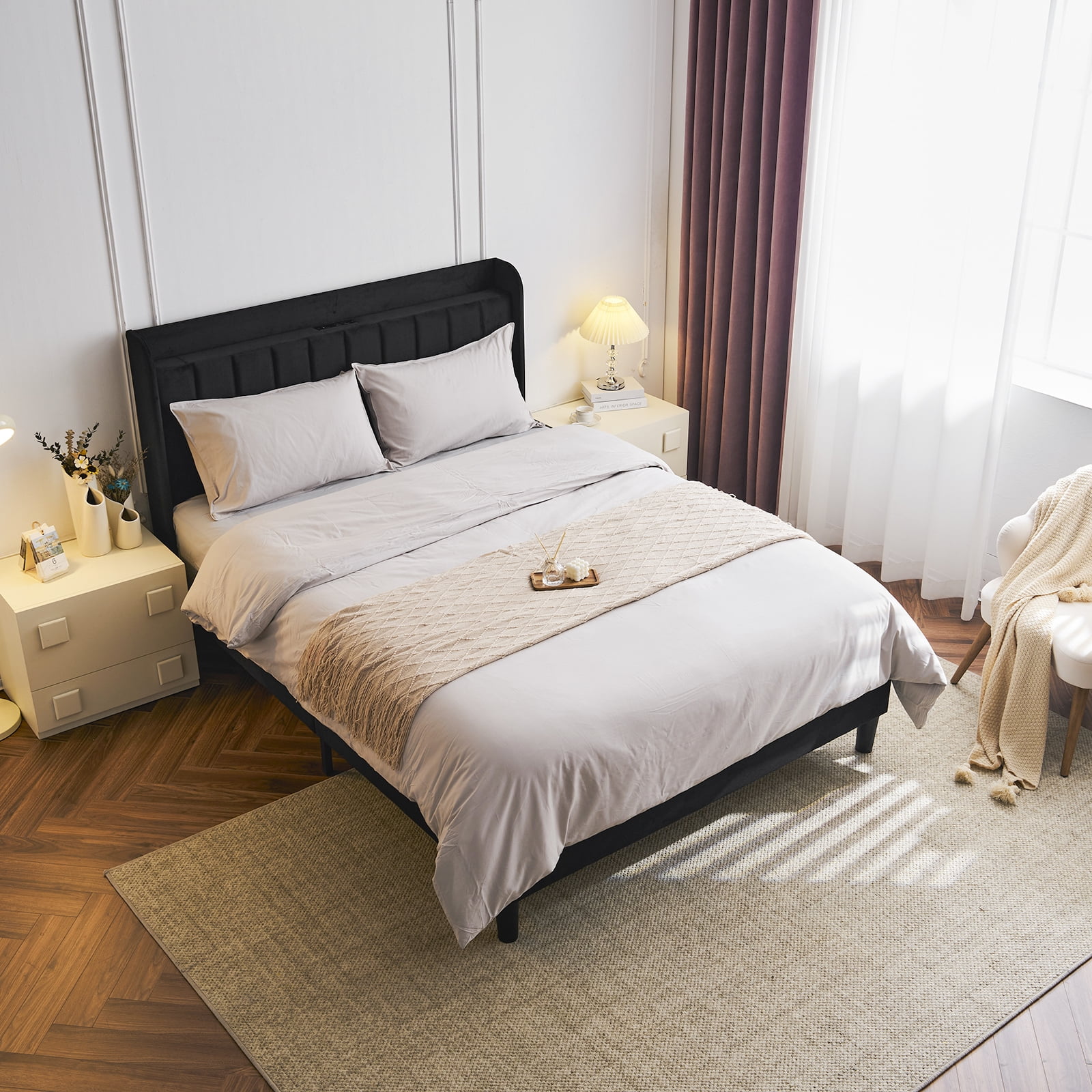Introductions: Transform your bedroom into a sanctuary of comfort and convenience with our Upholstered Platform Bed, where innovative design meets timeless elegance, ensuring a restful and rejuvenated sleep every night. This bed frame features a built-in charging station and a practical storage shelf, ensuring your essentials are always within arm’s reach. Features: 1. Convenient Charging Station: Standard plug sockets and USB ports are seamlessly integrated within the design, ensuring your electronic devices are always charged and within reach. 2. Smart Storage Solution: The thoughtfully designed storage area located above the headboard offers a secure and accessible space for storing essentials like phones, remotes, and glasses, keeping your personal items organized. 3. Luxurious Comfort and Style: The bed frame is crowned with a vertical channel tufted wingback headboard, wrapped in soft velvet and plush sponge, adding a layer of sophistication and comfort to your bedroom’s aesthetic. 4. Robust Construction: Constructed from high-quality metal and reinforced with center support legs, this bed frame provides a stable and durable foundation for your mattress. 5. Quick and Simple Assembly: Enjoy a hassle-free setup with our user-friendly assembly process, designed to get your bed frame ready in no time, without the need for a box spring, making it a convenient choice for modern living. Specifications: 1. Dimensions: (80.7 x 55.5 x 47.6) in / (205 x 141 x 121) cm (L x W x H) 2. Weight: 64 lbs / 29 kg 3. Color: Black 4.Age group: Teen, adult Package: 1 x Bed Frame(No mattress)