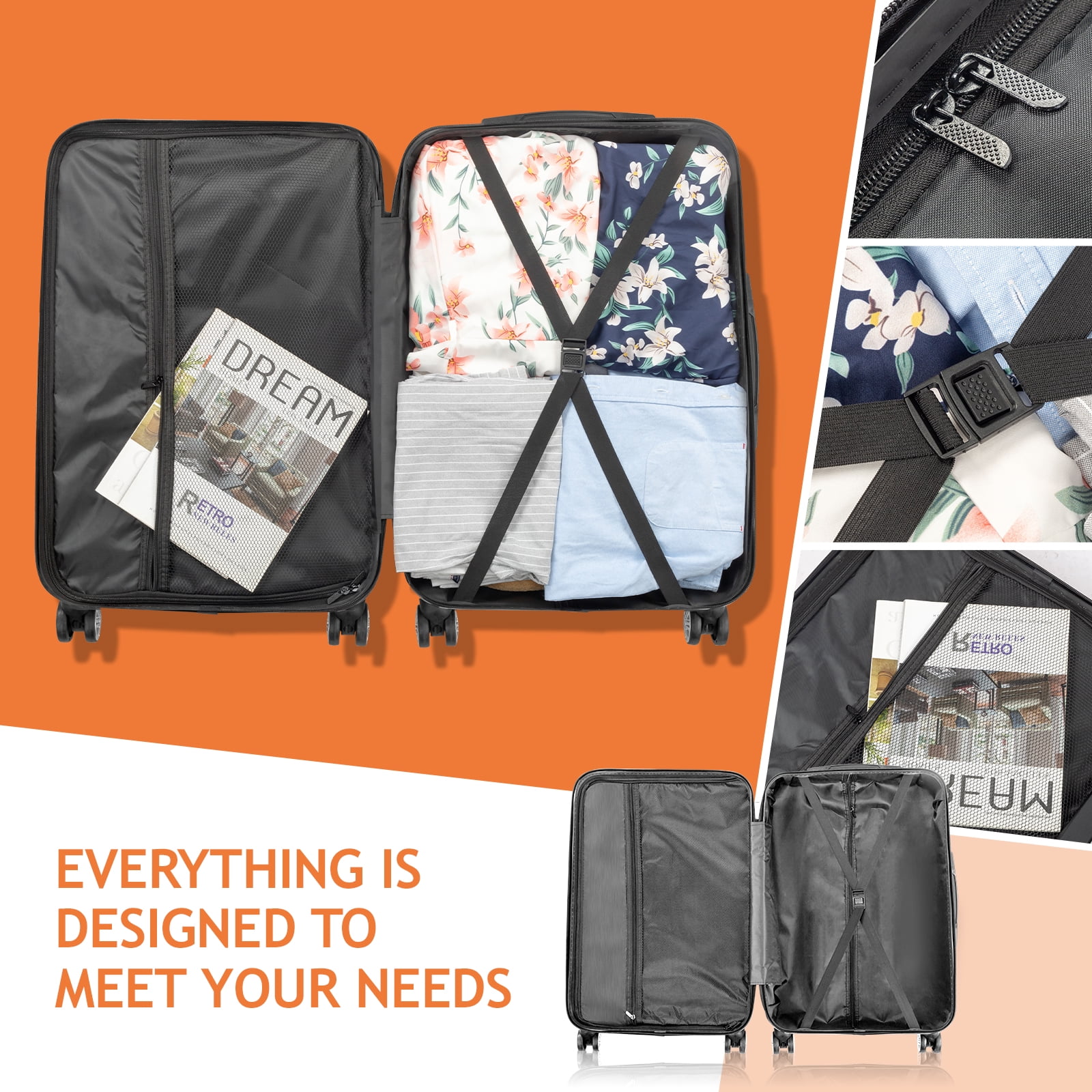 [Luggage Sets with TSA Lock]: Our Luggage Sets boast a TSA-approved lock for secure travel and a fully-lined interior divider for organized packing. The reinforced, upgraded zipper ensures durability, preventing drops and breaks for worry-free journeys. [Top Quality Hardshell Luggage Set]: Crafted with strong ABS for durability and versatility, the luggage is lightweight and built to last, while the addition of 2 corner protectors safeguards your belongings against damage. [Practical Internal Design]: The interior of the trip suitcases provide ample space that you can use to place anything you need to carry, such as clothing, documents, daily necessities, etc. What is more, the interior is equipped with a crossover strap to provide better protection for items during use. [Suitcase with Double Spinner Wheels]: The adjustable and sturdy aluminium 3-step telescopic handle is suitable for people of different heights, and with 360° double spinner wheels, it allows you to move quietly and smoothly on the journey. [Ergonomic Design for Handle]: Adjustable & sturdy ergonomic aluminum 3-step telescoping handle allow you to provide effortless movement with luggage. Smooth ups and downs for more comfortable rolling luggage.